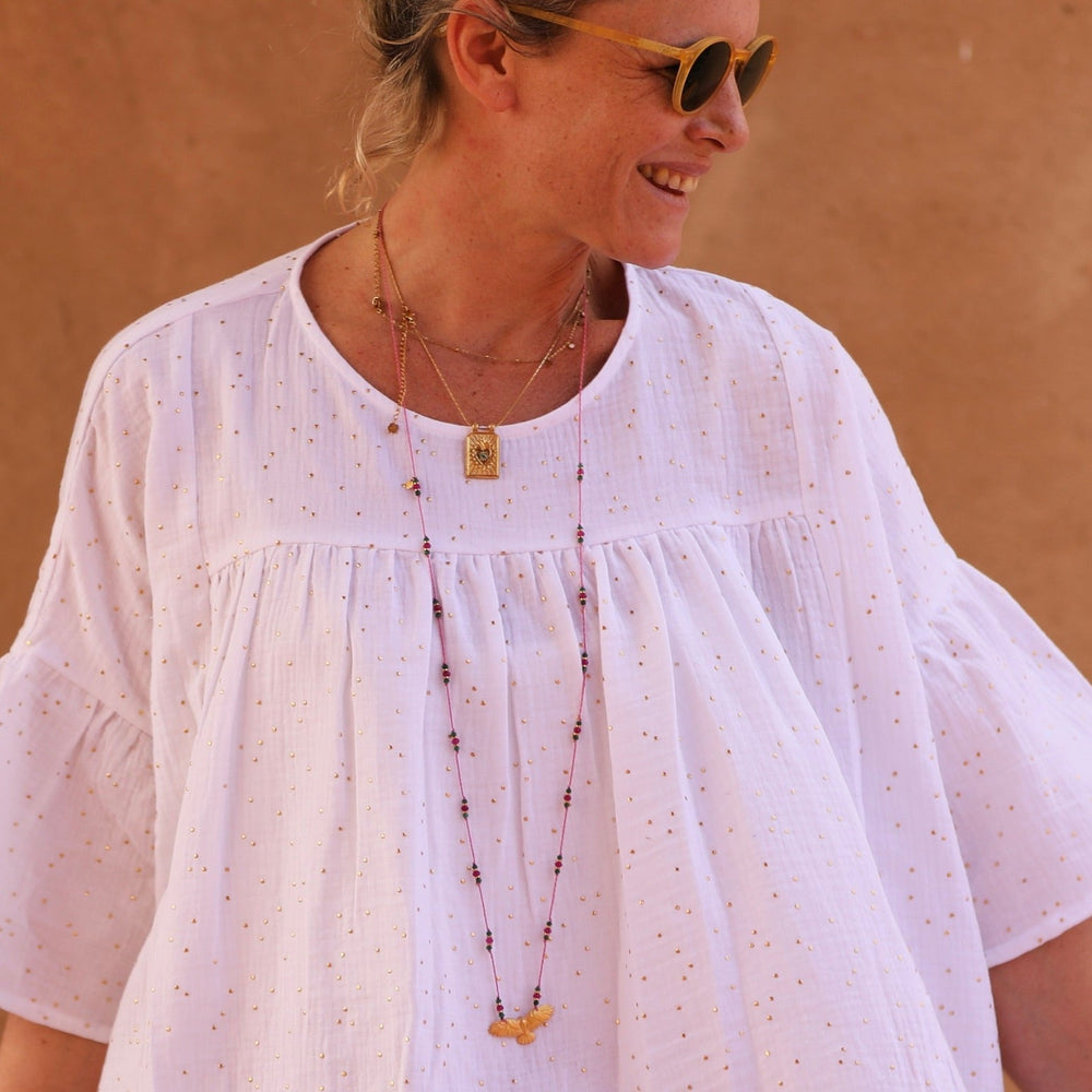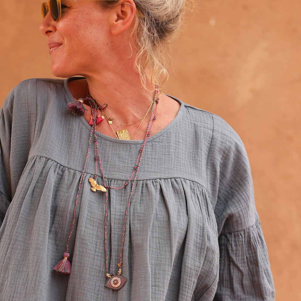 Impérial est un collier audacieux composé d’une longue cordelière tressée ornée de perles semi-précieuses, ponctuée de pompons aux extrémités. Son pendentif, en forme d’aigle, apporte une touche symbolique et majestueuse.