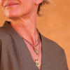 Le collier Rêverie se compose d'une chaîne alliant pierres semi-précieuses et perles en acier inoxydable, agrémentée d'un poisson émaillé aux teintes rose et vert.