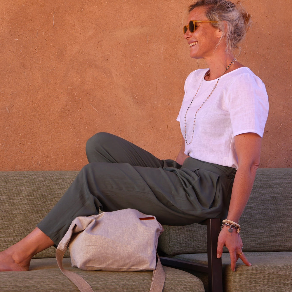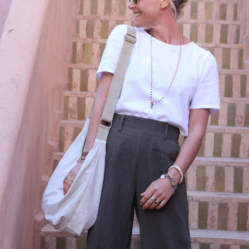 La bandoulière réglable en lin a été fabriquée dans le nord de la France, permettant de changer la longueur du sac facilement.