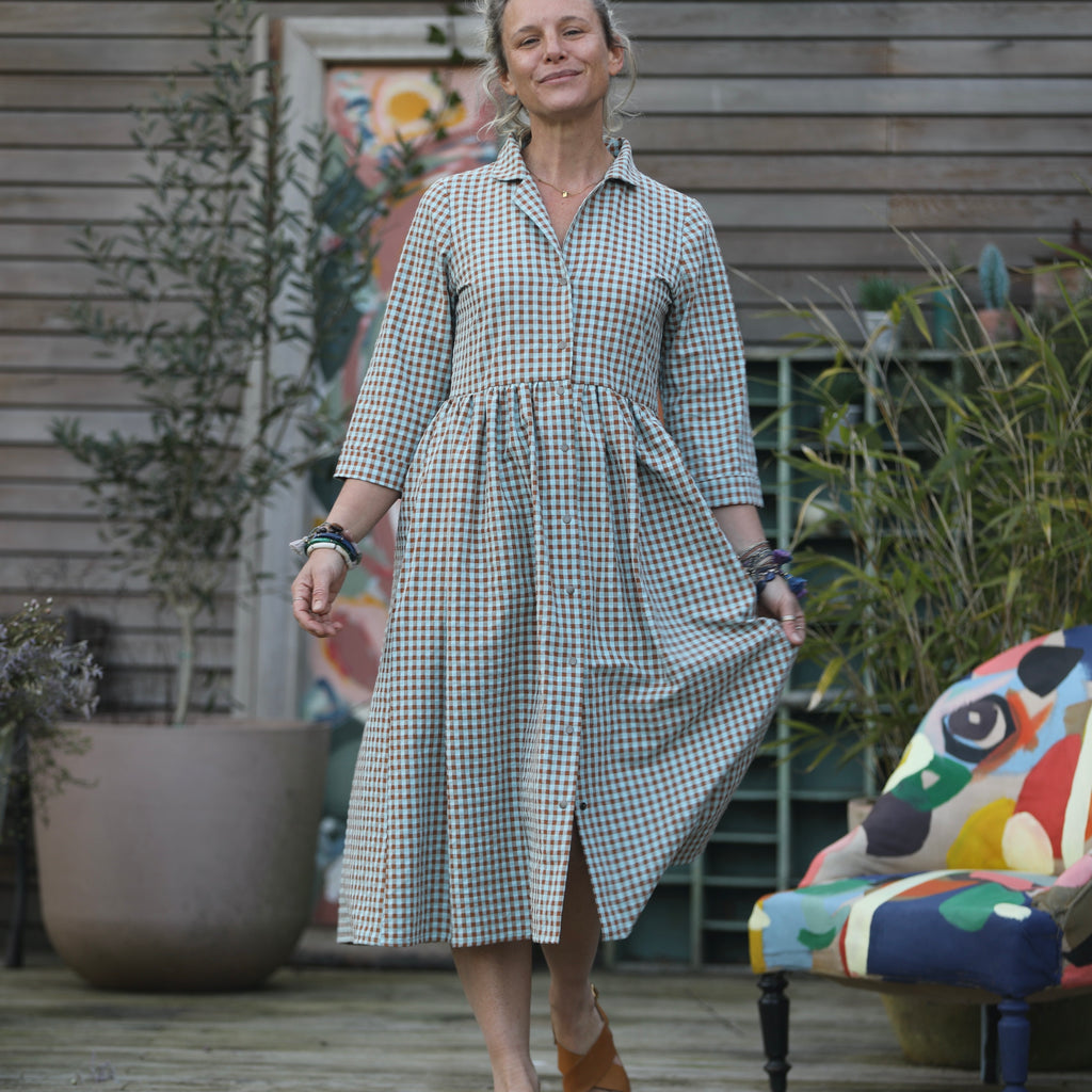 Robe Julia manches 3/4 seersucker vichy camel/ciel - 30 %