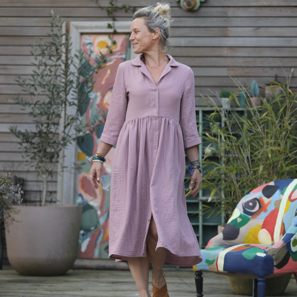 Robe Julia manches 3/4 - Gaze légère à double structure rose boisée - 30 %