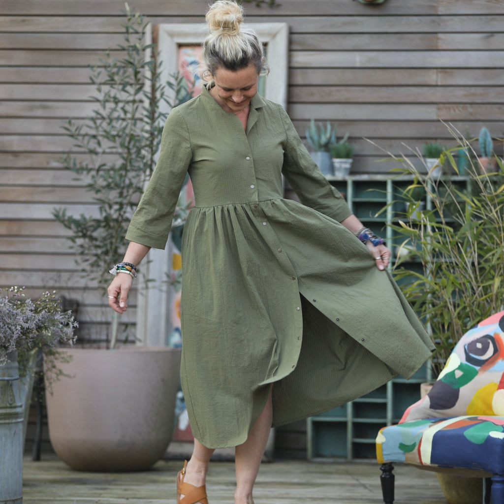 Robe Julia manches 3/4 seersucker kaki - 30 %