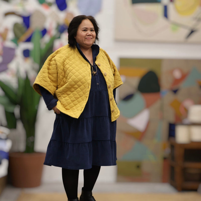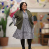 Son style se caractérise par une jupe à étages, offrant un volume généreux dans le bas, un col mao et des manches longues.