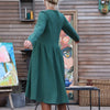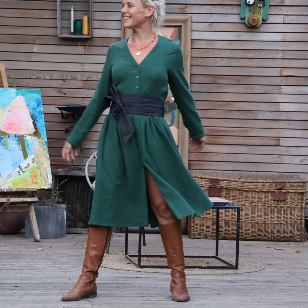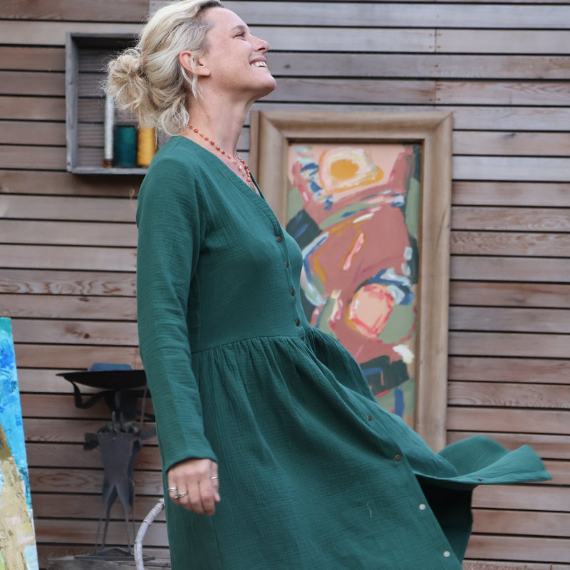 La robe Sia se distingue par son élégante coupe, mettant en valeur un décolleté en V flatteur, une ample jupe fluide, des boutons du haut jusqu'en bas offrant la possibilité d'ajuster l'ouverture selon vos préférences, ainsi que deux poches pratiques discrètement placées sur les côtés