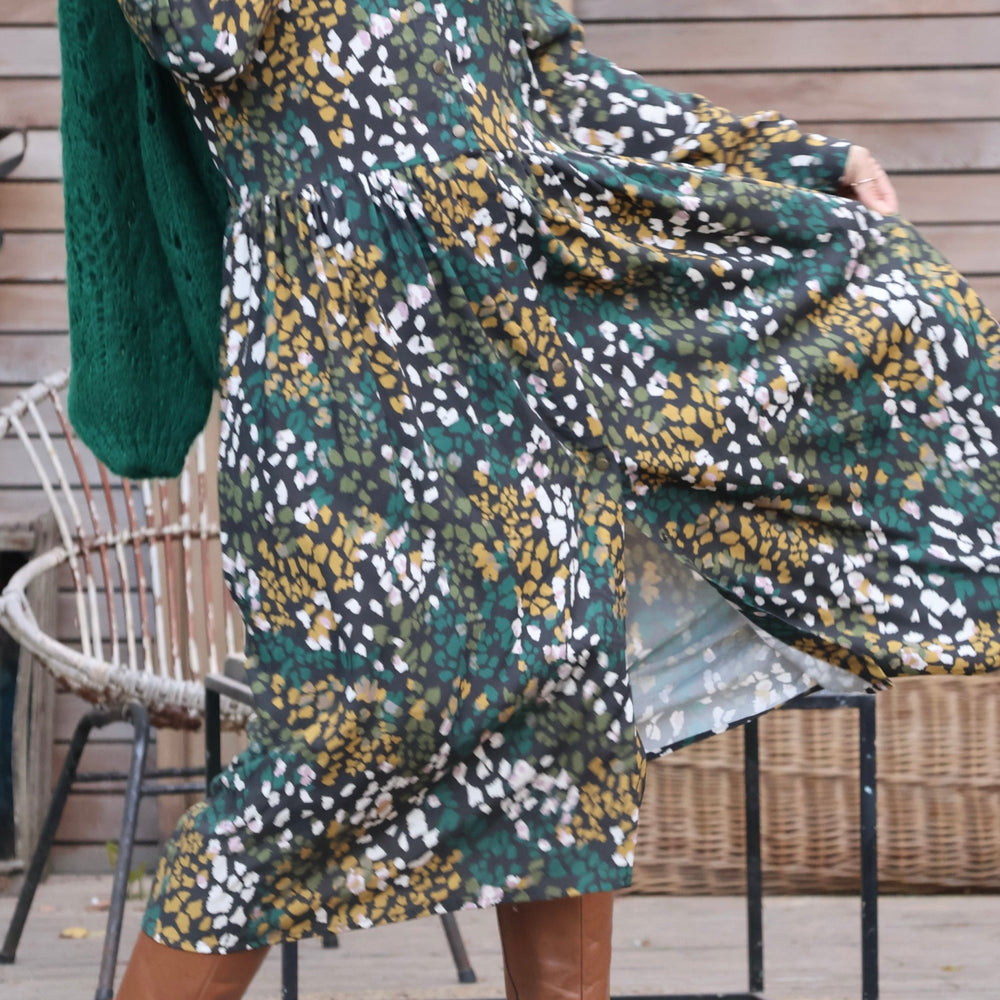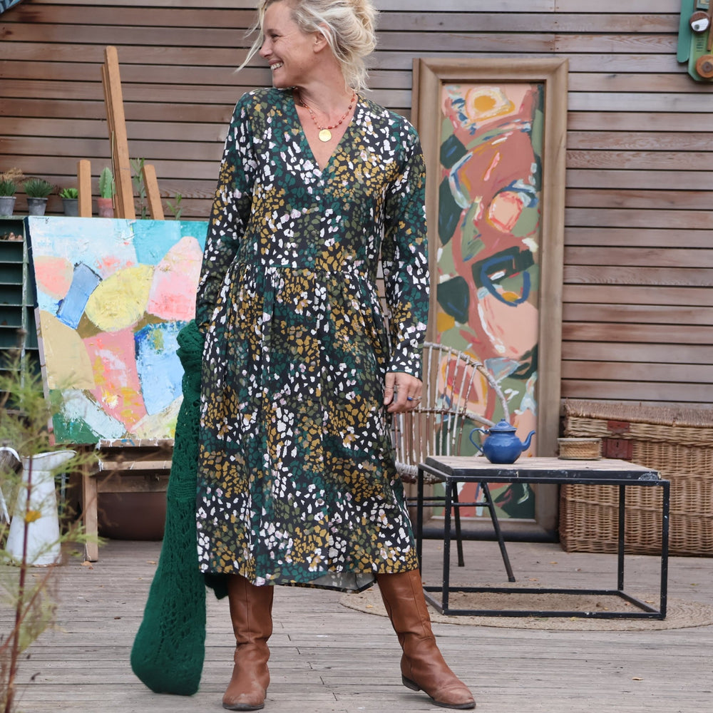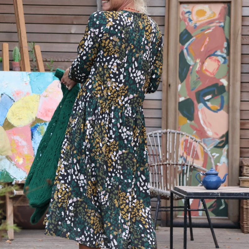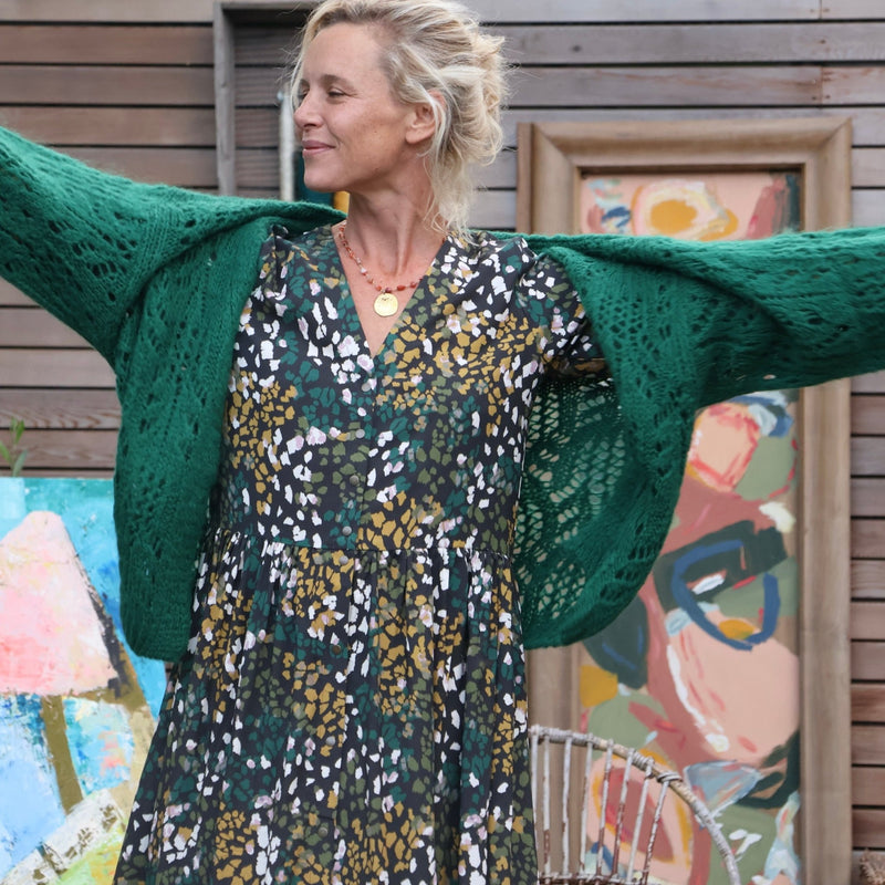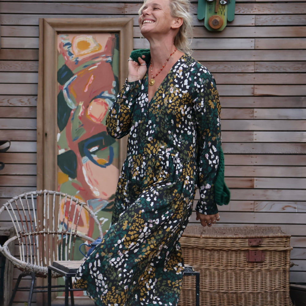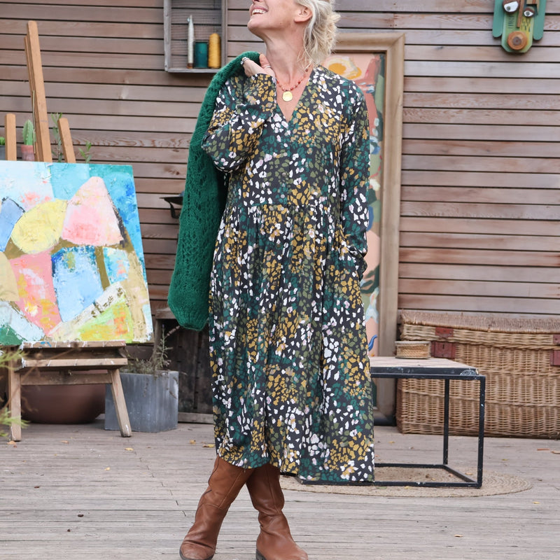 La robe Sia se distingue par son élégante coupe, mettant en valeur un décolleté en V flatteur, une ample jupe fluide, des boutons du haut jusqu'en bas offrant la possibilité d'ajuster l'ouverture selon vos préférences, ainsi que deux poches pratiques discrètement placées sur les côtés.