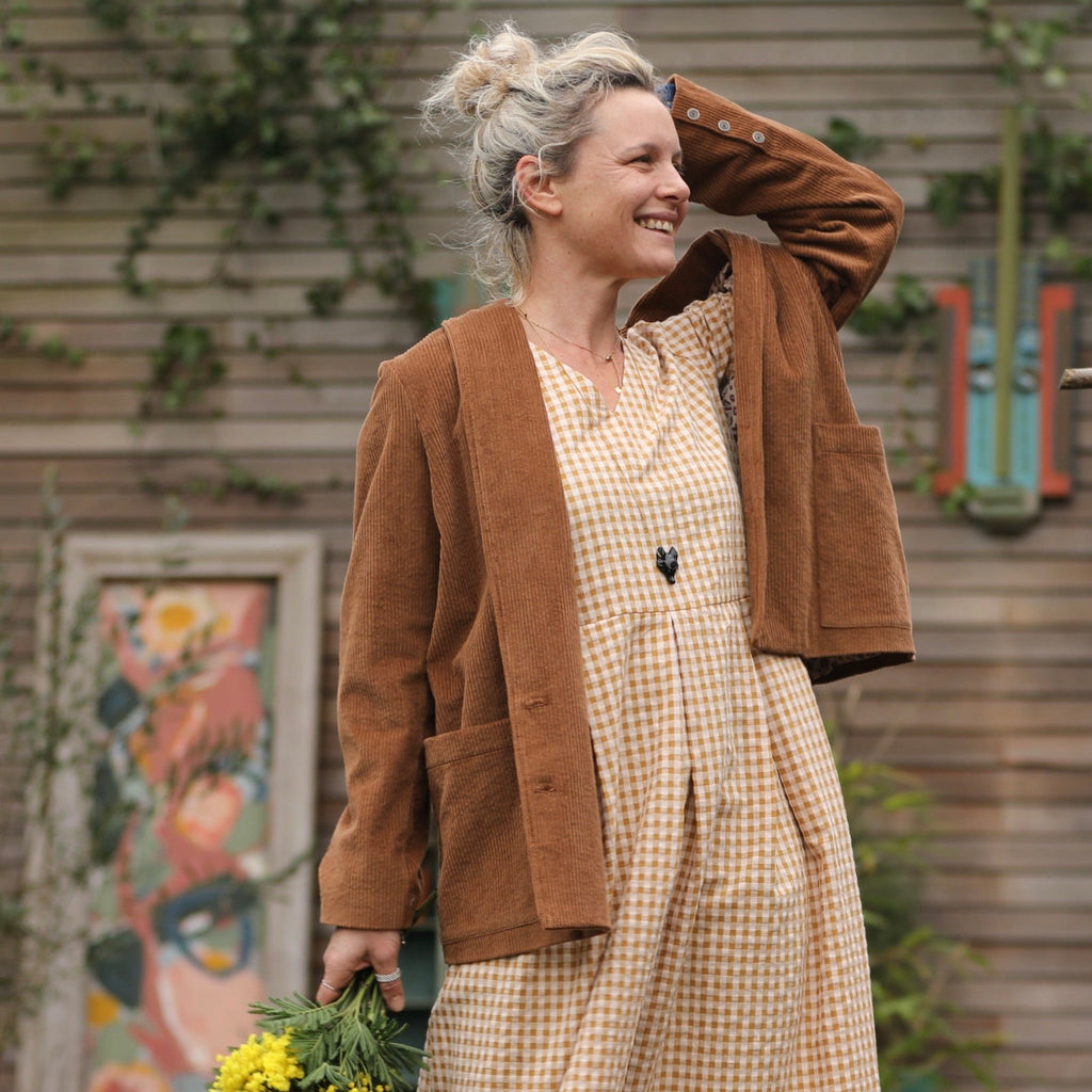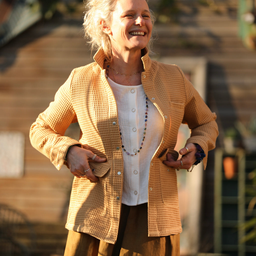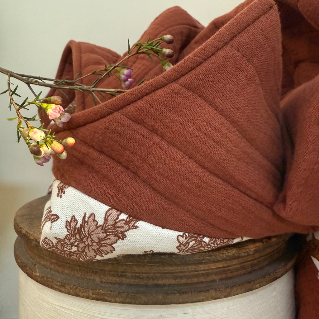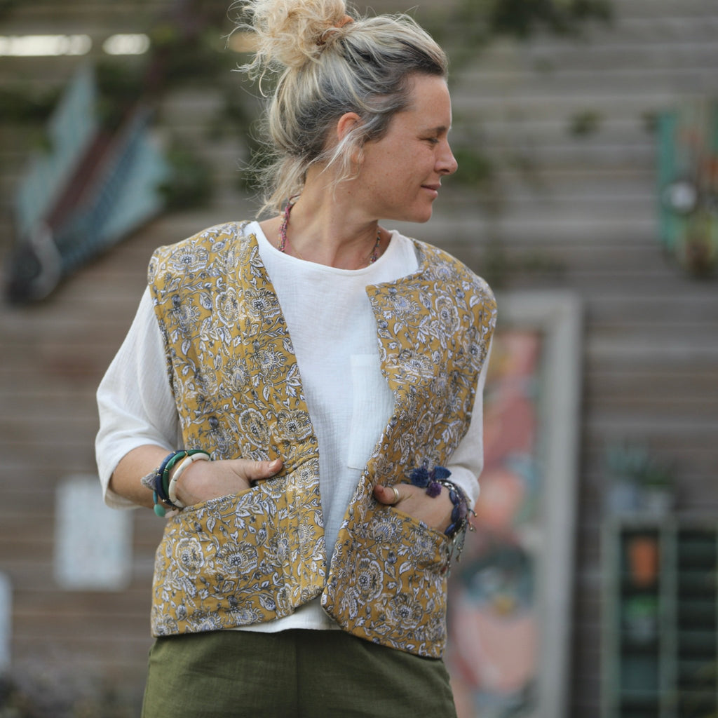 Gilet Basile matelassé en double gaze de fleurs ocrées