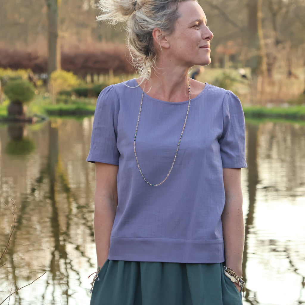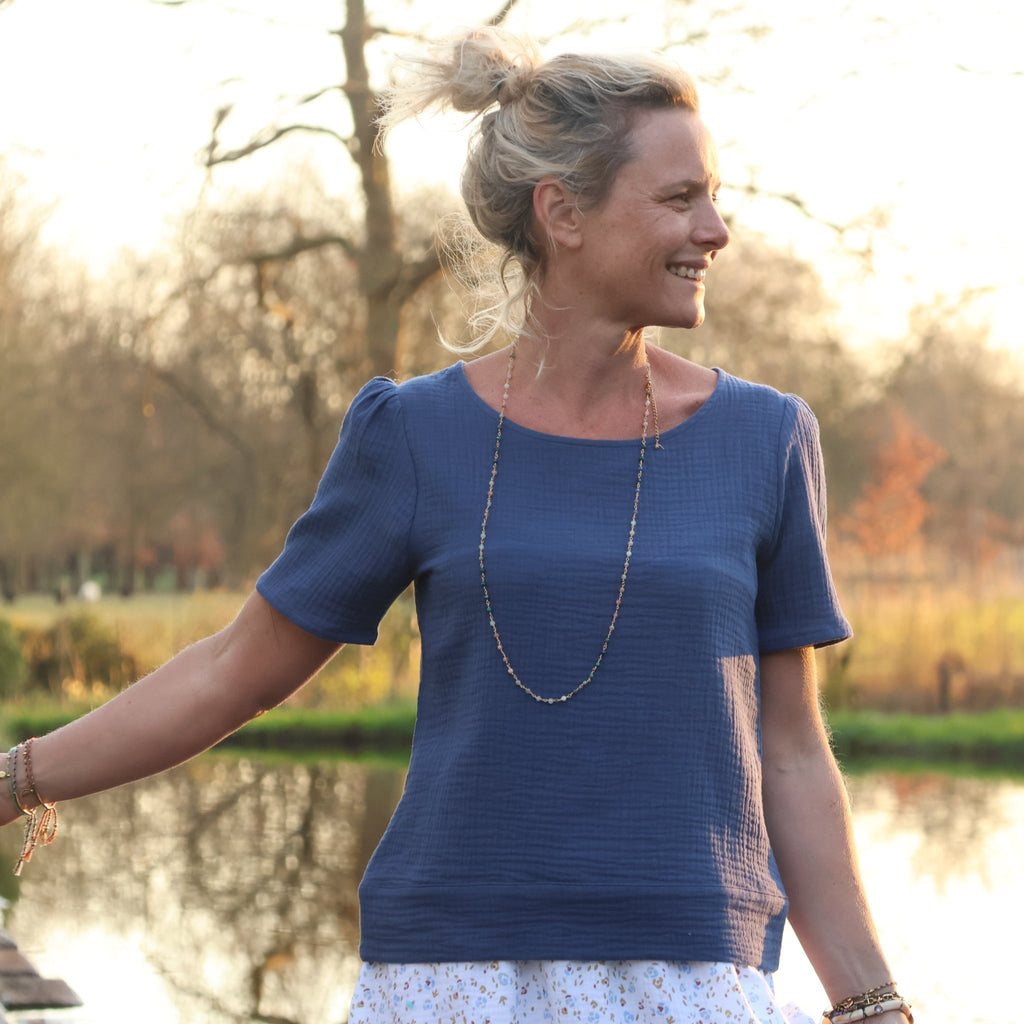 Blouse Eulalie col rond - manches courtes- double gaze de coton indigo Épuisé