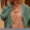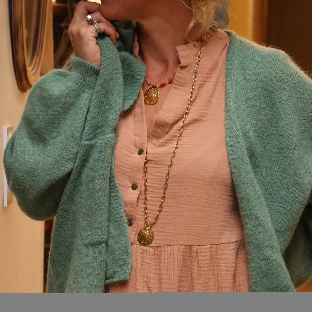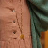 Le collier Symphonie apporte une note d'élégance à vos tenues, grâce à sa chaîne longue de 90 cm et à son maillon distinctif, marqué par une texture cabossée.