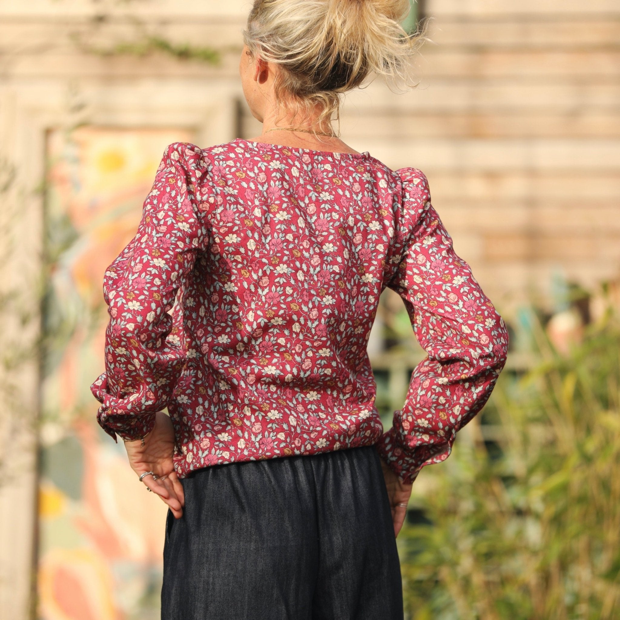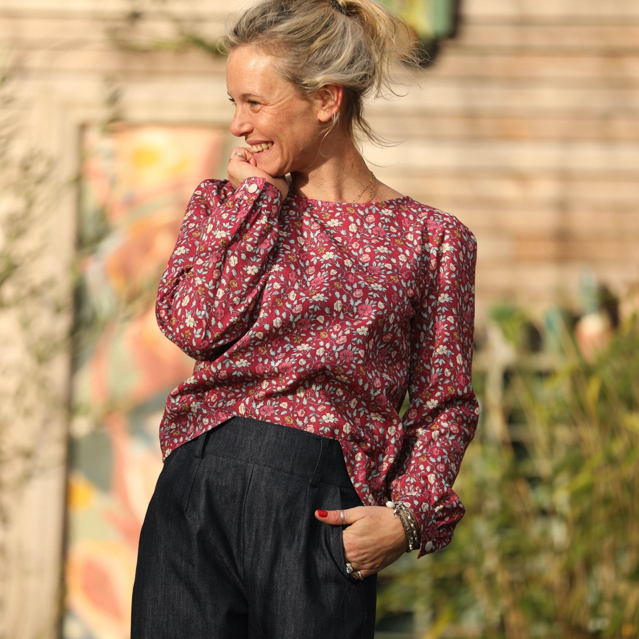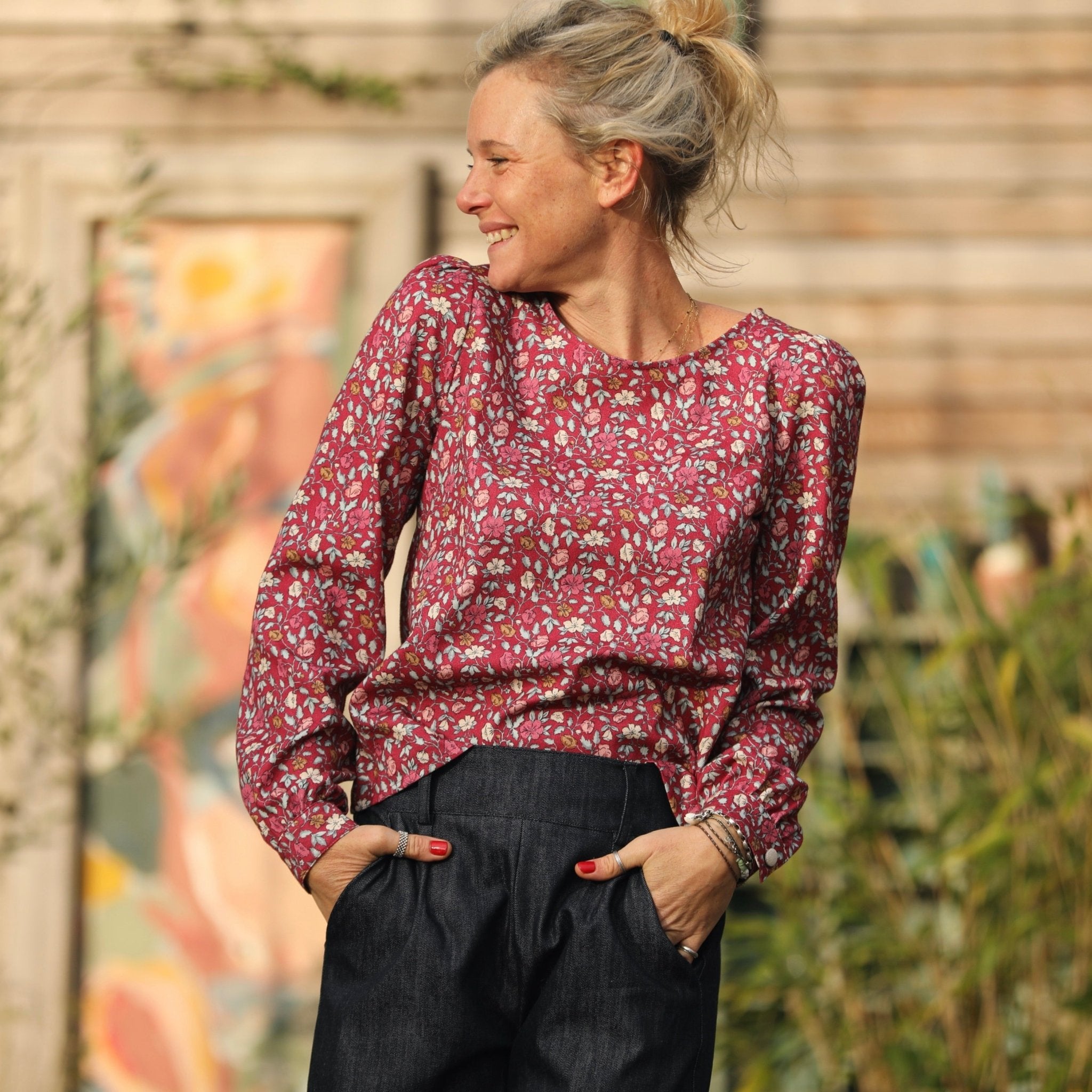 Amarante est une jolie blouse à col rond, agrémentée de délicates fronces aux épaules et de manches longues terminées par des poignets élégants avec un joli bouton fabriquée en France.