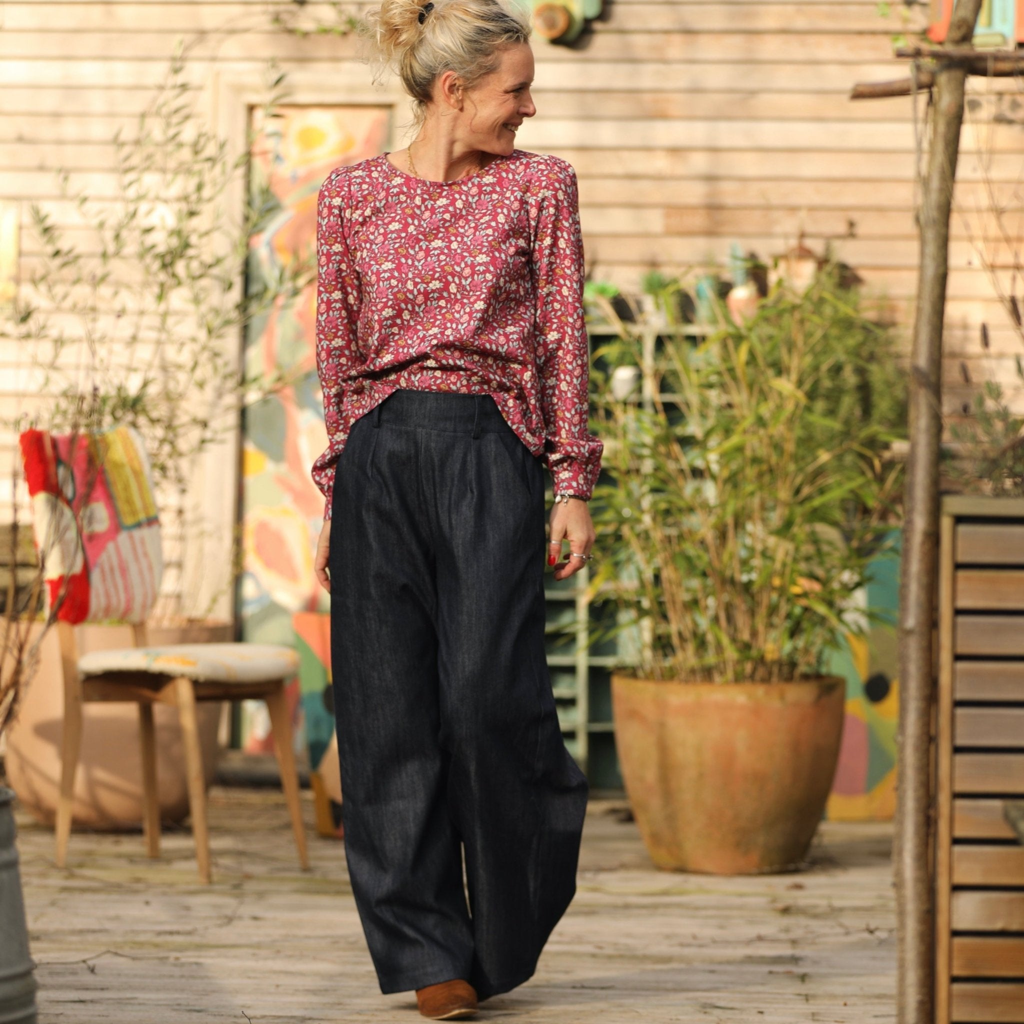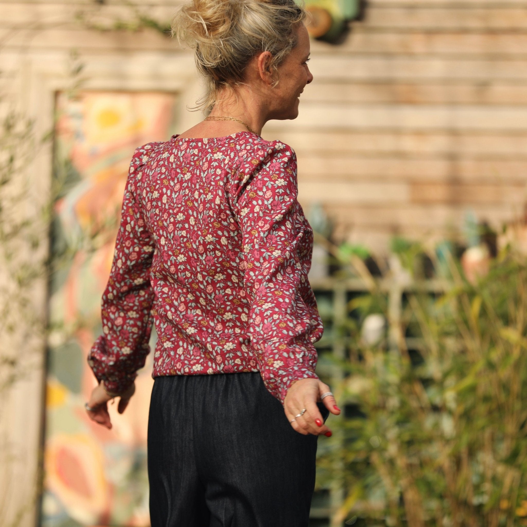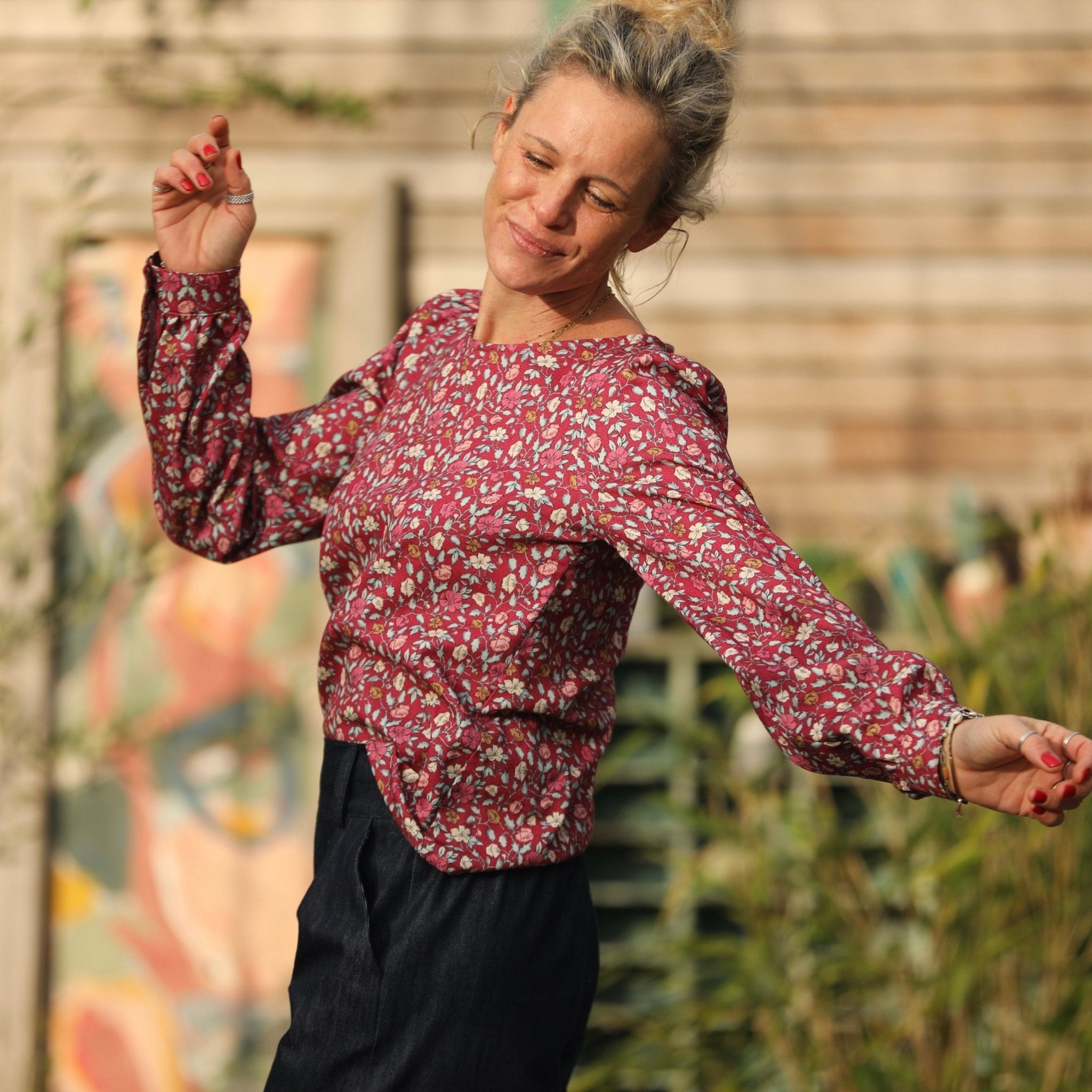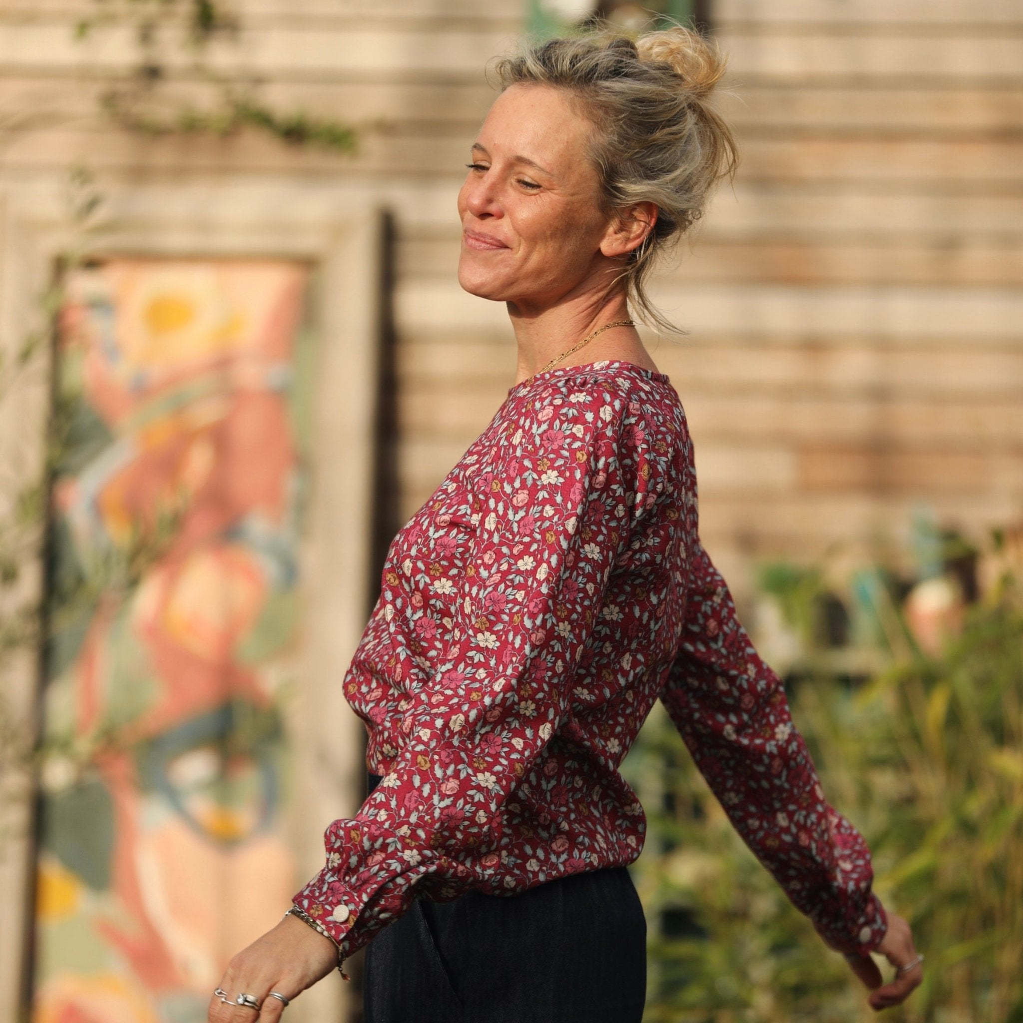 Amarante est une jolie blouse à col rond, agrémentée de délicates fronces aux épaules et de manches longues terminées par des poignets élégants avec un joli bouton fabriquée en France.