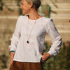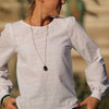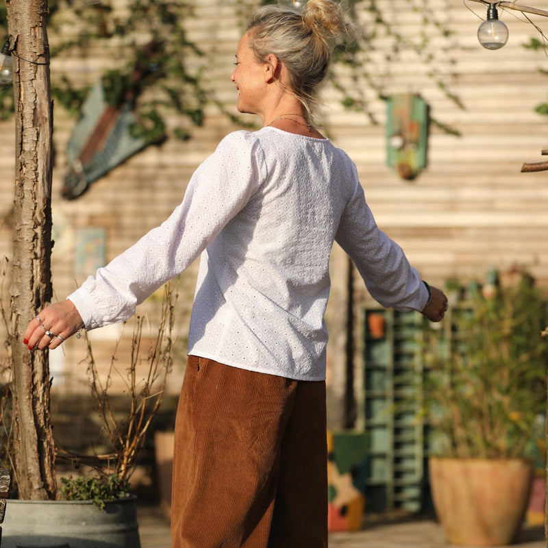 Amarante est une jolie blouse à col rond, agrémentée de délicates fronces aux épaules et de manches longues terminées par des poignets élégants avec un bouton fabriqué en France.