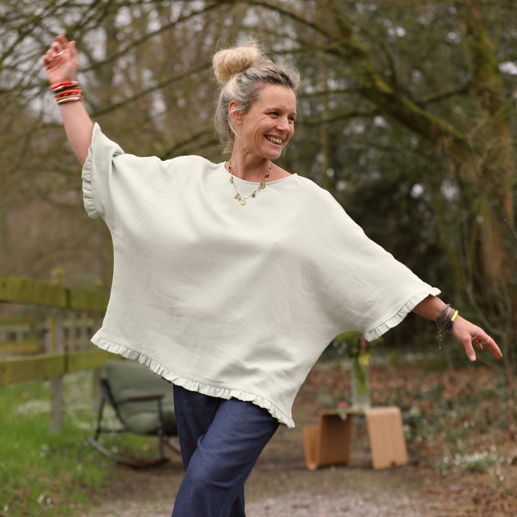 La blouse Annette incarne la liberté de mouvement et la douceur des beaux jours. Sa coupe ample façon kimono enveloppe le corps sans le contraindre, et sa taille unique s’adapte naturellement à une large palette de silhouettes, du XS au XXL.