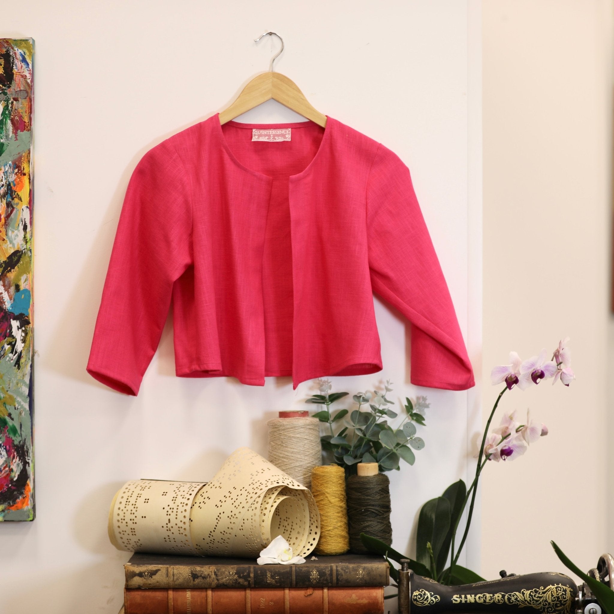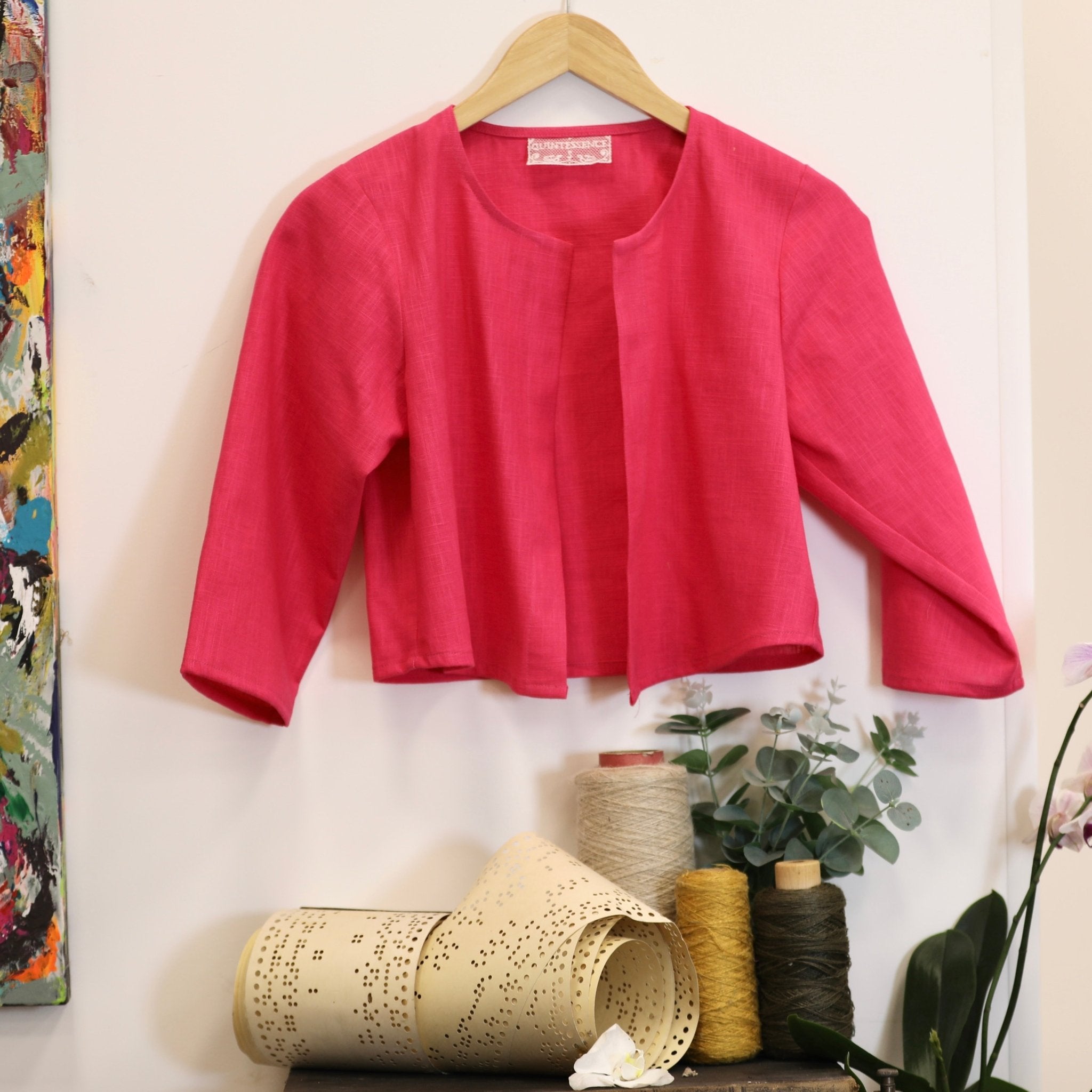 Confectionné dans un lin fuchsia 100 % lin, à la texture plus épaisse, identique à la version ocre, ce boléro offre un tombé lourd, structuré et rassurant. Cette matière apporte de la tenue et une vraie sensation de chaleur, idéale pour les mi-saisons ou les soirées plus fraîches. La teinte fuchsia, vibrante et lumineuse, réveille instantanément une tenue et apporte une touche audacieuse et joyeuse.