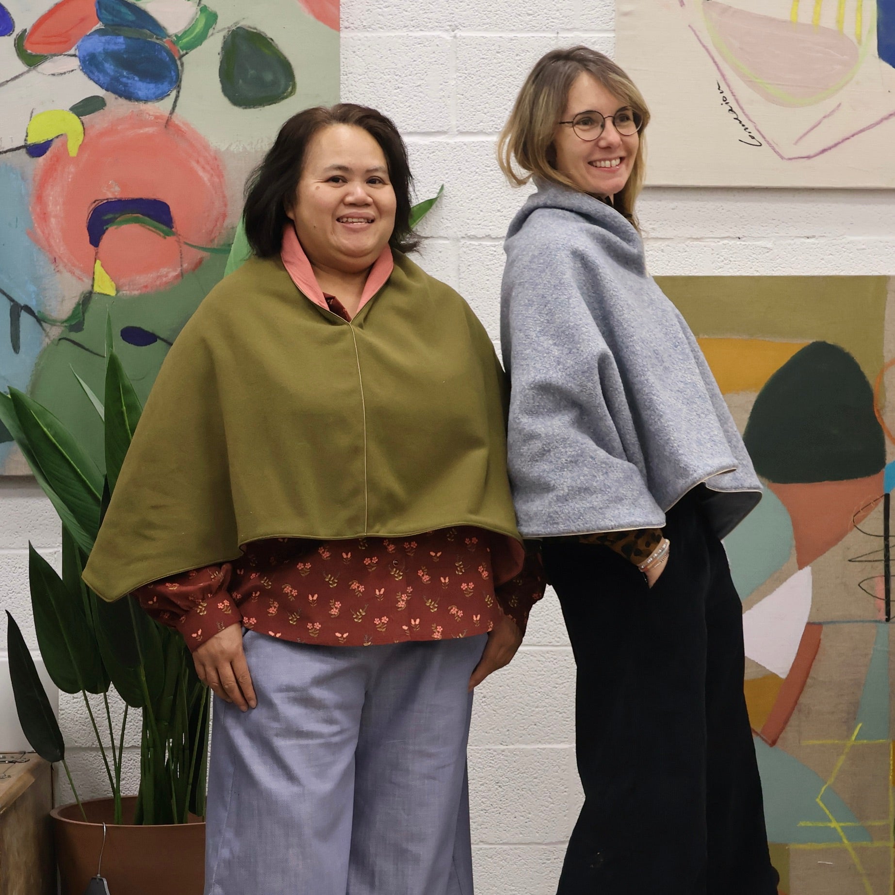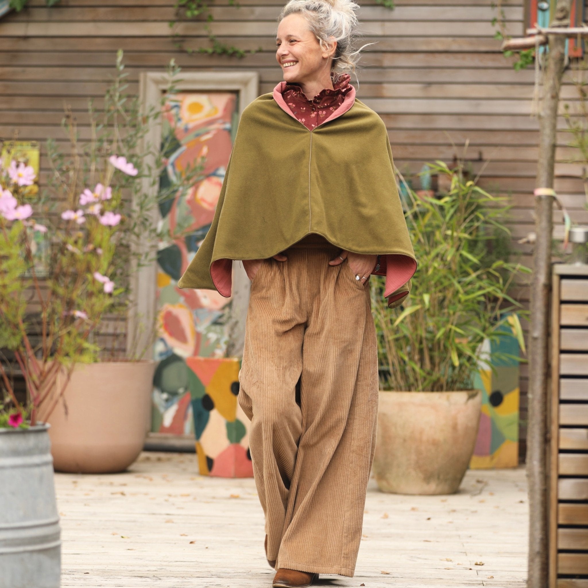Cape courte Eugénie - lainage kiwi/piqué de coton rose boisé