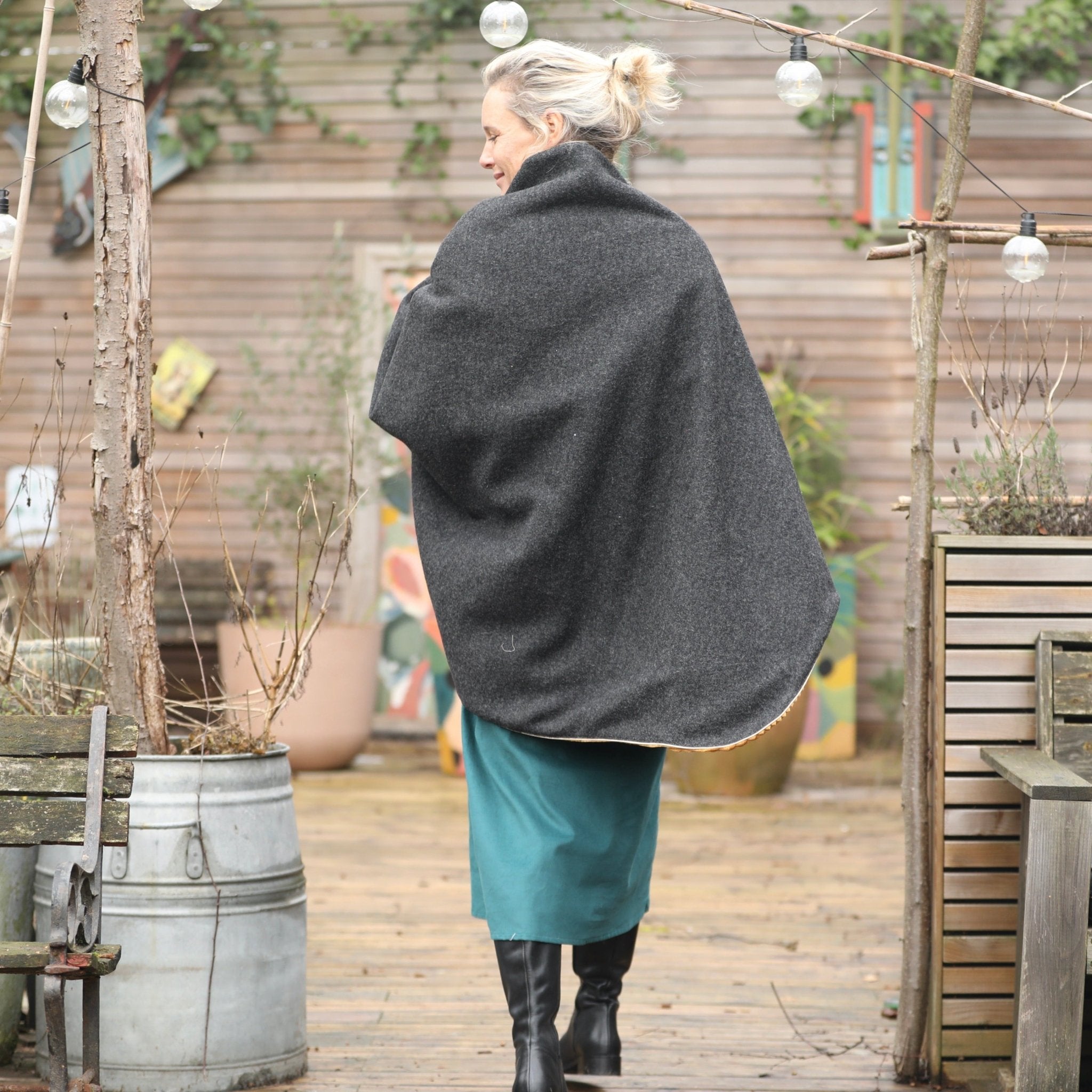 Cape midi Eugénie - laine bouillie gris anthracite / velours grosse côtes ocre
