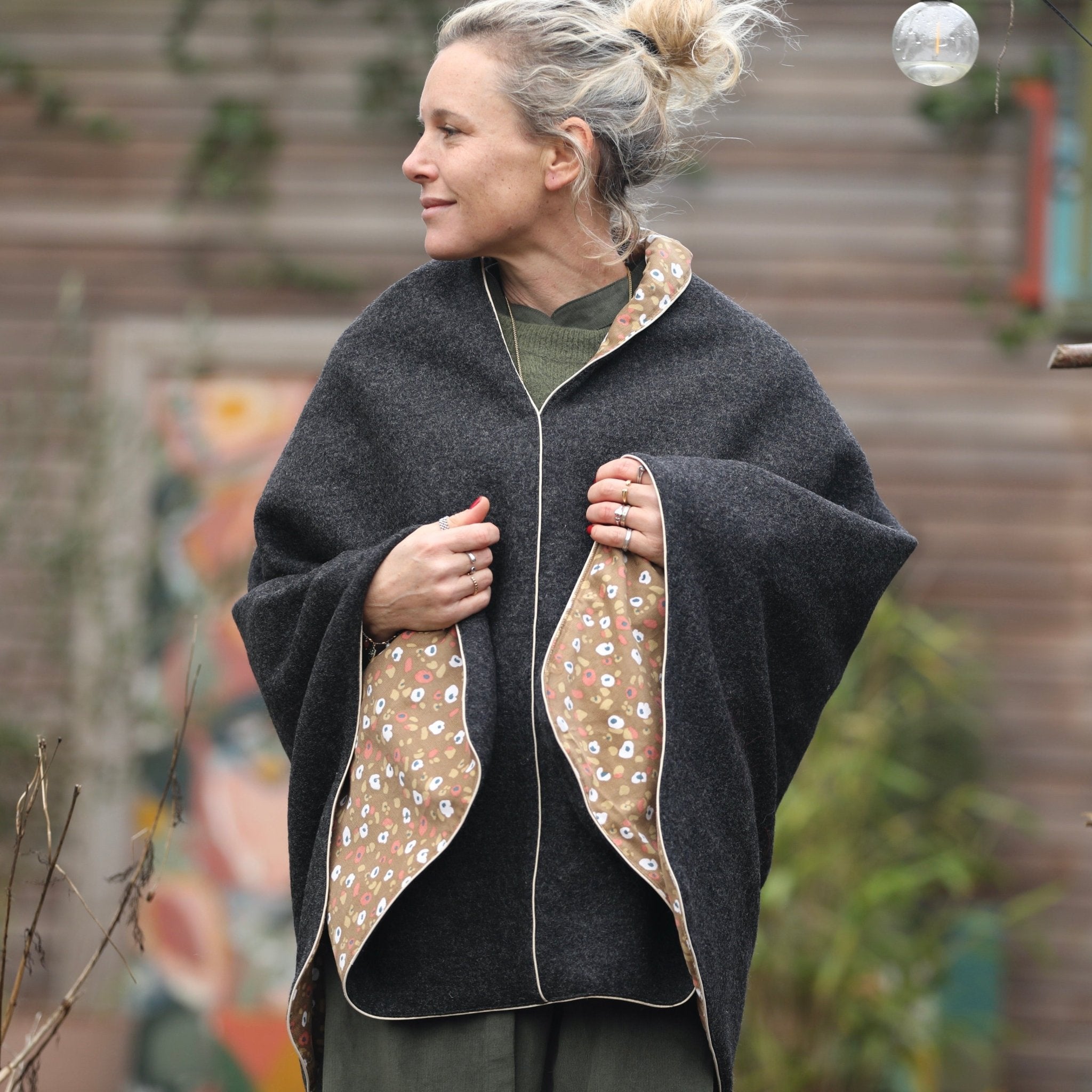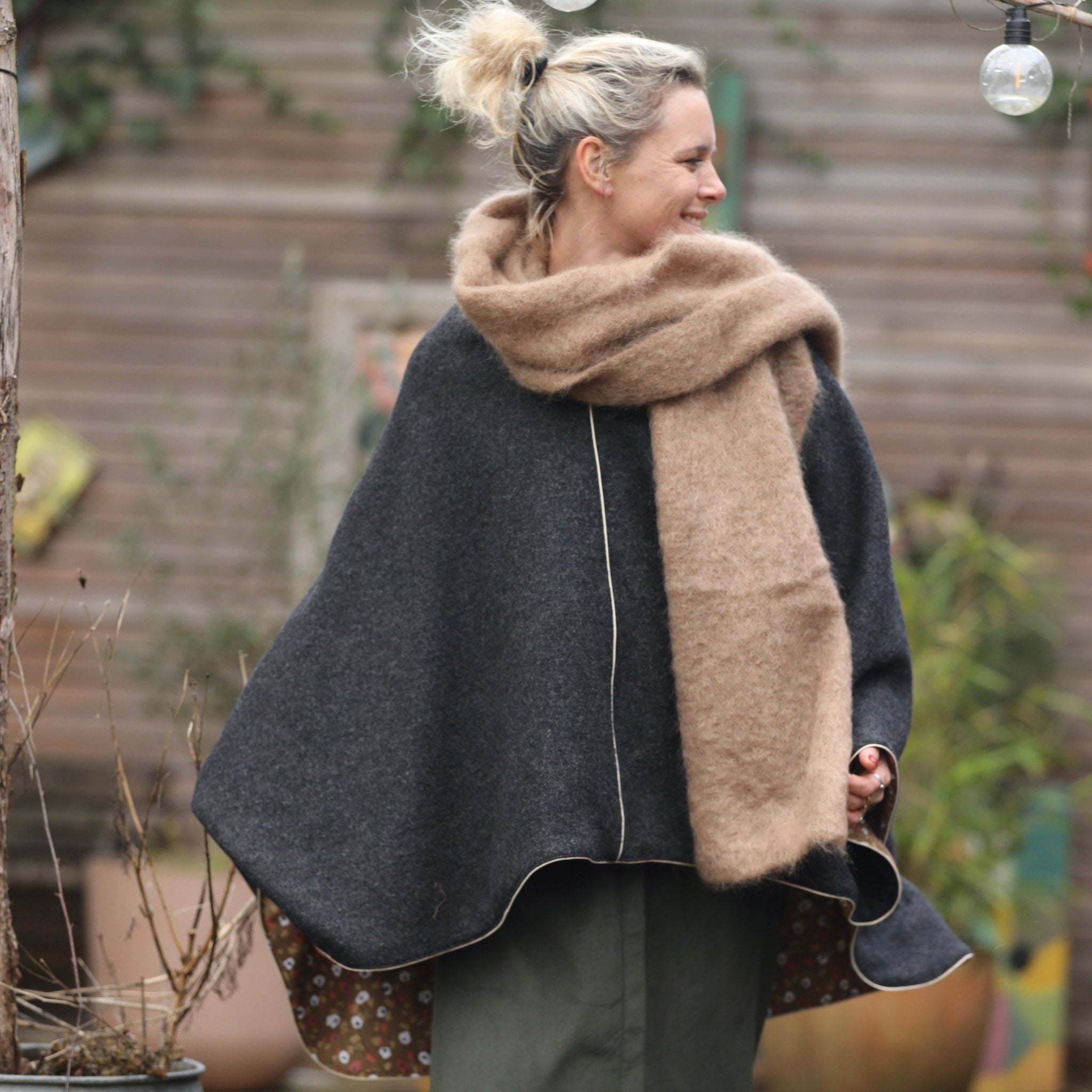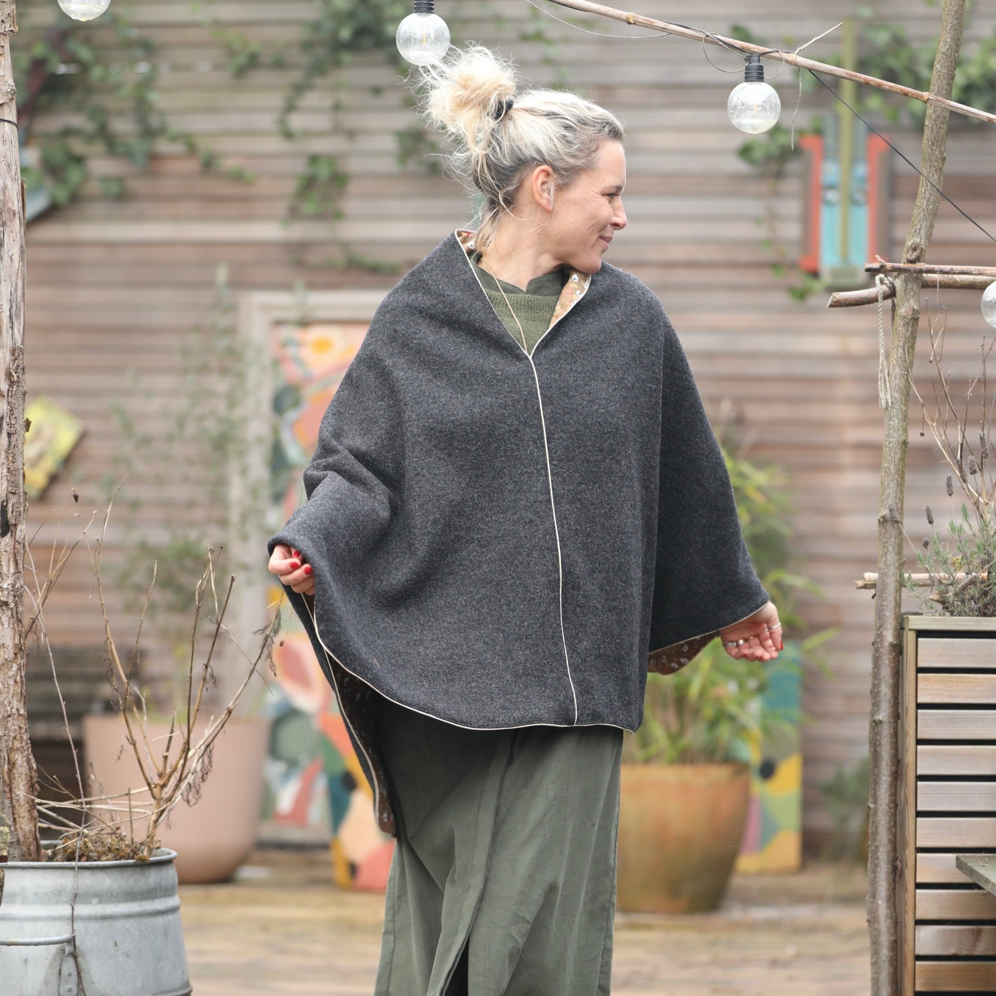Eugénie est une cape mi-longue à la coupe simple, conçue pour être portée par-dessus un vêtement.
