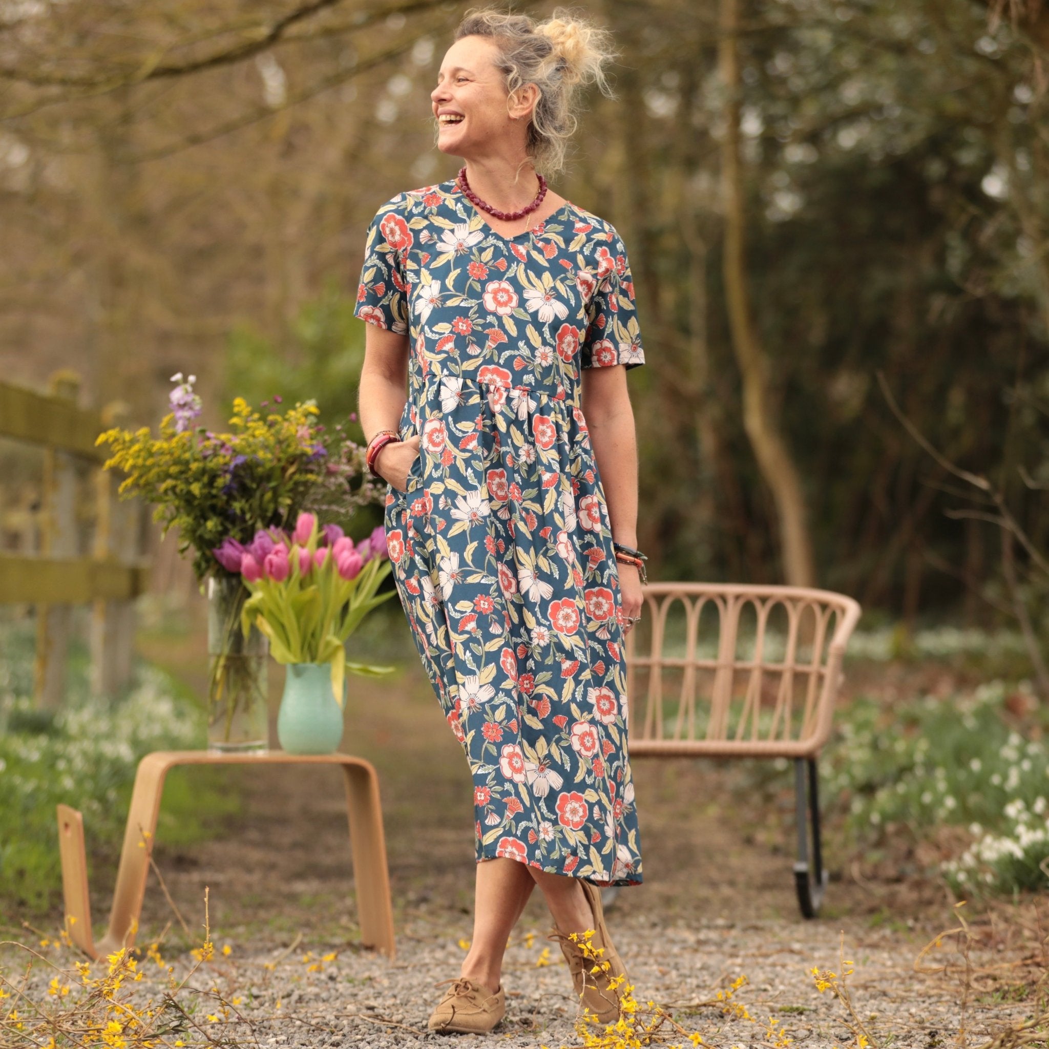 La robe Juliette se porte facilement avec des sandales naturelles pour une allure bohème, des baskets pour un style plus casual ou une veste en denim pour structurer la silhouette. Ses tonalités chaleureuses s’accordent parfaitement avec des accessoires camel, dorés ou écrus.