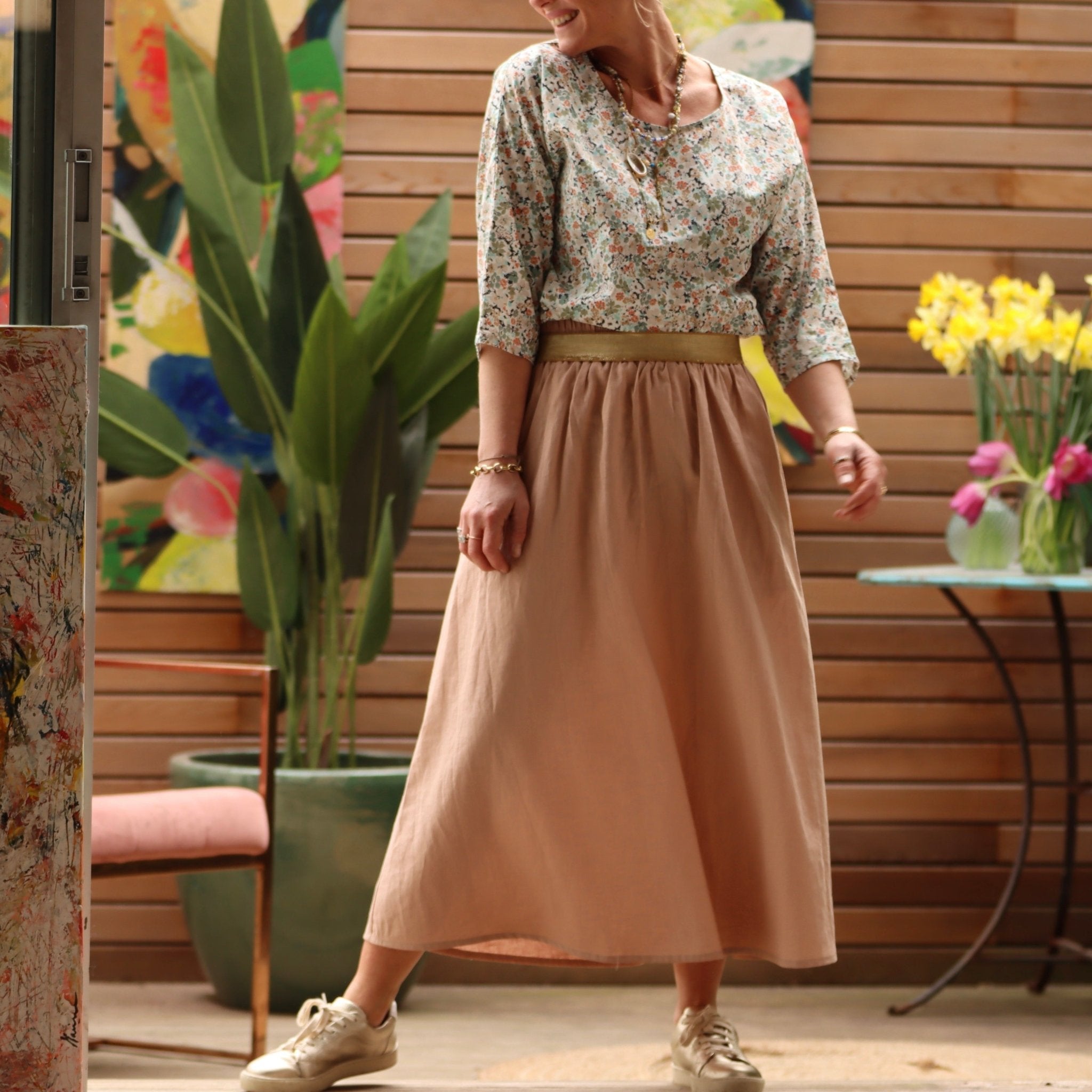 Plongez dans l'univers de Gaïa, une belle jupe longue confortable et intemporelle proposée avec un choix de ceintures : ton sur ton, en jean bleu nuit, bleu lumineux ou une ceintures dorée. Elle a deux poches discrètes sur les côtés.