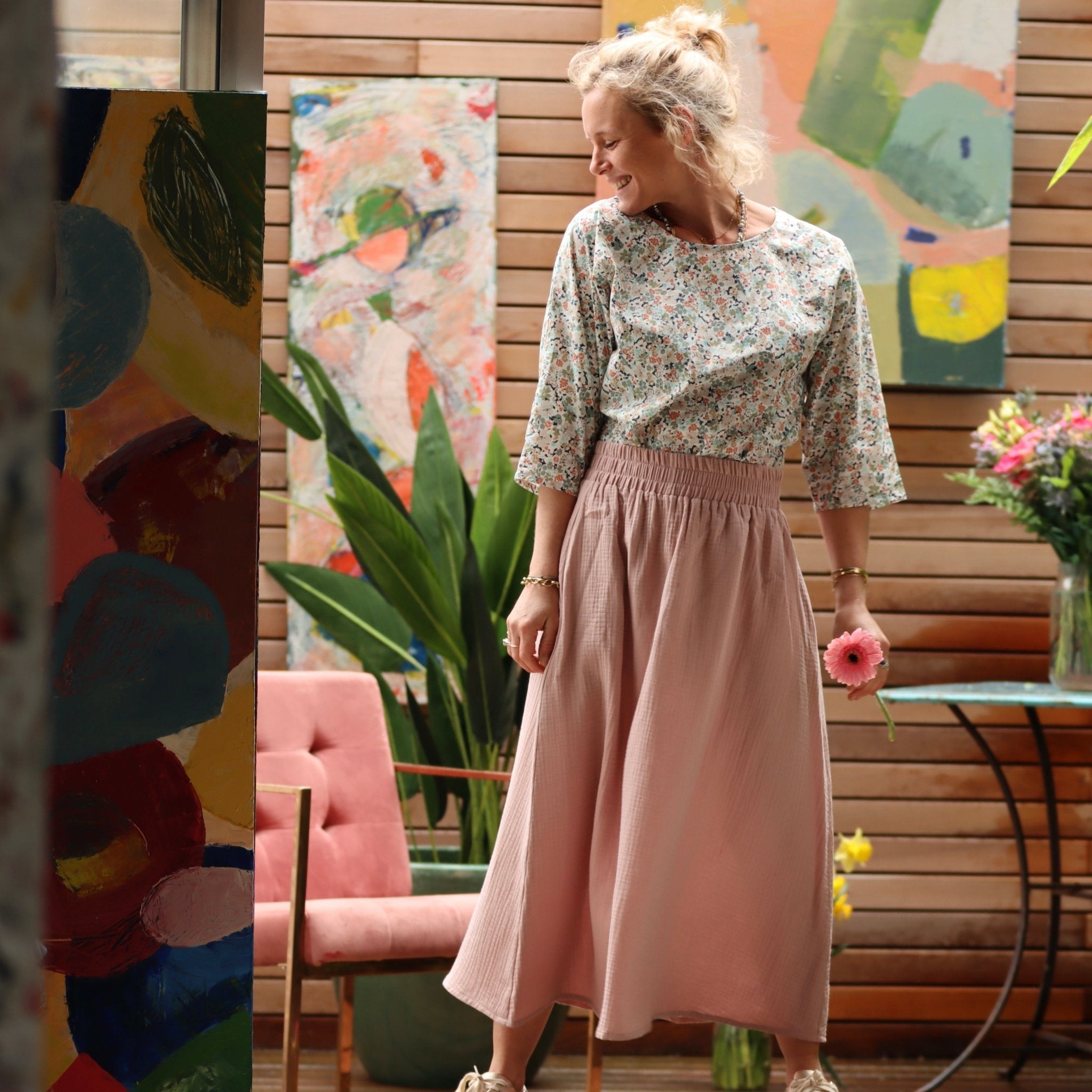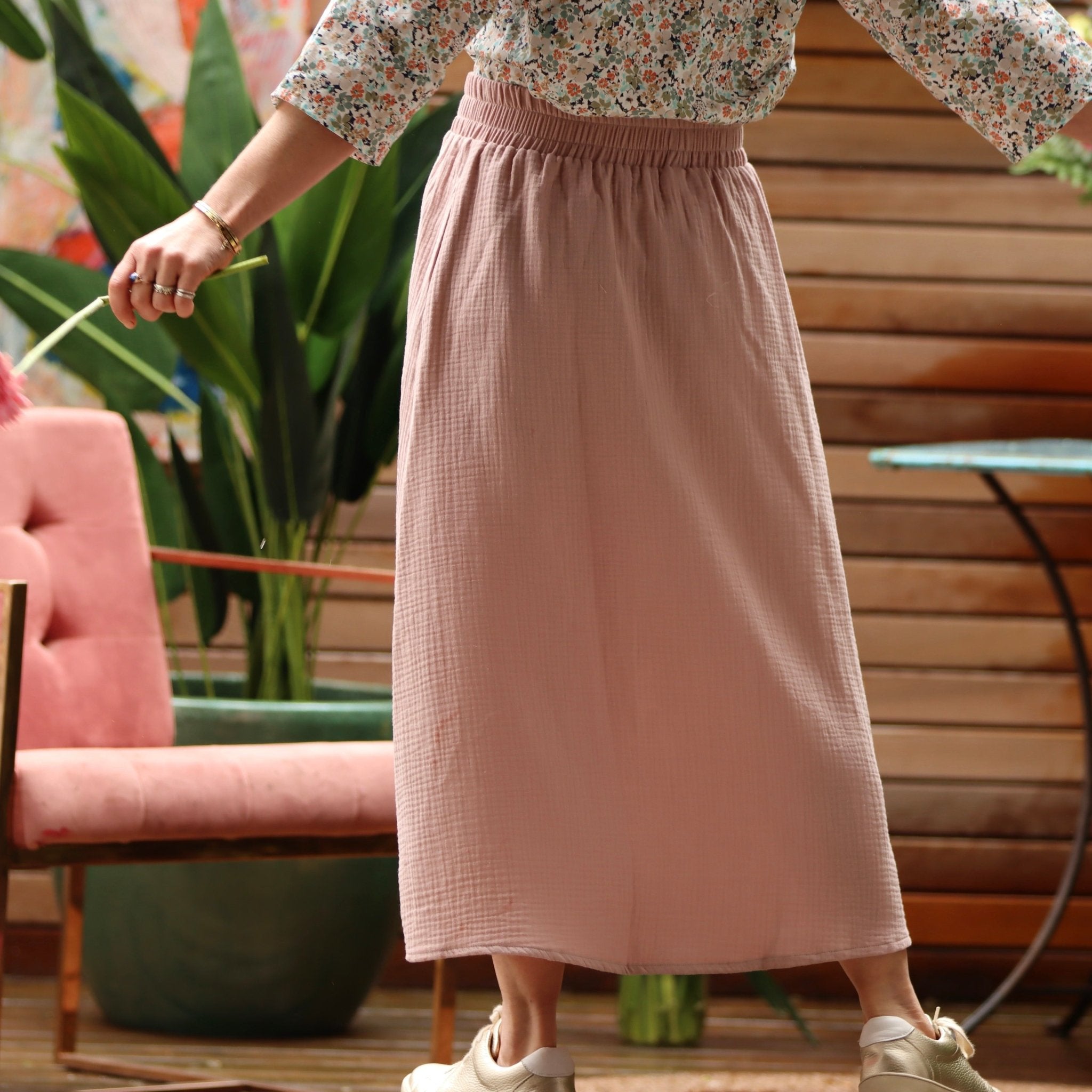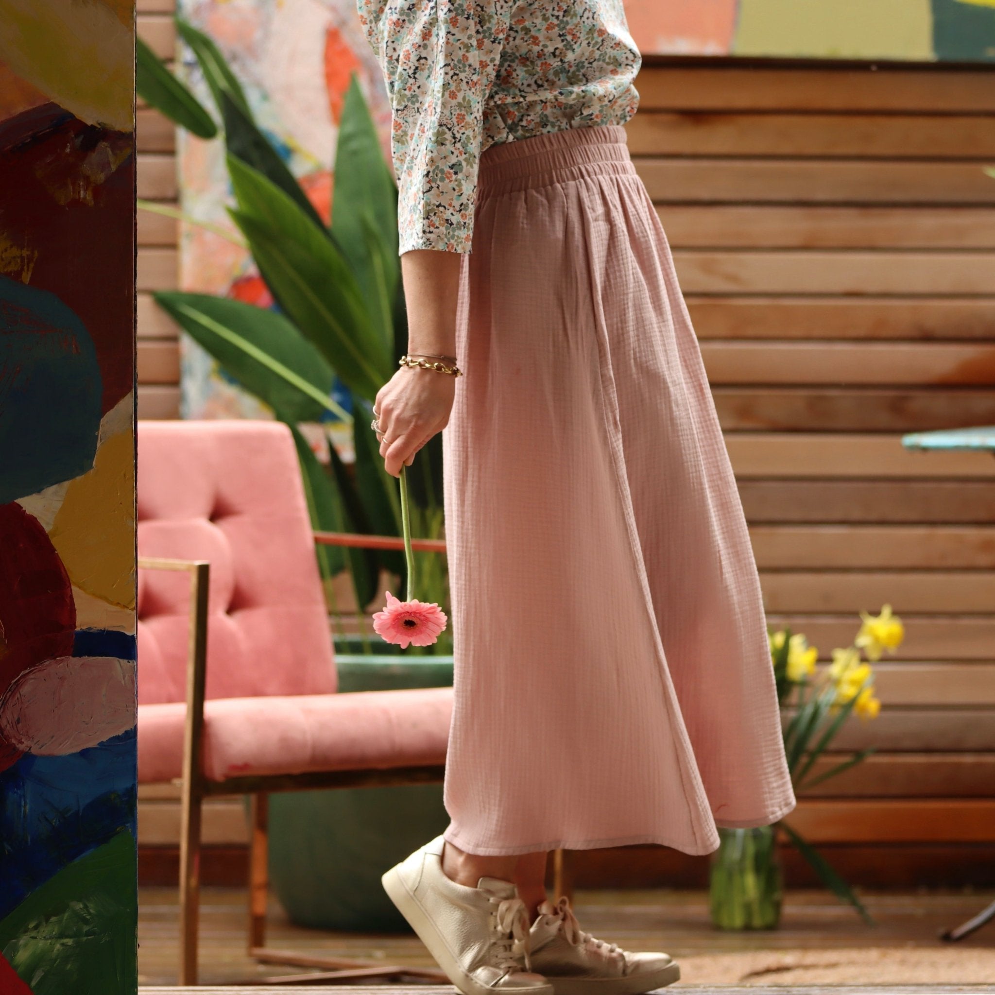 Jupe longue rose poudré en gaze de coton Gaïa - Quintessence
