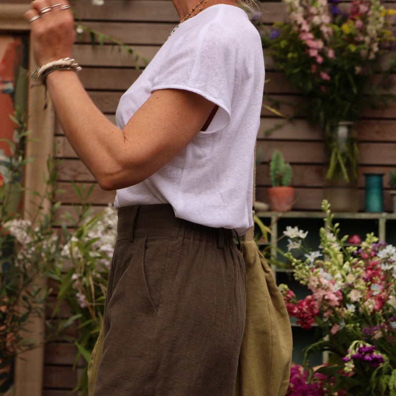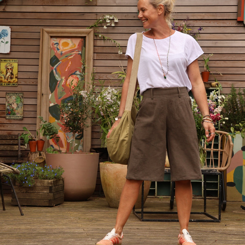 Tomi, le bermuda élégant, se distingue par ses jambes amples, ses pinces soigneusement cousues à la taille et son dos élastique, offrant ainsi un mariage parfait entre style et confort.