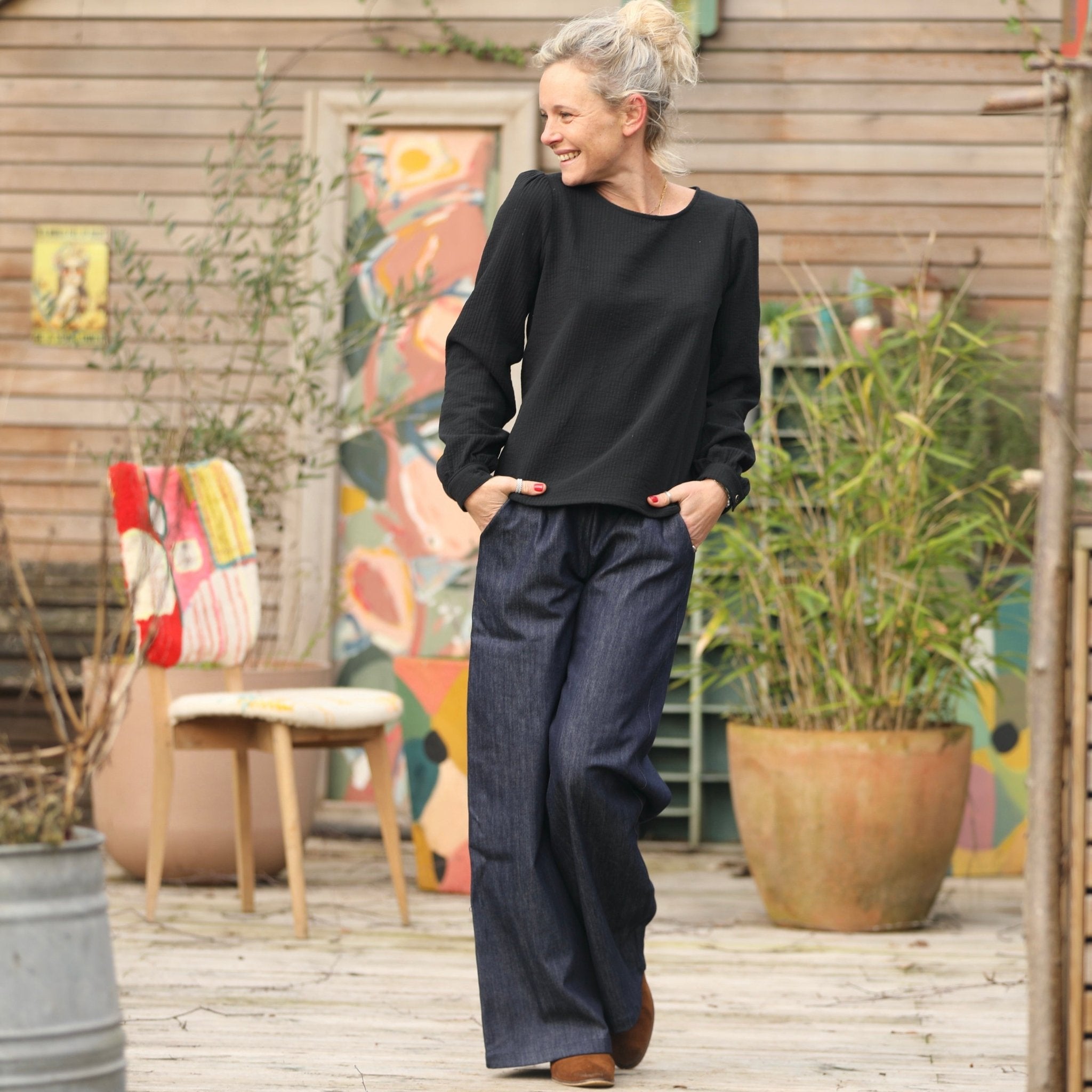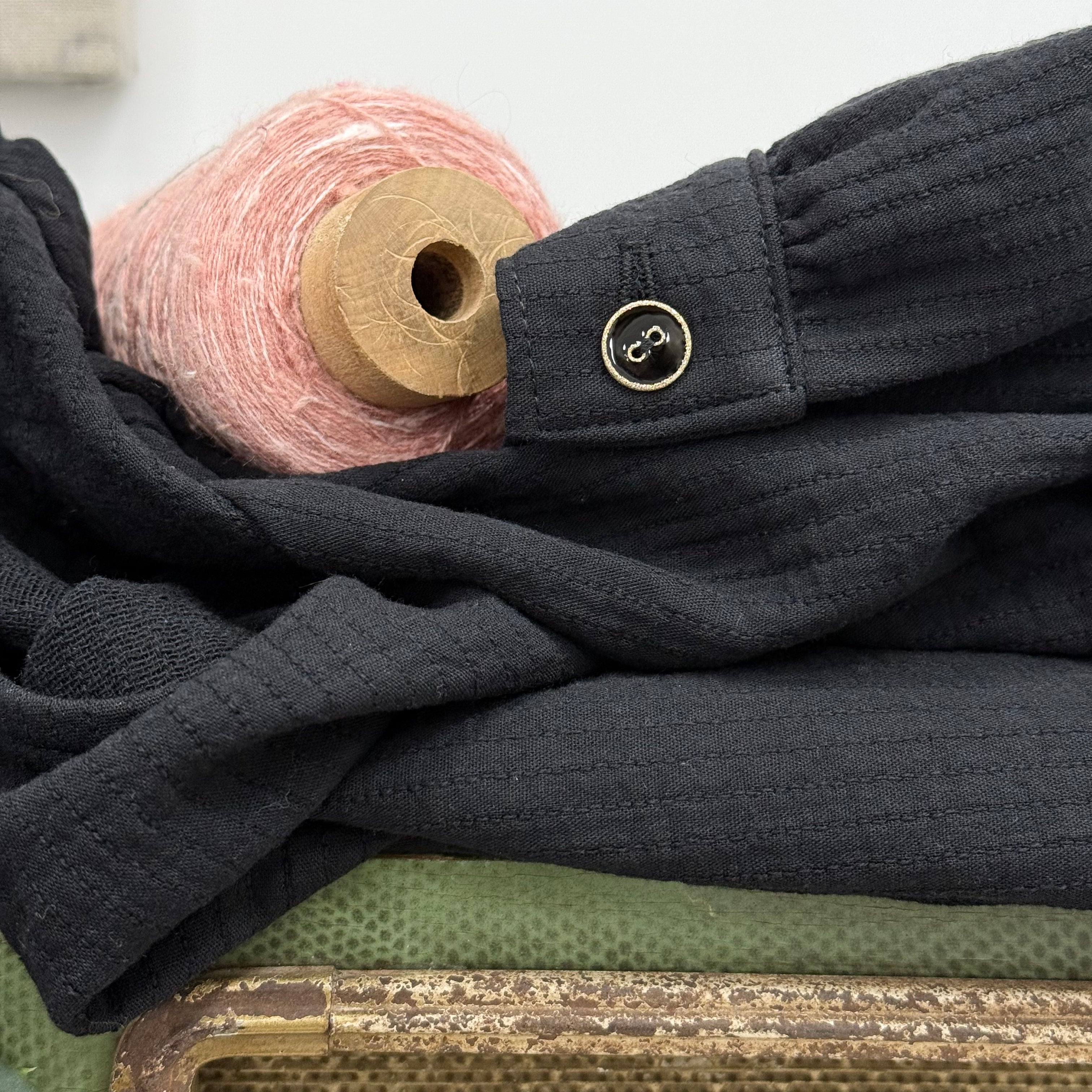 Amarante est une jolie blouse à col rond, agrémentée de délicates fronces aux épaules et de manches longues terminées par des poignets élégants avec  avec un joli bouton fabriqué en France.