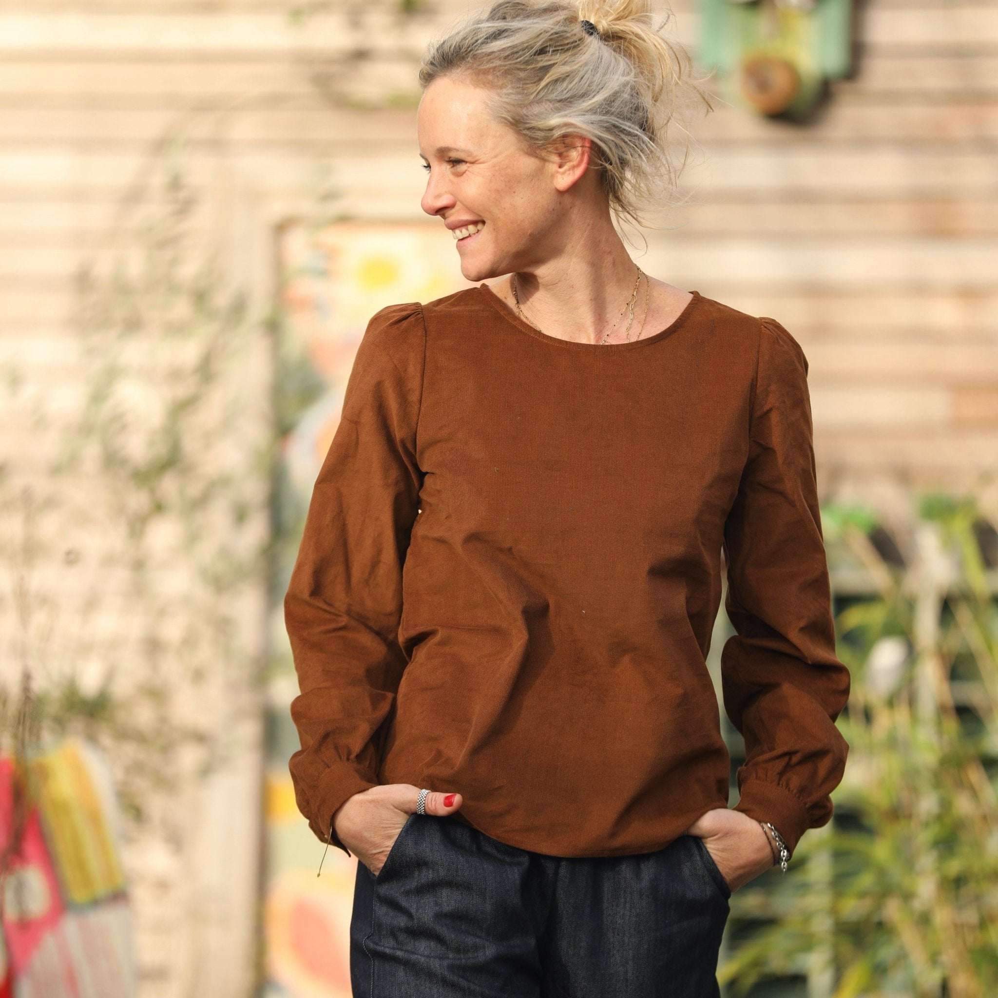Amarante est une jolie blouse à col rond, agrémentée de délicates fronces aux épaules et de manches longues terminées par des poignets élégants avec  avec un joli bouton fabriqué en France.