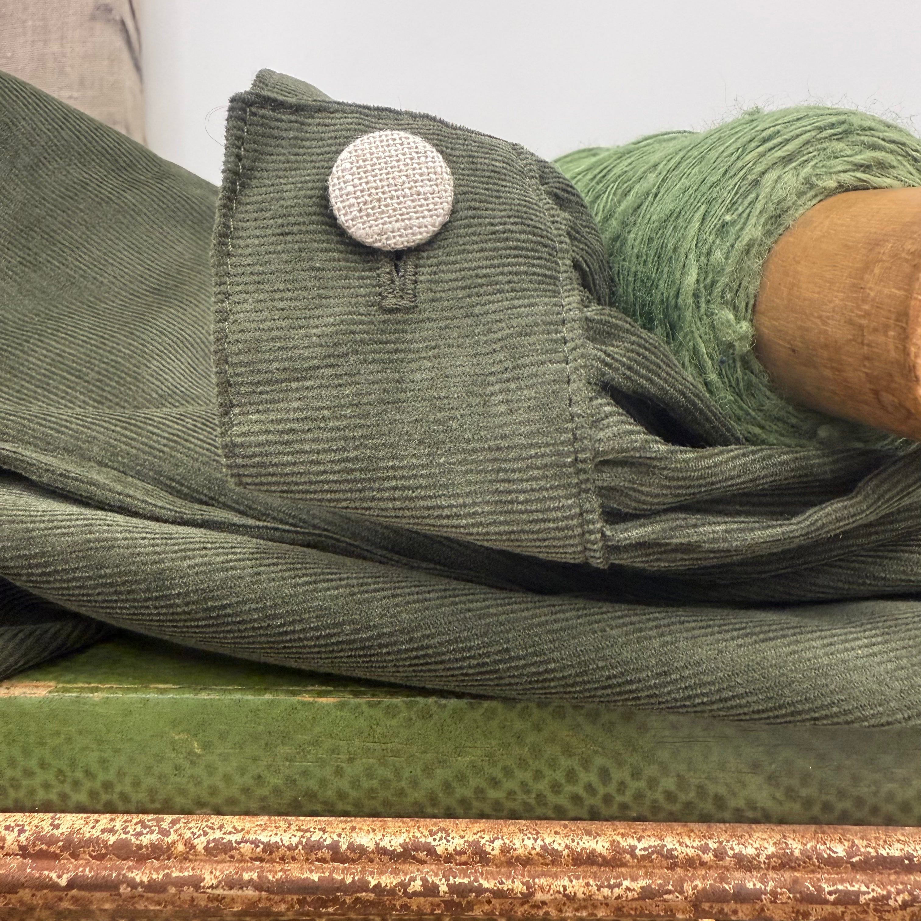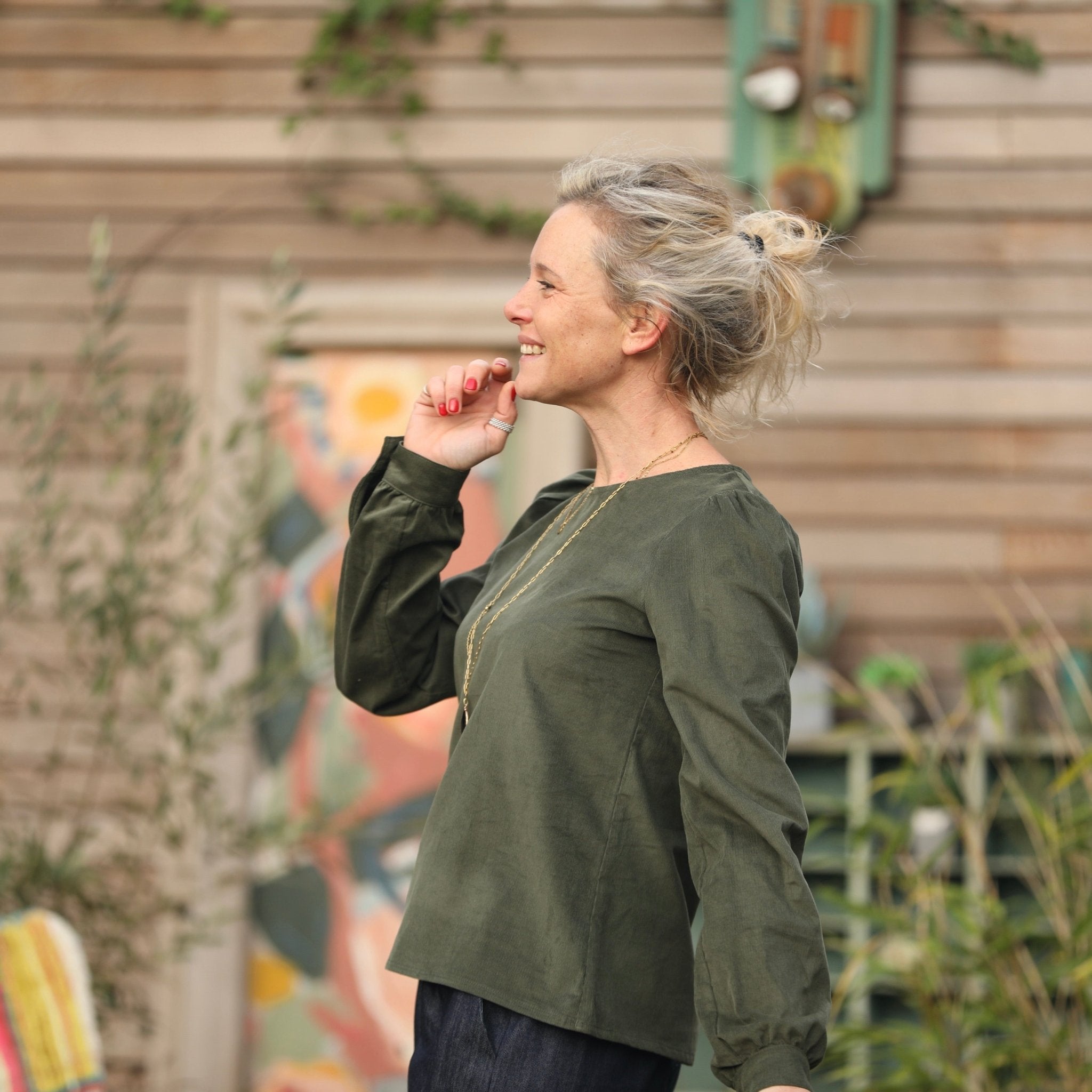 Amarante est une jolie blouse à col rond, agrémentée de délicates fronces aux épaules et de manches longues terminées par des poignets élégants avec  avec un joli bouton rcuvert de lin fabriqué en France.