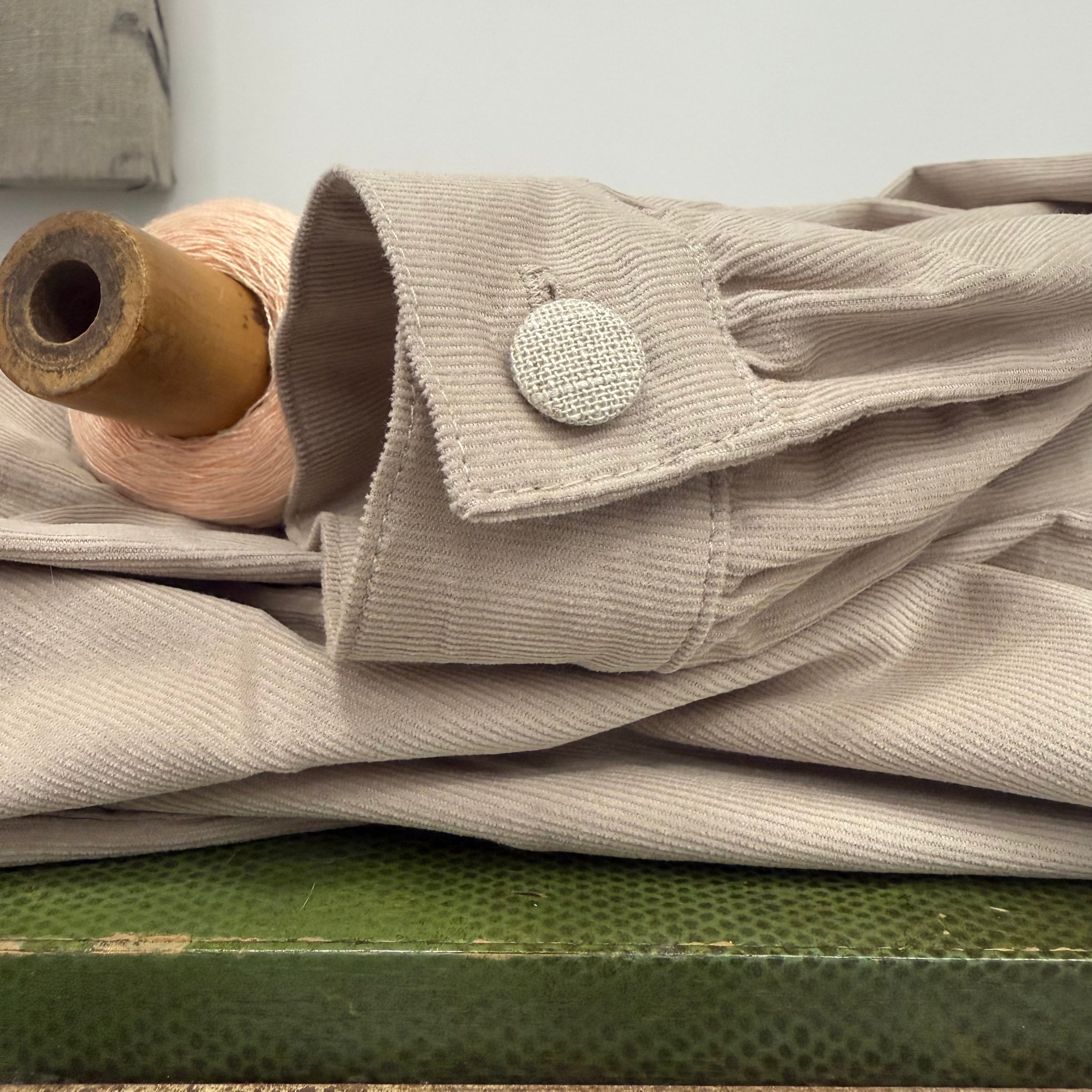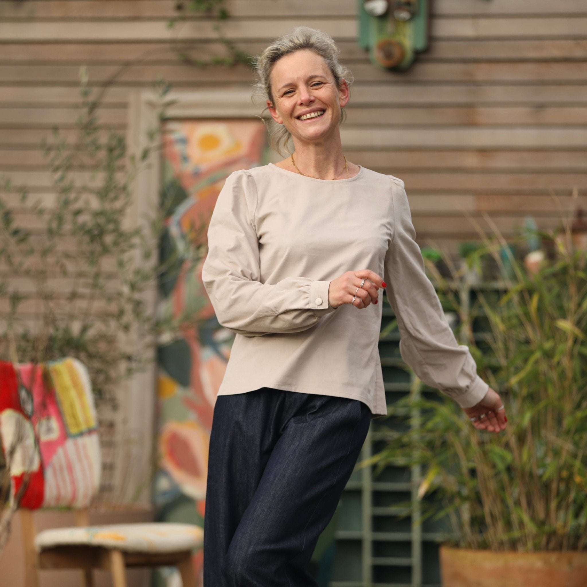 Amarante est une jolie blouse à col rond, agrémentée de délicates fronces aux épaules et de manches longues terminées par des poignets élégants avec  avec un joli bouton recouvert de lin fabriqué en France.