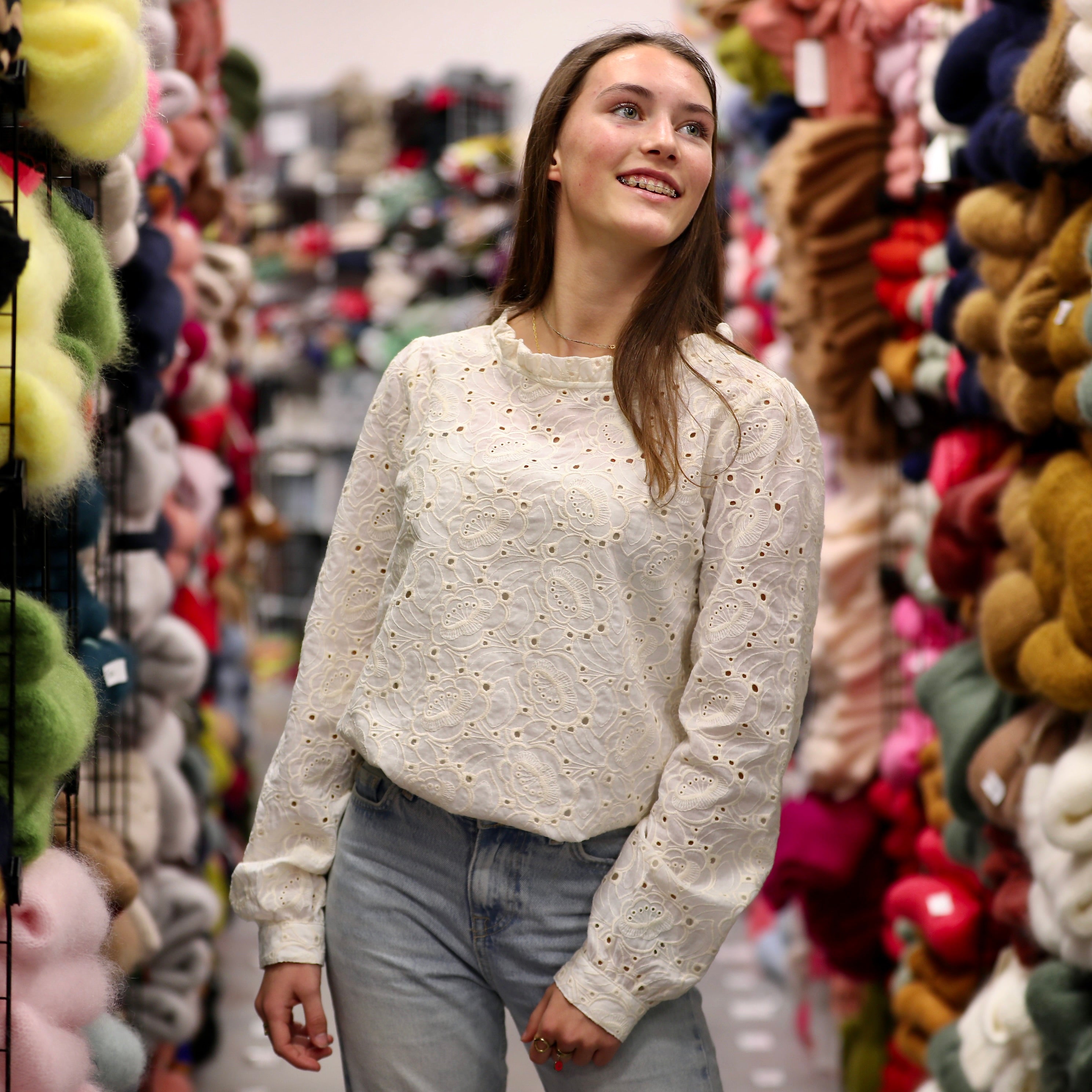 Confectionnée dans un coton brodé écru 100 % coton, cette matière se distingue par son relief délicatement texturé et ses motifs brodés en surépaisseur, qui apportent du caractère tout en restant subtils. Le fond en coton reste léger et respirant, tandis que la broderie crée un jeu de volumes élégant et raffiné. Une étoffe naturelle, à la fois douce au toucher et visuellement riche, idéale pour des pièces au charme intemporel.