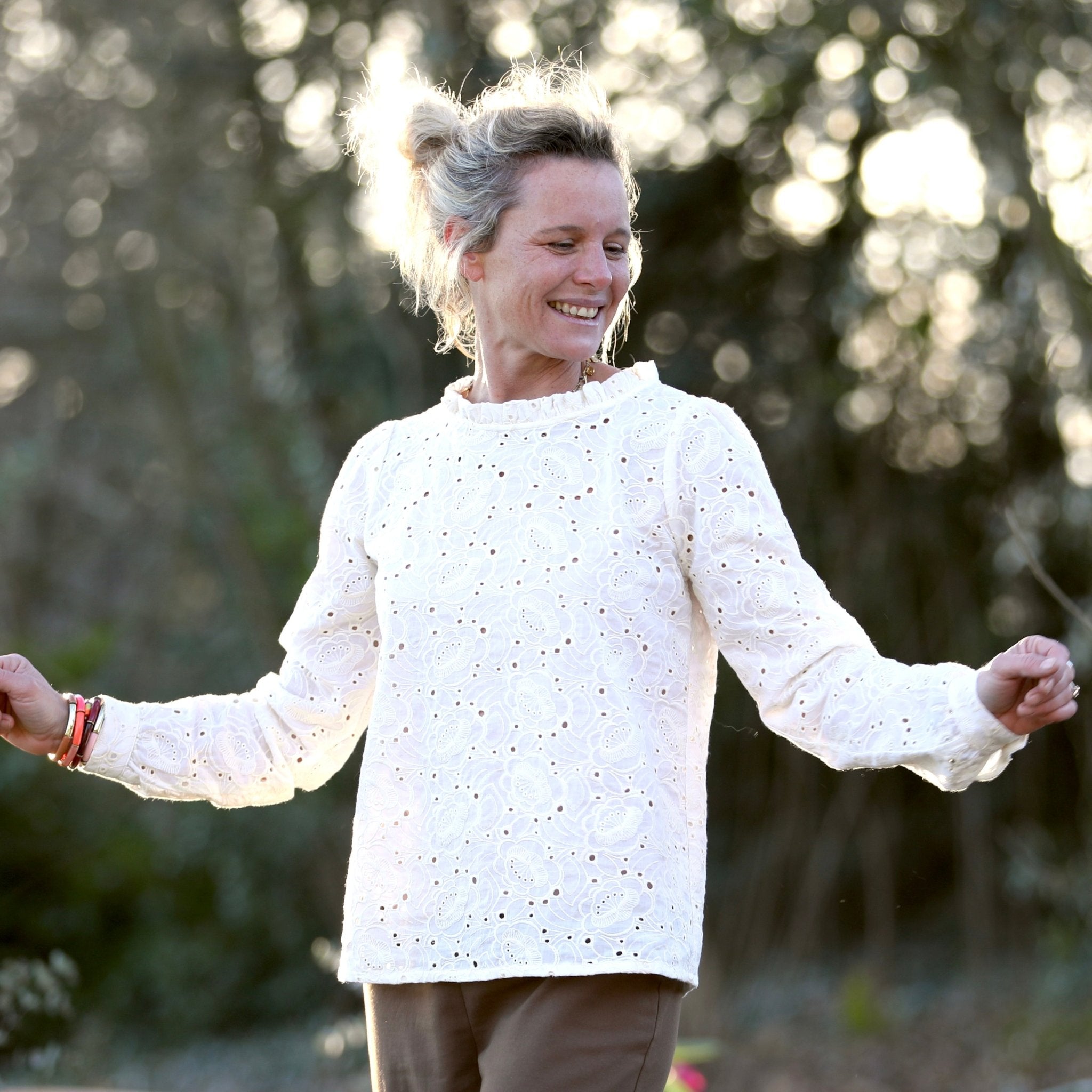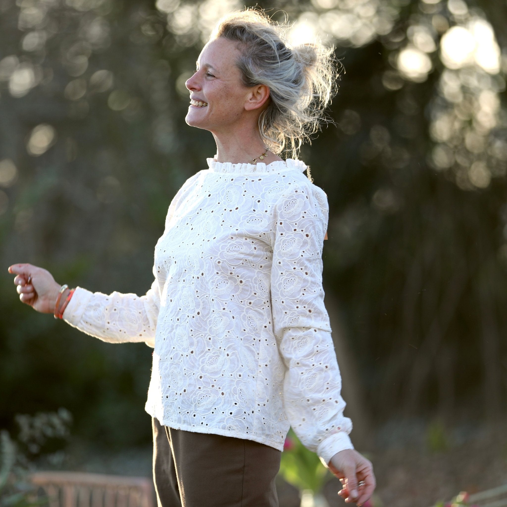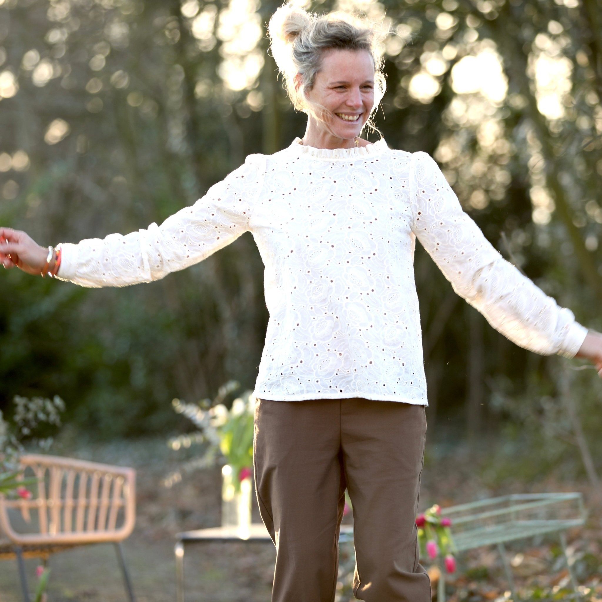 La blouse Fantine se porte avec tout : jean, pantalon large, jupe fluide ou même sous une maille. Sa teinte blanche, lumineuse et intemporelle, en fait un essentiel du vestiaire Quintessence.