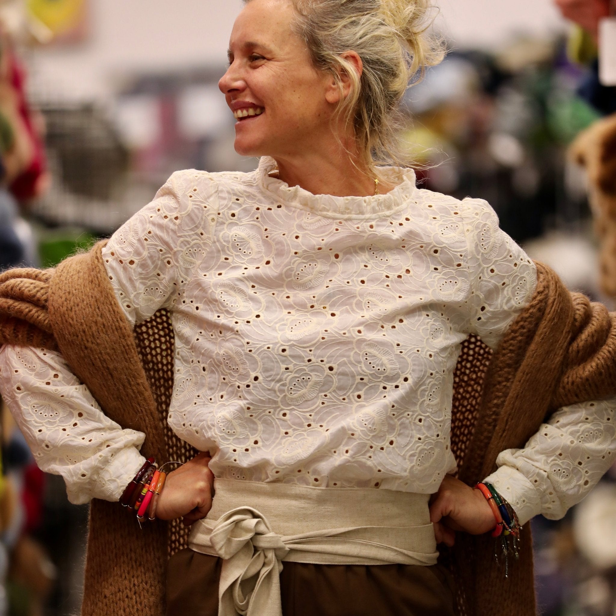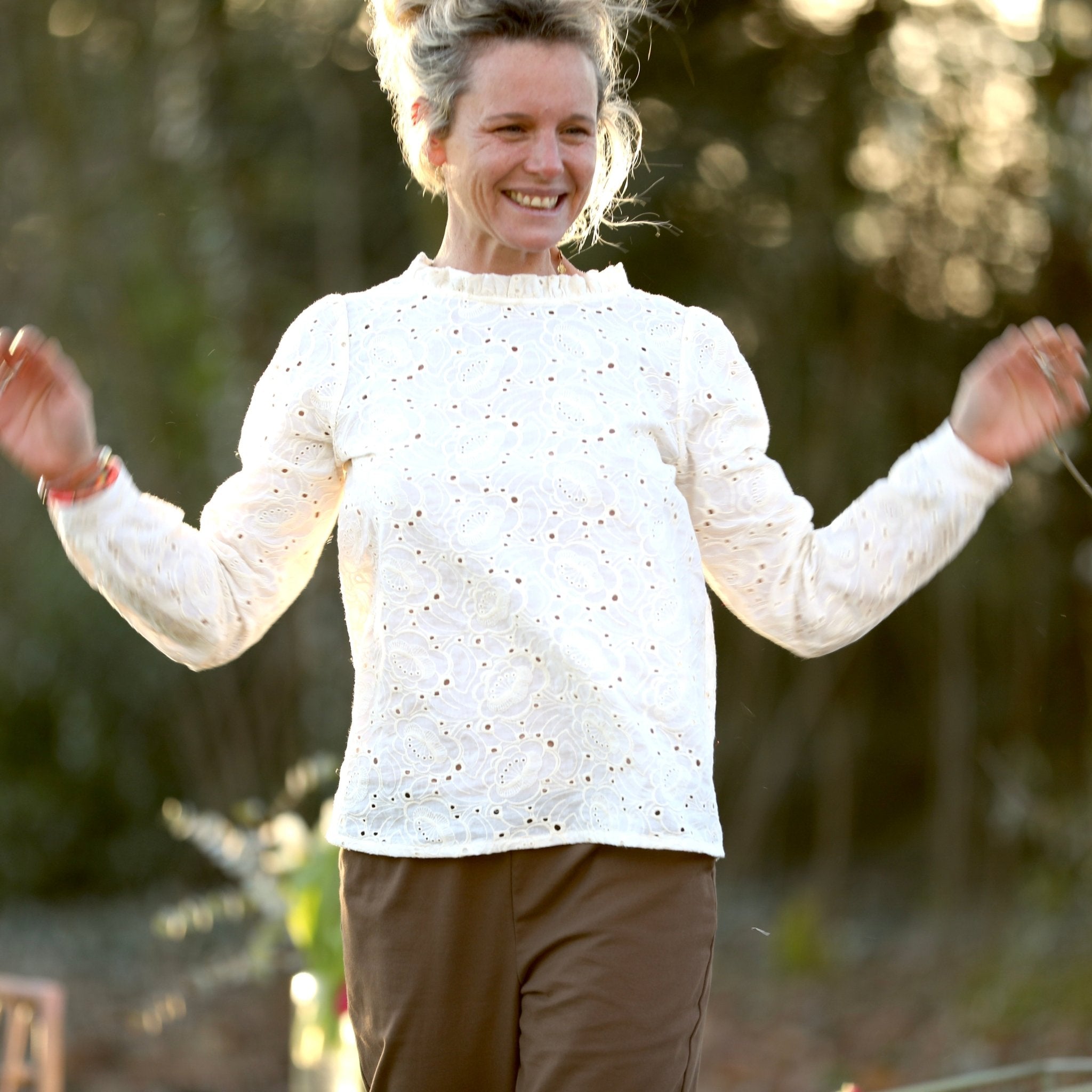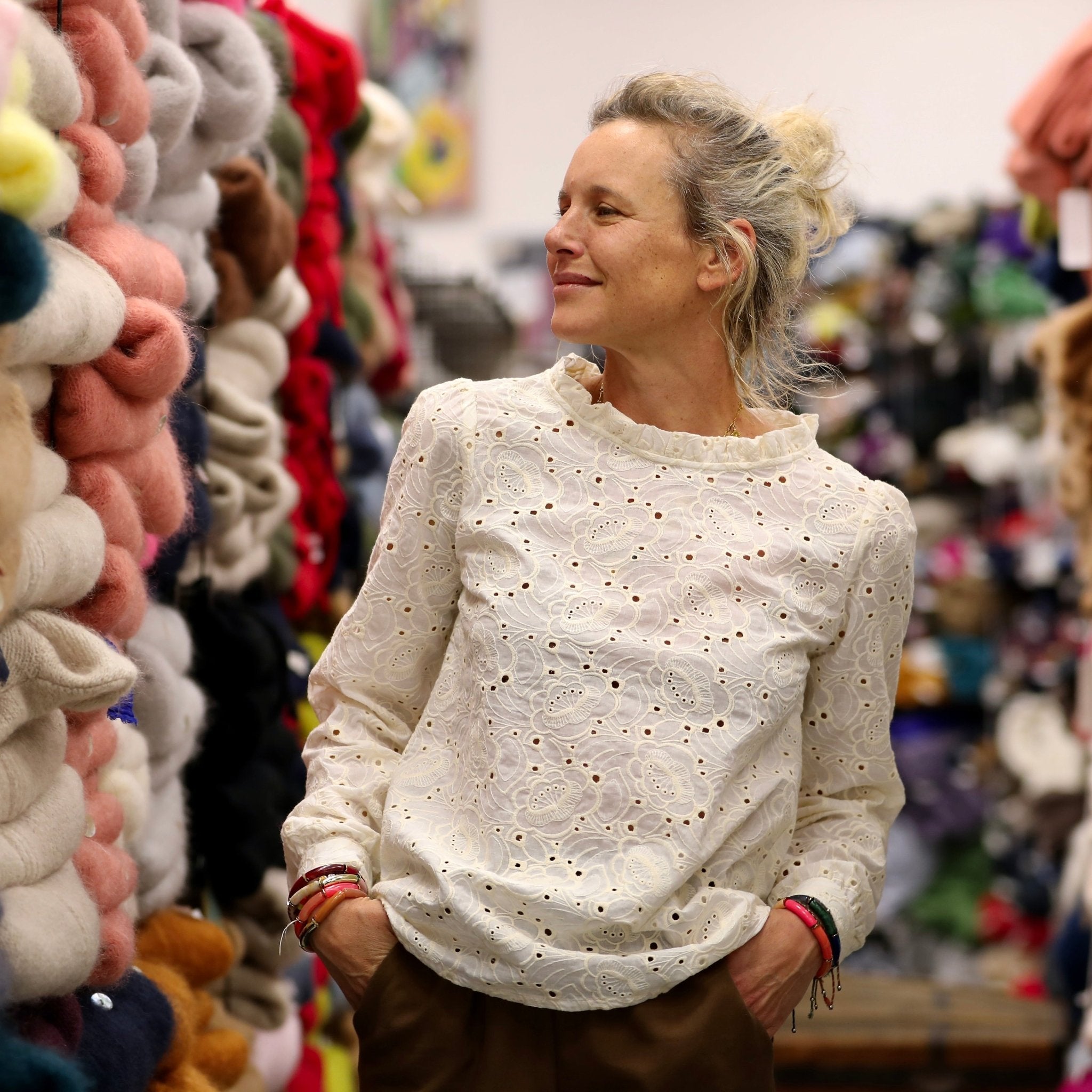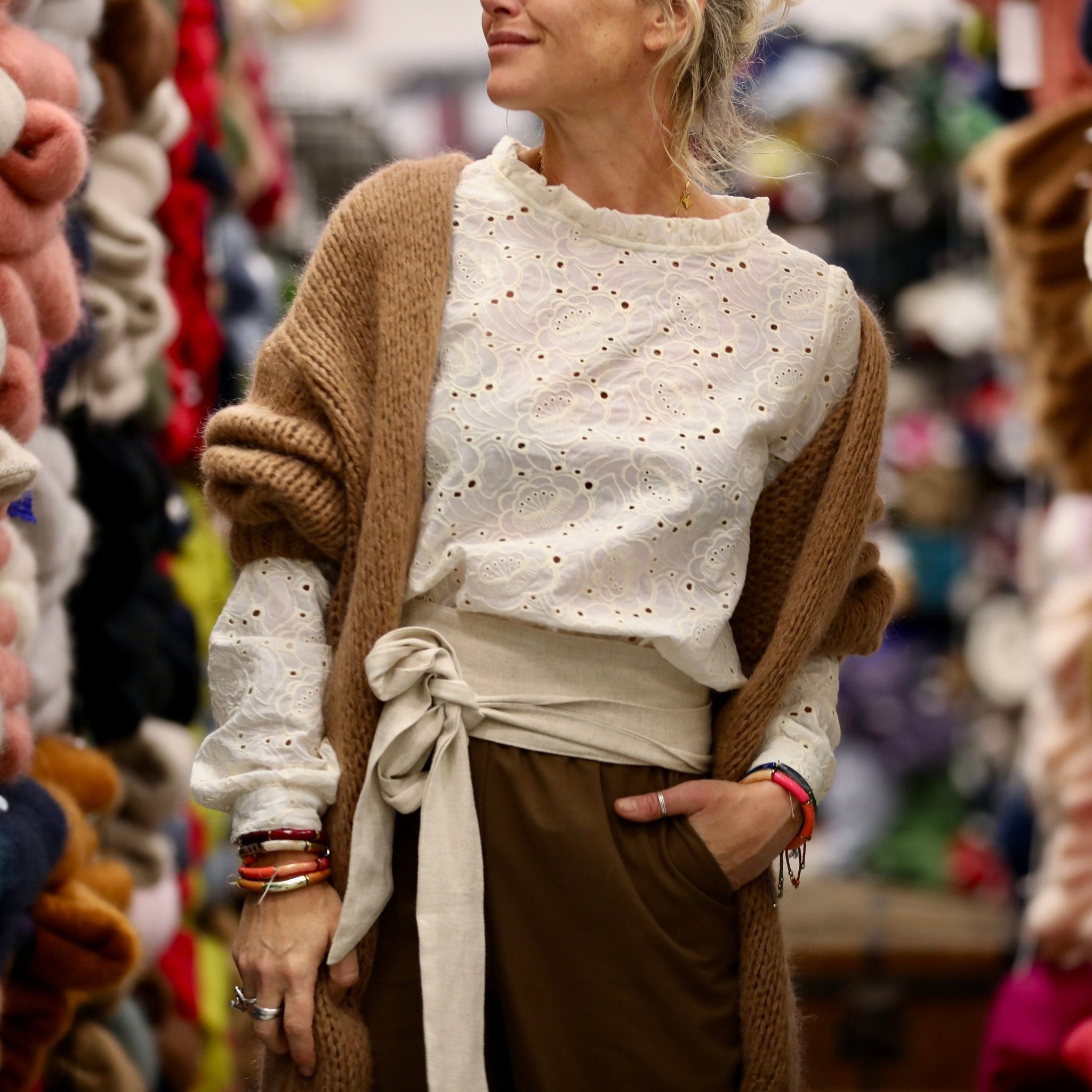 La blouse Fantine se porte avec tout : jean, pantalon large, jupe fluide ou même sous une maille. Sa teinte blanche, lumineuse et intemporelle, en fait un essentiel du vestiaire Quintessence.