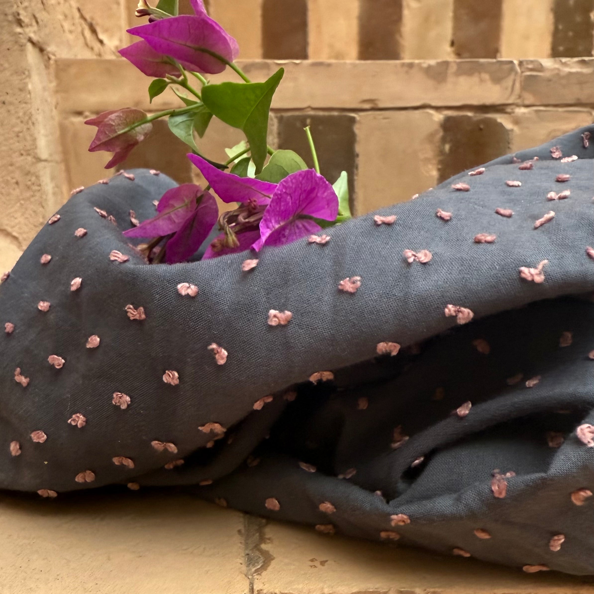 Ses manches kimono offrent une belle liberté de mouvement, et ses finitions soignées témoignent du savoir-faire Quintessence. Le voile de coton gris ponctué de plumetis roses apporte douceur et subtilité, parfait pour illuminer le teint et rehausser une tenue simple.
