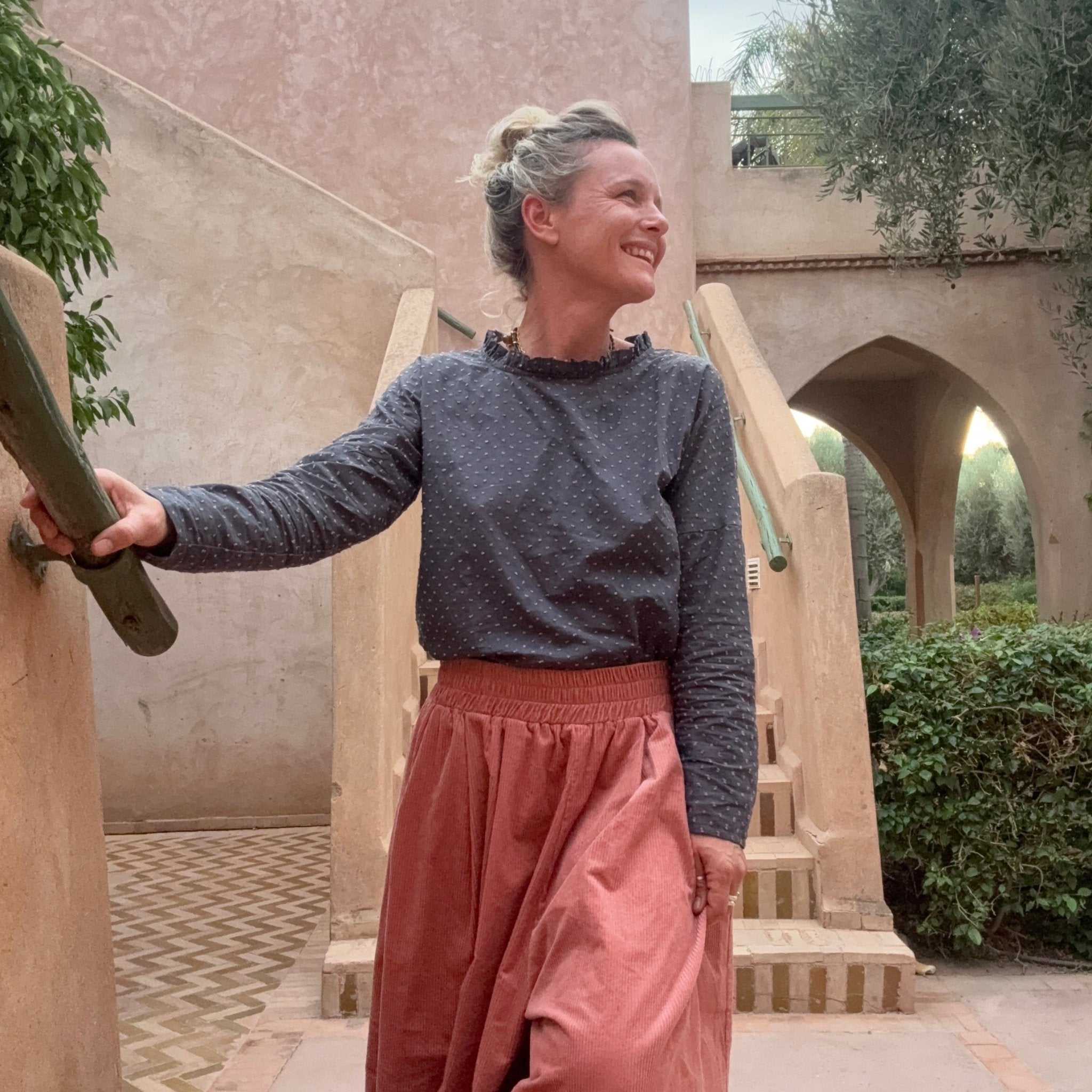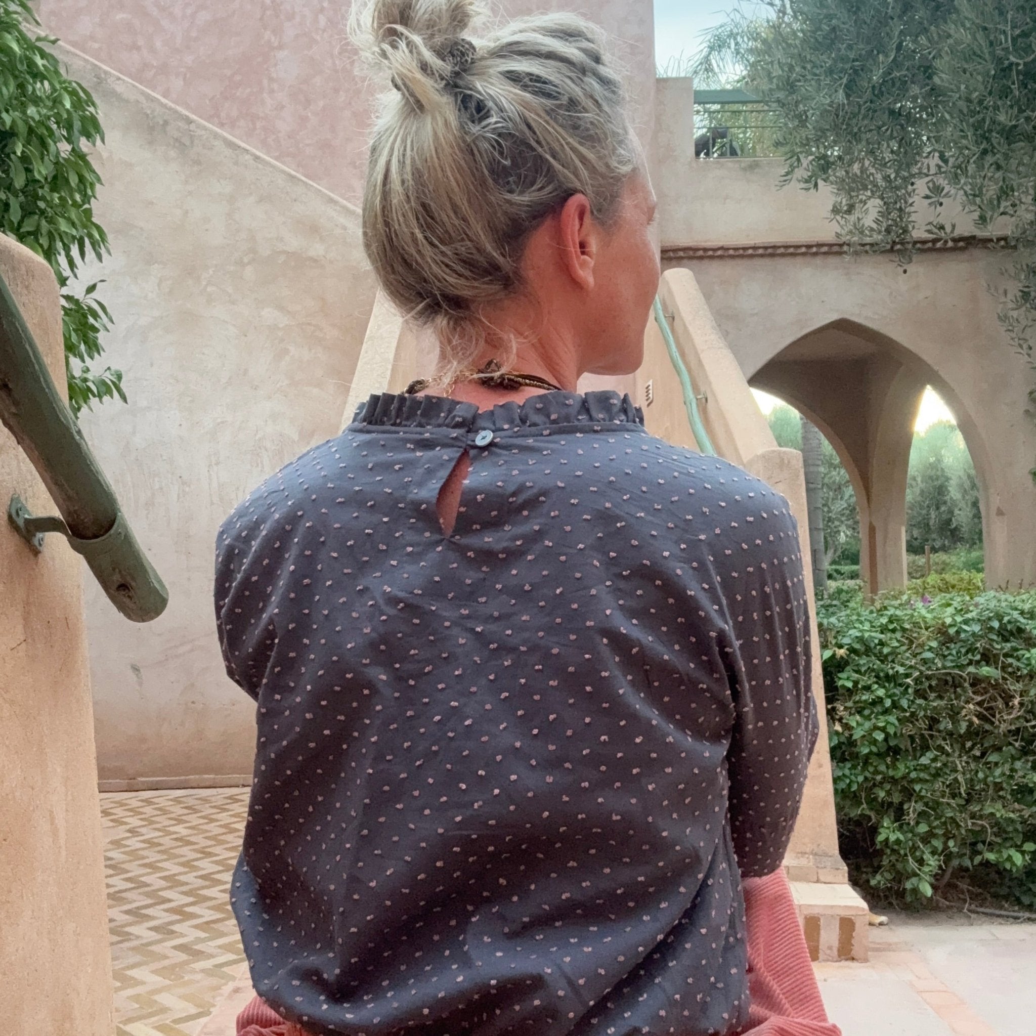 La blouse Janelle charme par sa délicatesse et sa coupe fluide, idéale pour le quotidien comme pour les moments plus habillés. Son col froufrou souligne le visage avec féminité, tandis que la goutte boutonnée dans le dos — fermée par un bouton nacré serti de paillettes — ajoute une touche lumineuse et raffinée. Elle s’enfile aisément par la tête, sans avoir besoin de défaire le bouton.