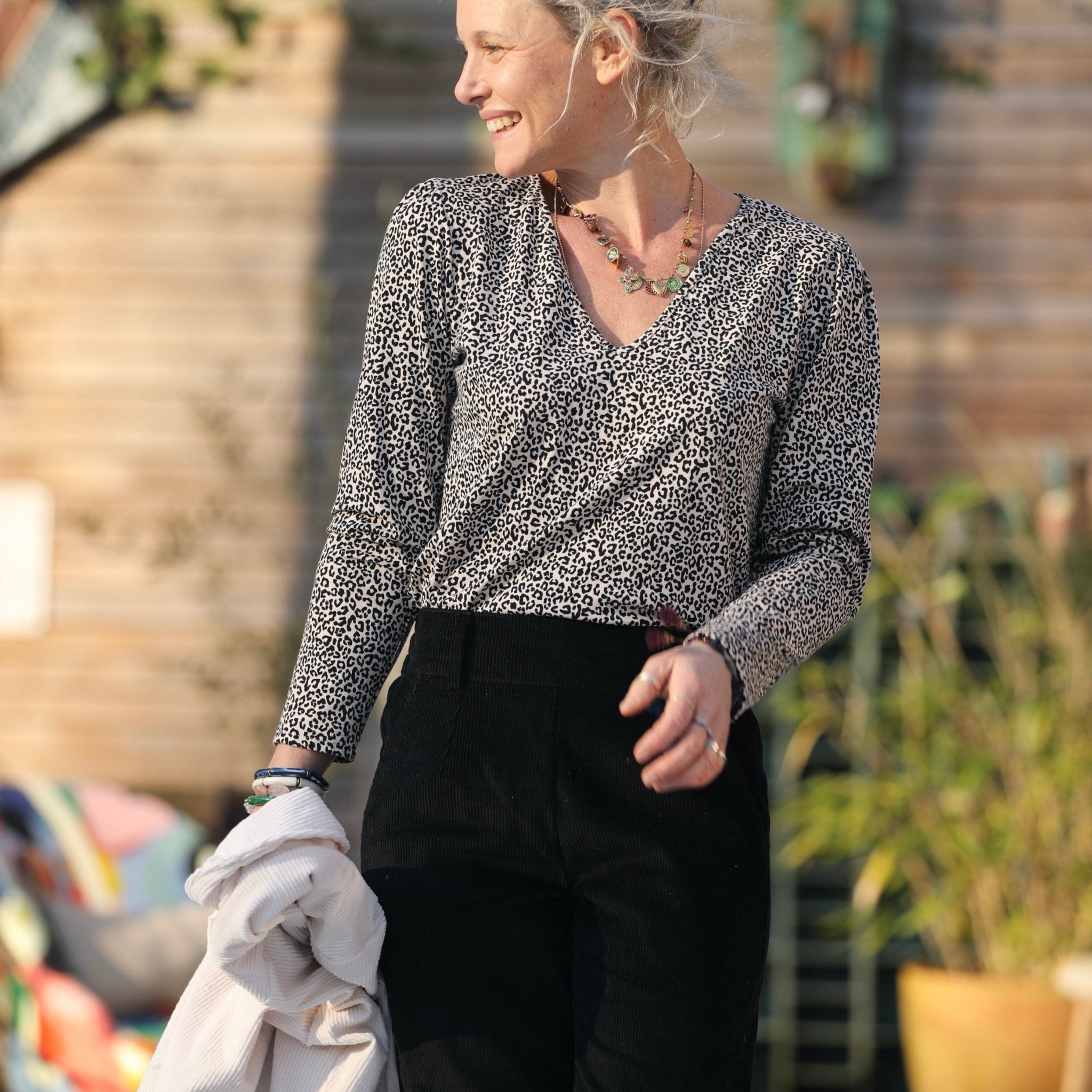 Lalou est un haut raffiné à manches longues, caractérisé par des manches légèrement bouffantes agrémentées de fronces, qui apportent une élégance subtile tout en offrant un confort optimal.
