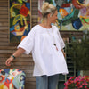 Elle se distingue par son col rond chic, ses manches papillonnantes, ainsi que ses découpes et fronces au-dessus de la poitrine, offrant une allure à la fois casual et subtilement japonisante.