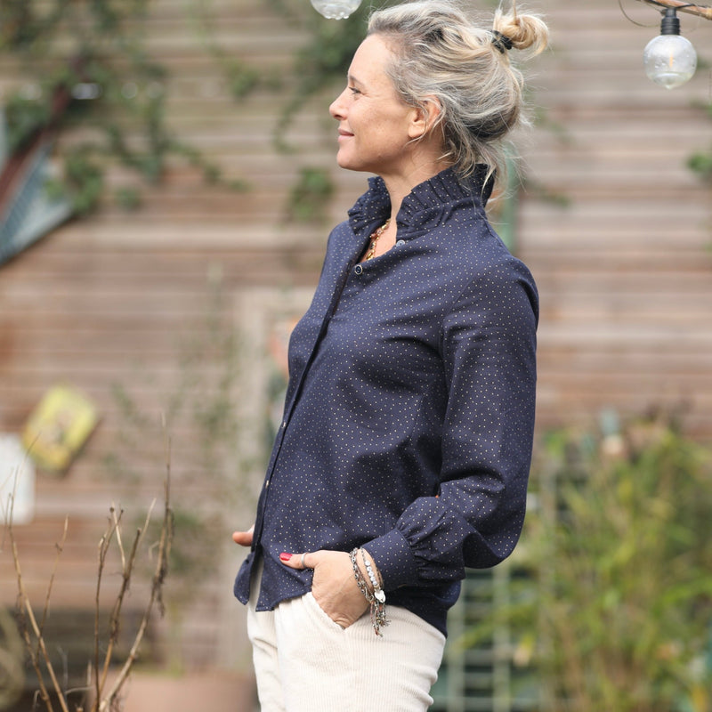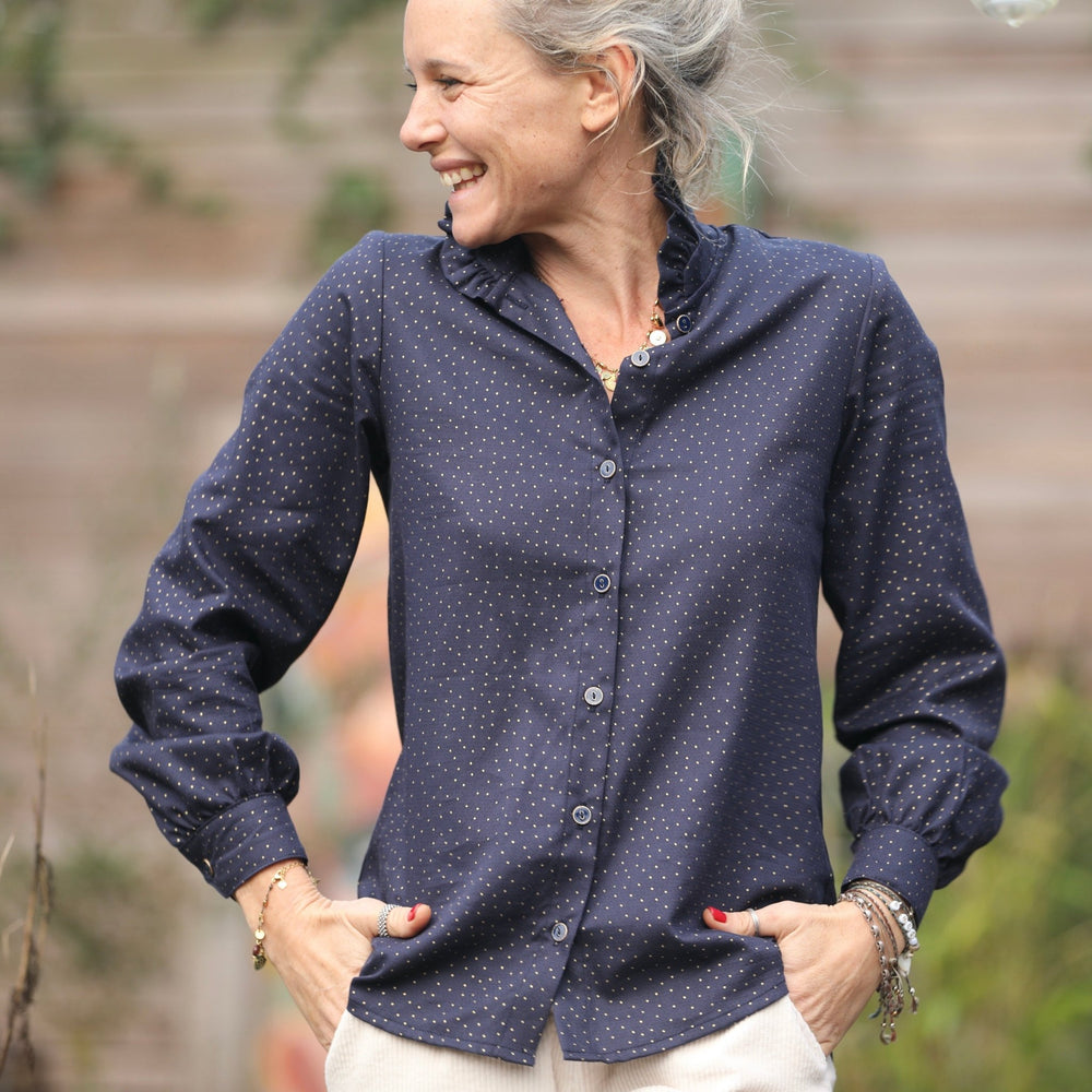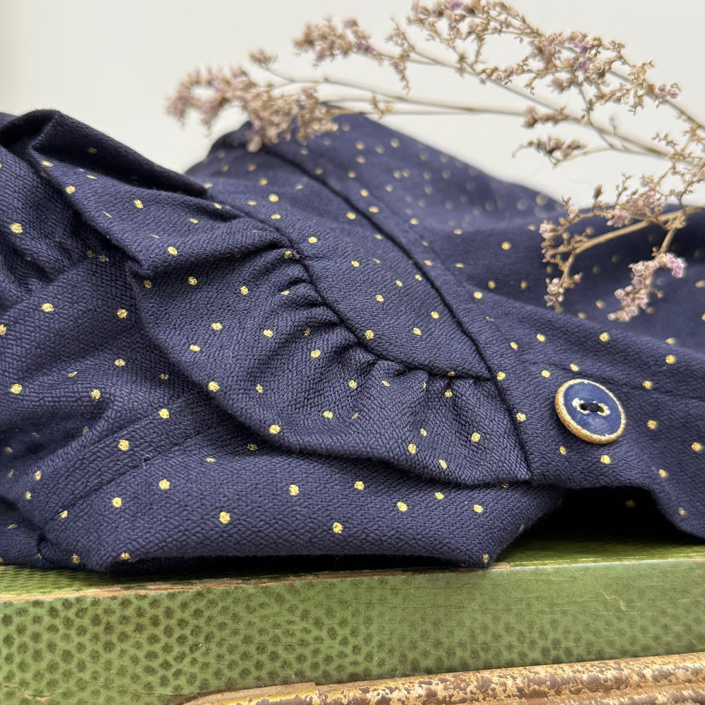Voici la ravissante Marthe petite soeur de Myrtille, pleine d'élégance avec son col à froufrous, rehaussé d'un centimètre cette année, et son décolleté modulable.