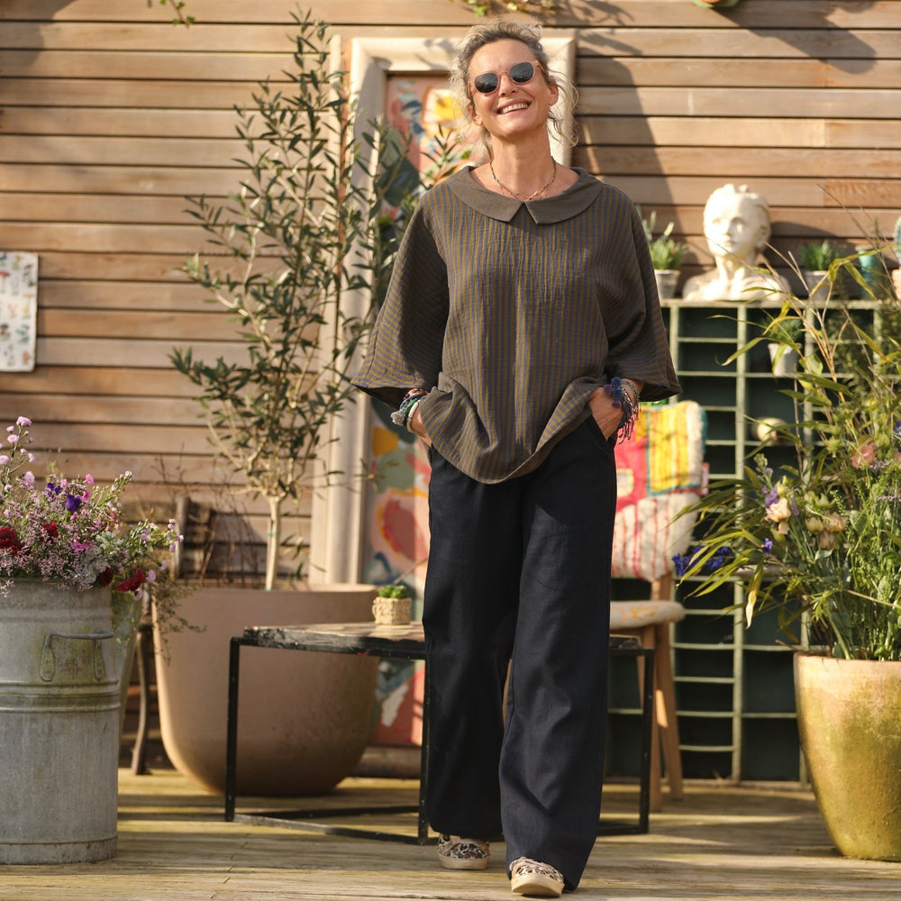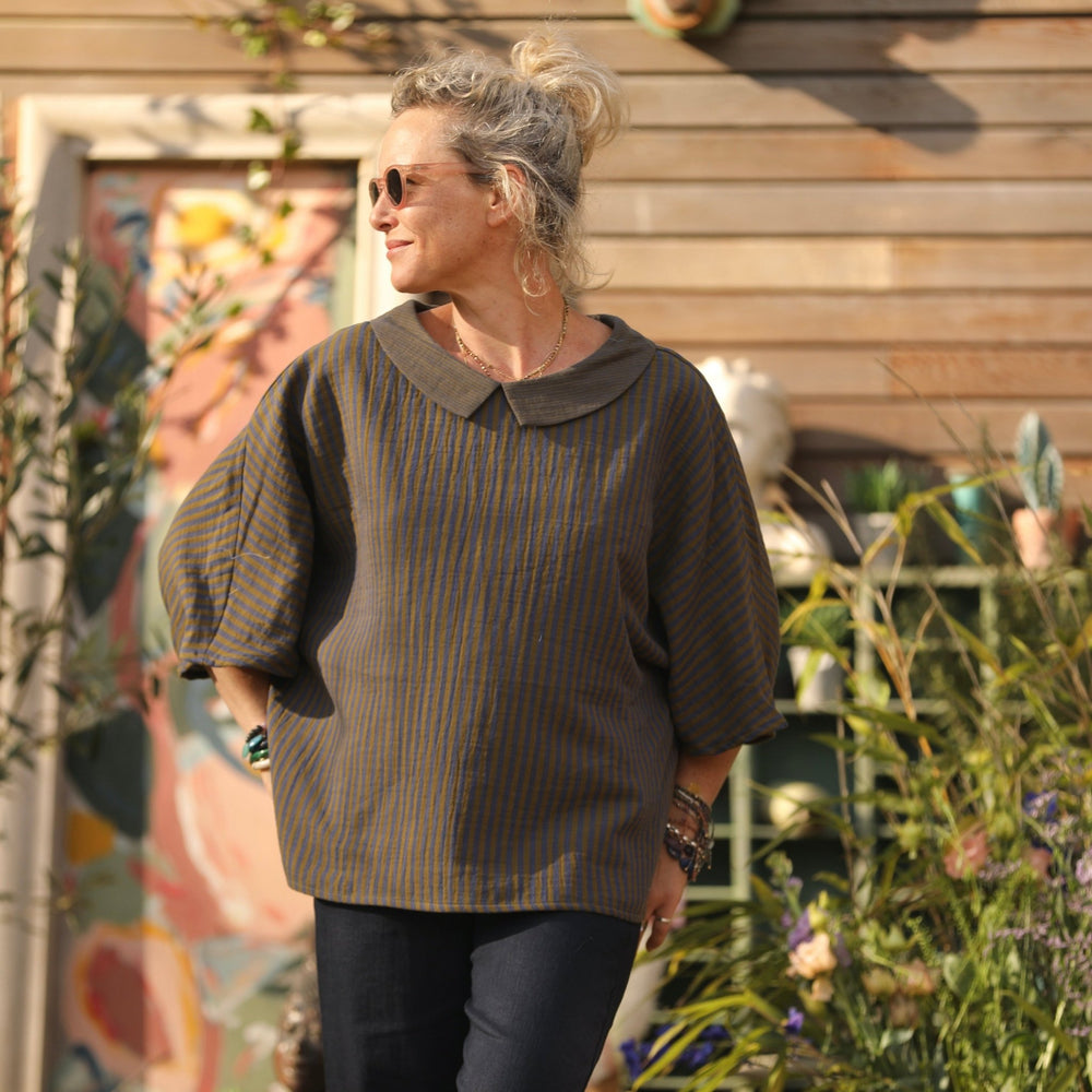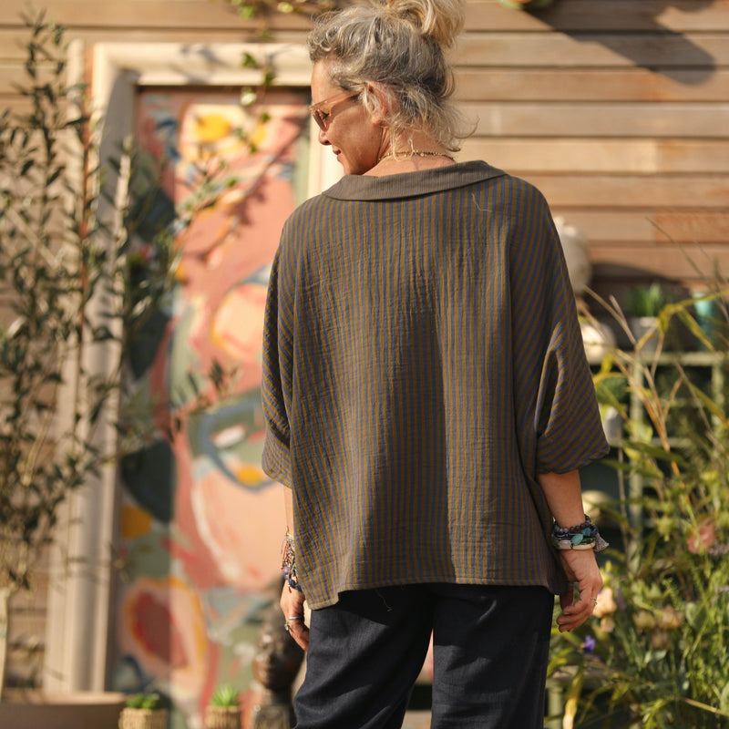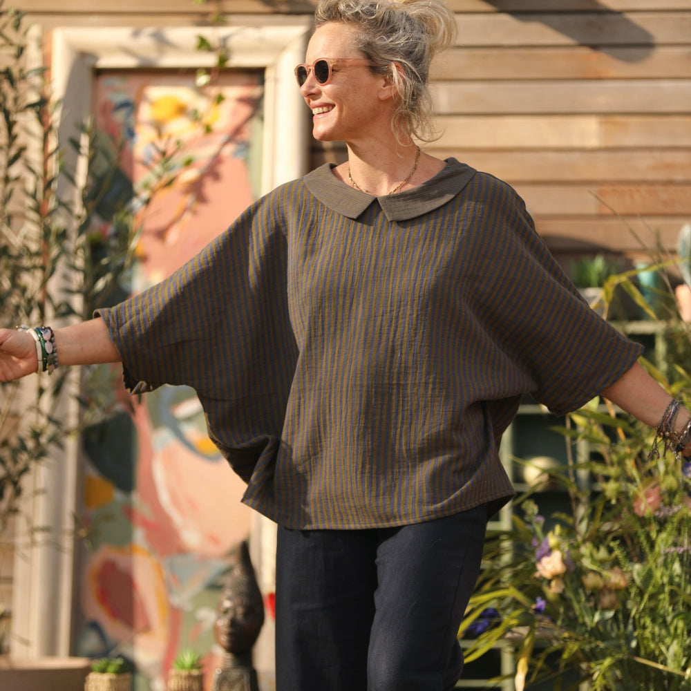 Blouse Myriem - double gaze de coton rayée kaki/marine