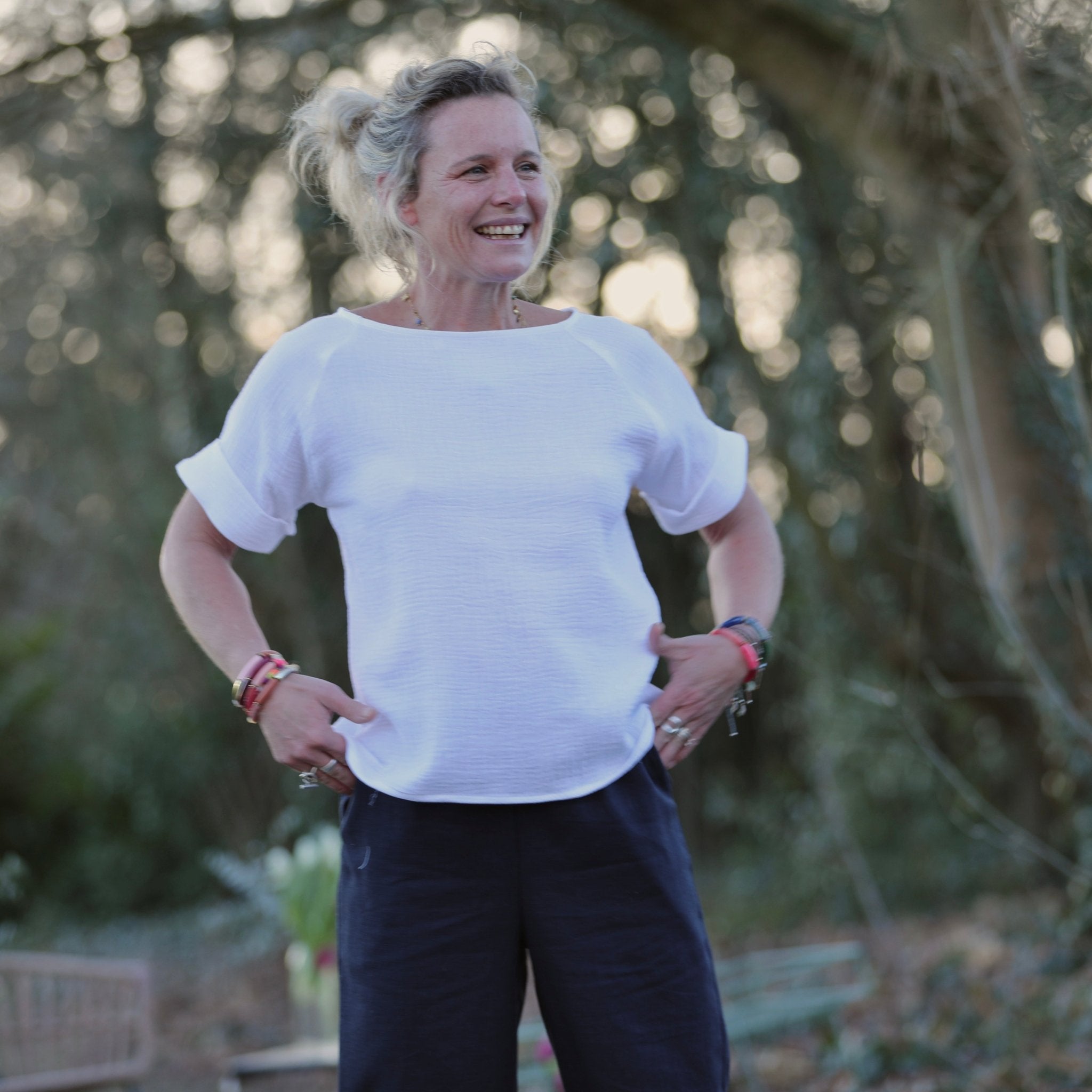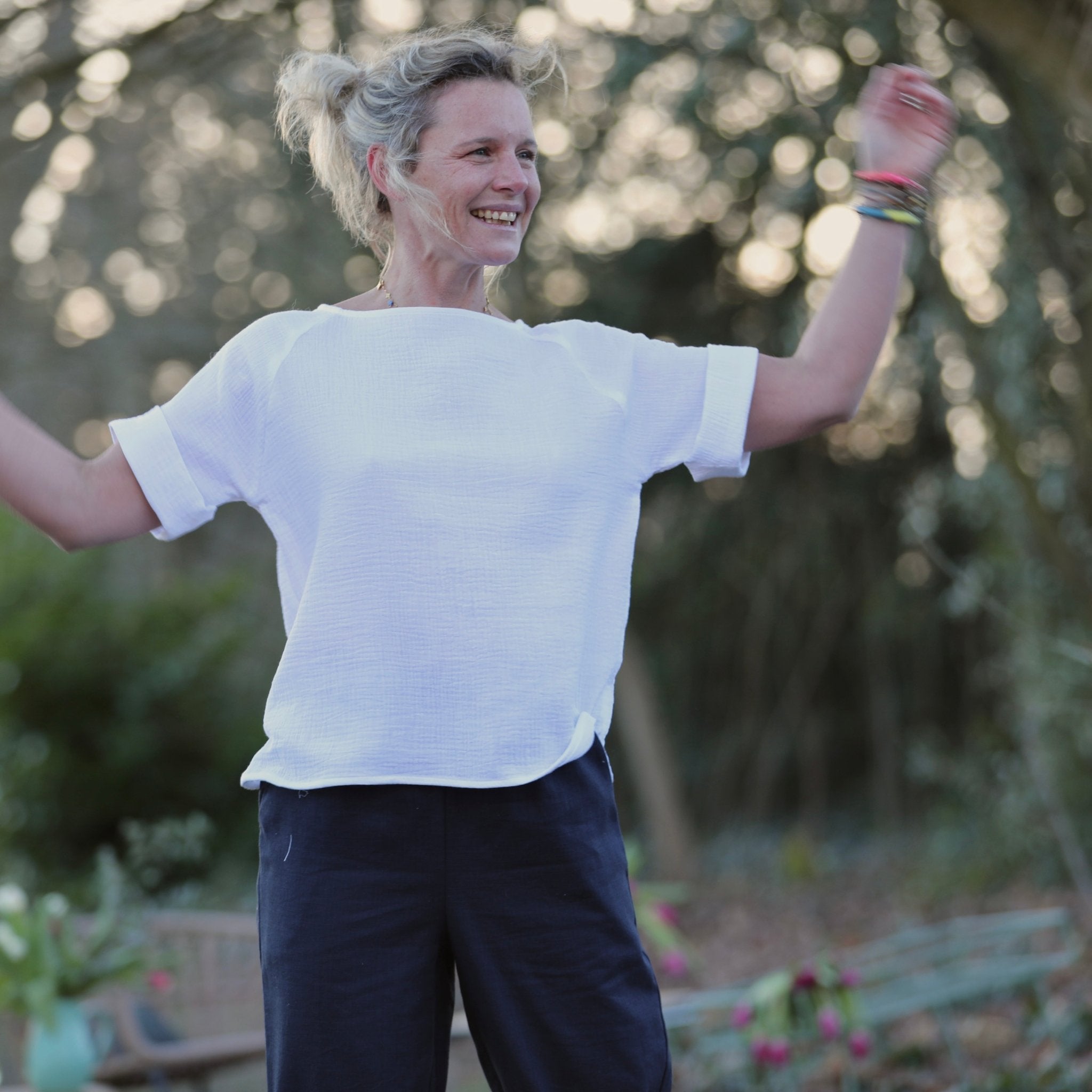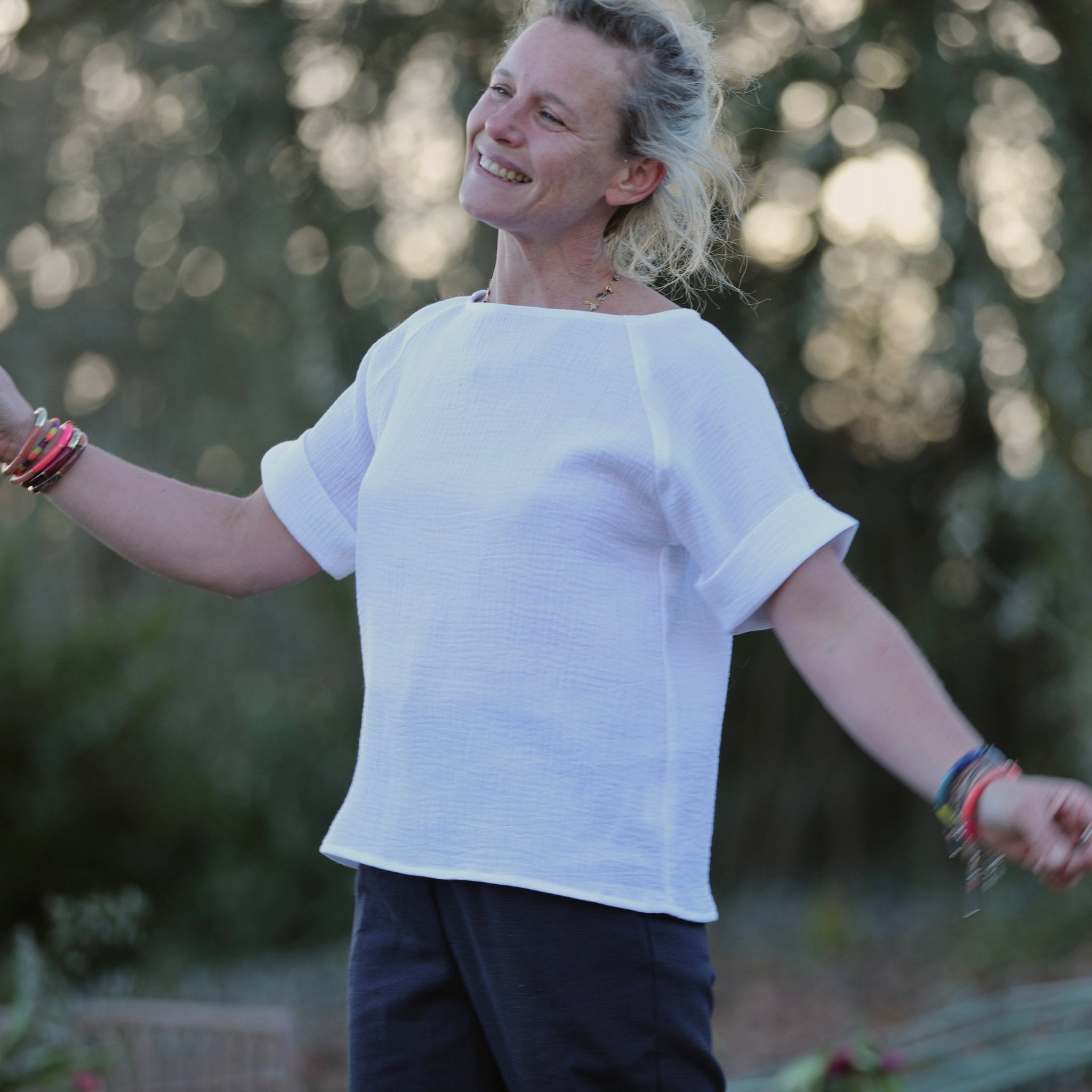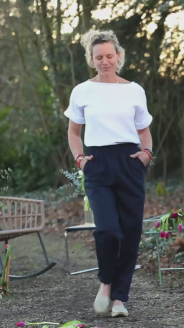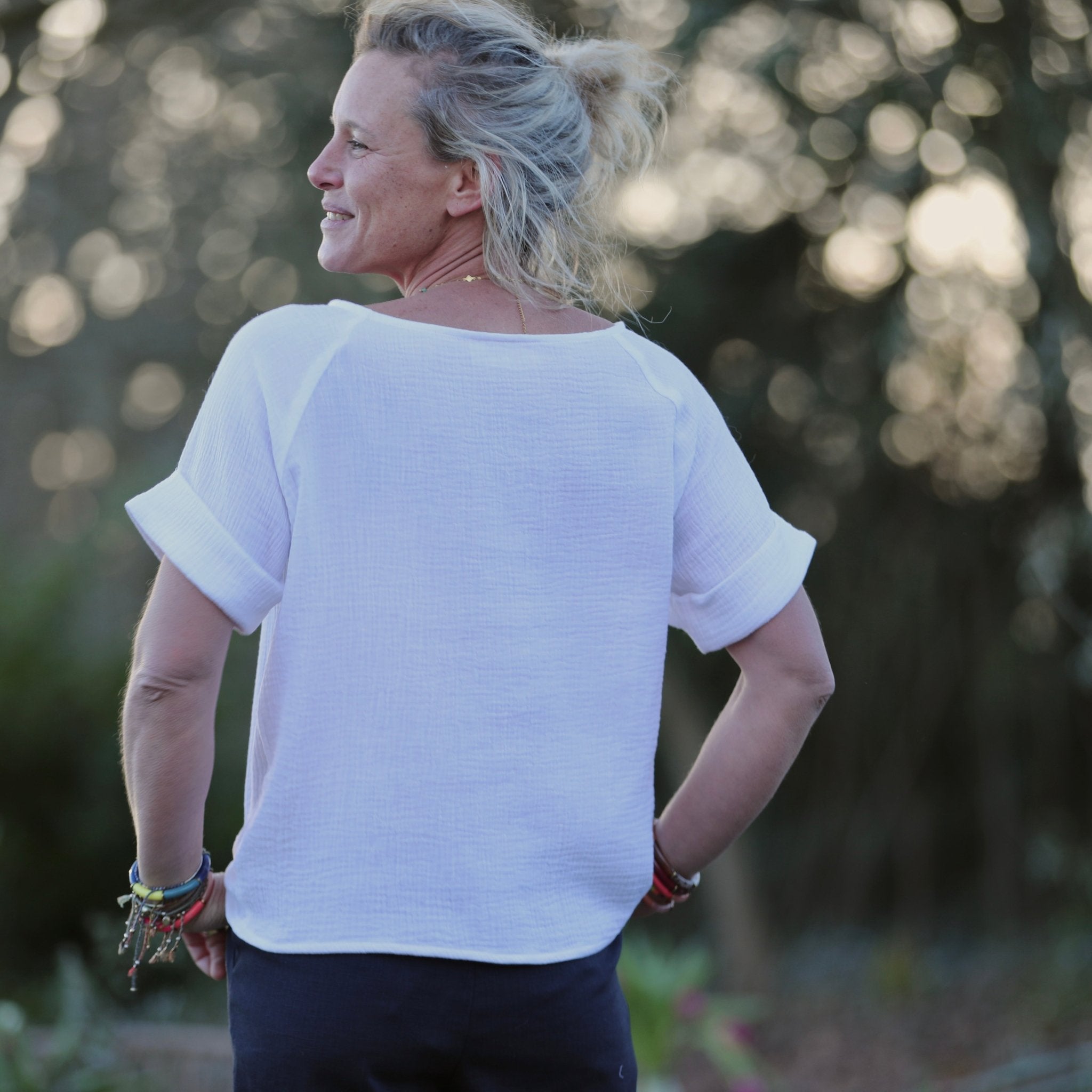 Les manches courtes se terminent par un pli délicat, apportant une touche structurée tout en douceur. Romy est pensée pour se poser simplement au-dessus d’un pantalon ou d’une jupe, créant une silhouette naturelle, lumineuse et élégante, signature du vestiaire Quintessence.
