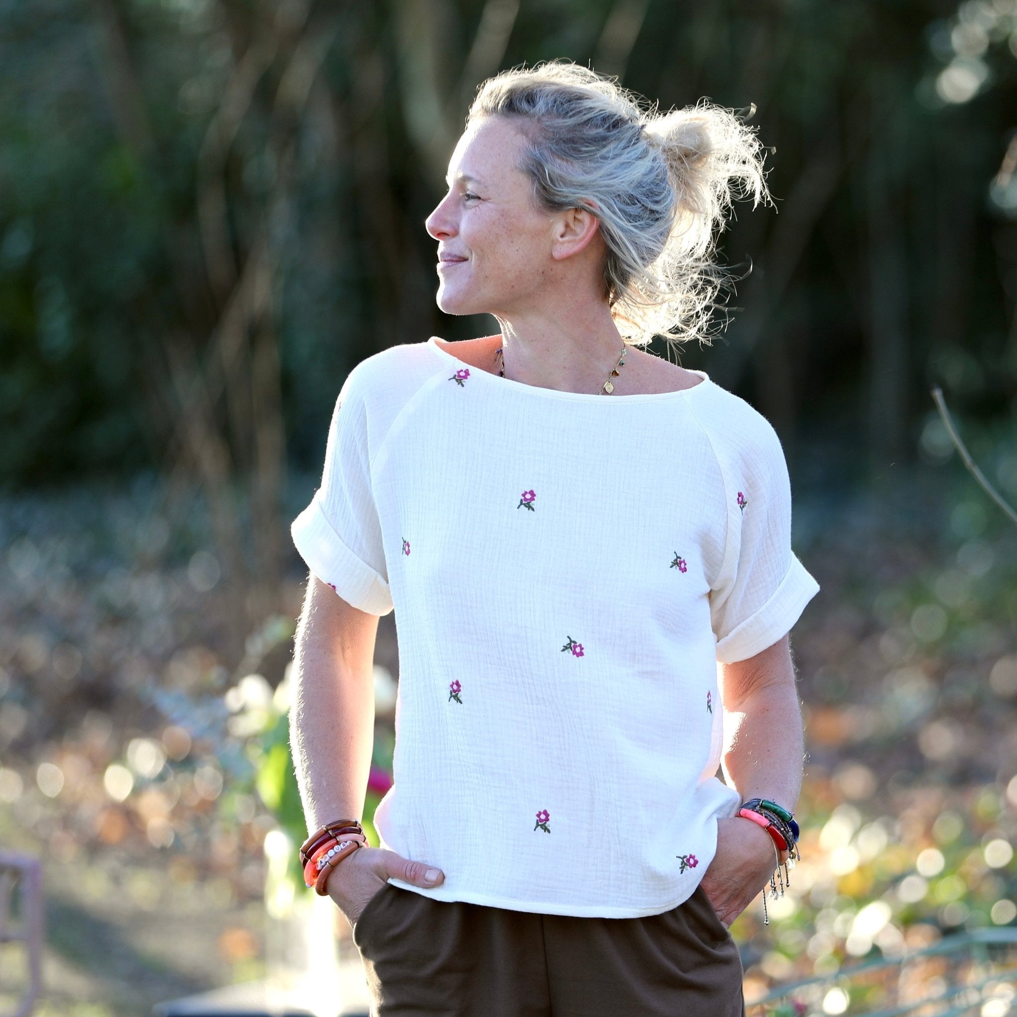 Les manches courtes se terminent par un pli délicat, apportant une touche de structure tout en légèreté. Romy est pensée pour se poser facilement au-dessus d’un pantalon ou d’une jupe, créant une silhouette naturelle, douce et élégante, signature du vestiaire Quintessence.