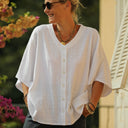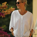 Les manches larges et le décolleté en V, orné de jolis boutons de nacre blancs sertis de paillettes, ajoutent une touche de sophistication.