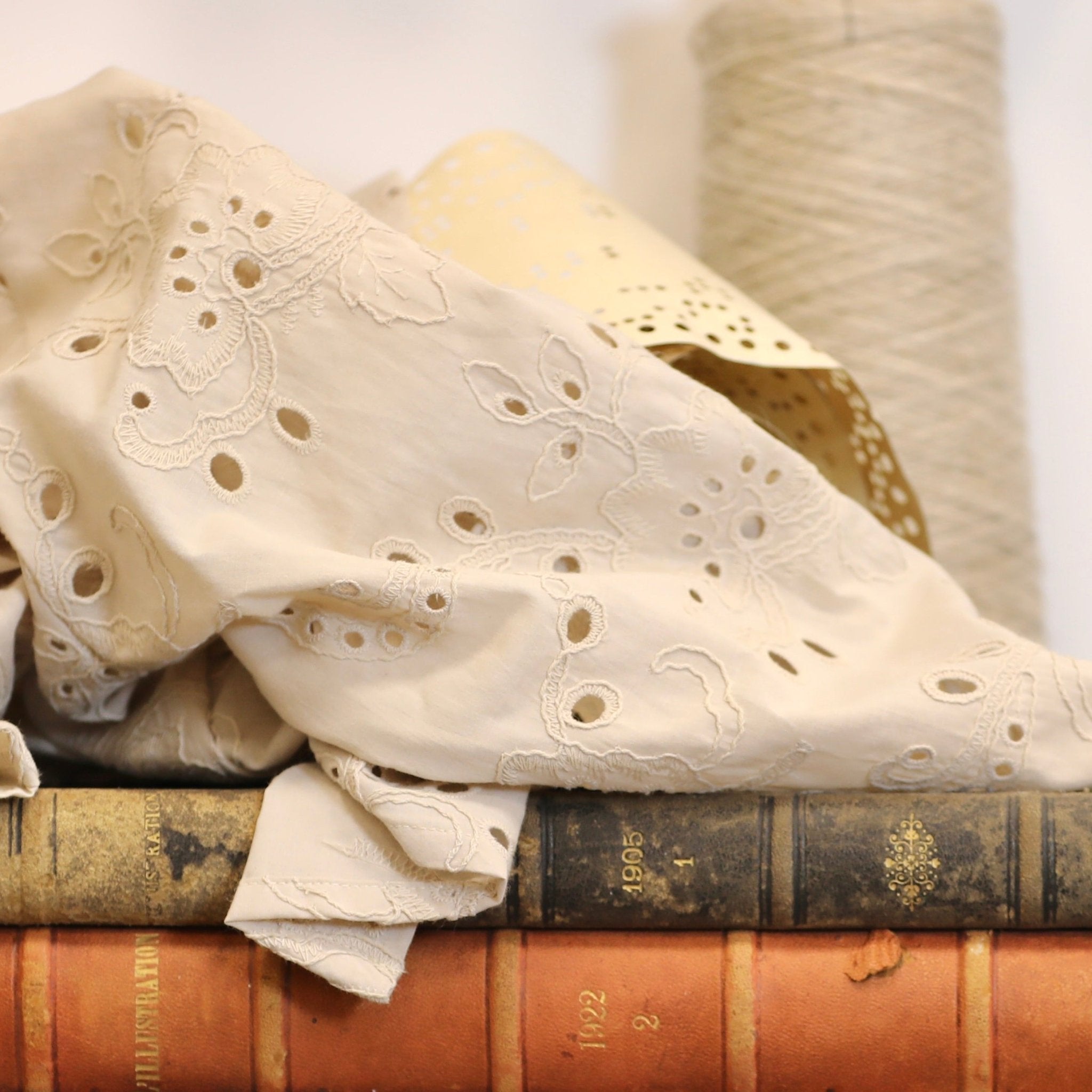 Confectionné dans un coton brodé ajouré couleur ficelle, ce tissu joue sur les pleins et les vides grâce à ses broderies florales découpées. La matière est douce, respirante et légèrement texturée, avec un esprit artisanal et romantique. Le relief de la broderie apporte du caractère tout en restant très facile à porter.
