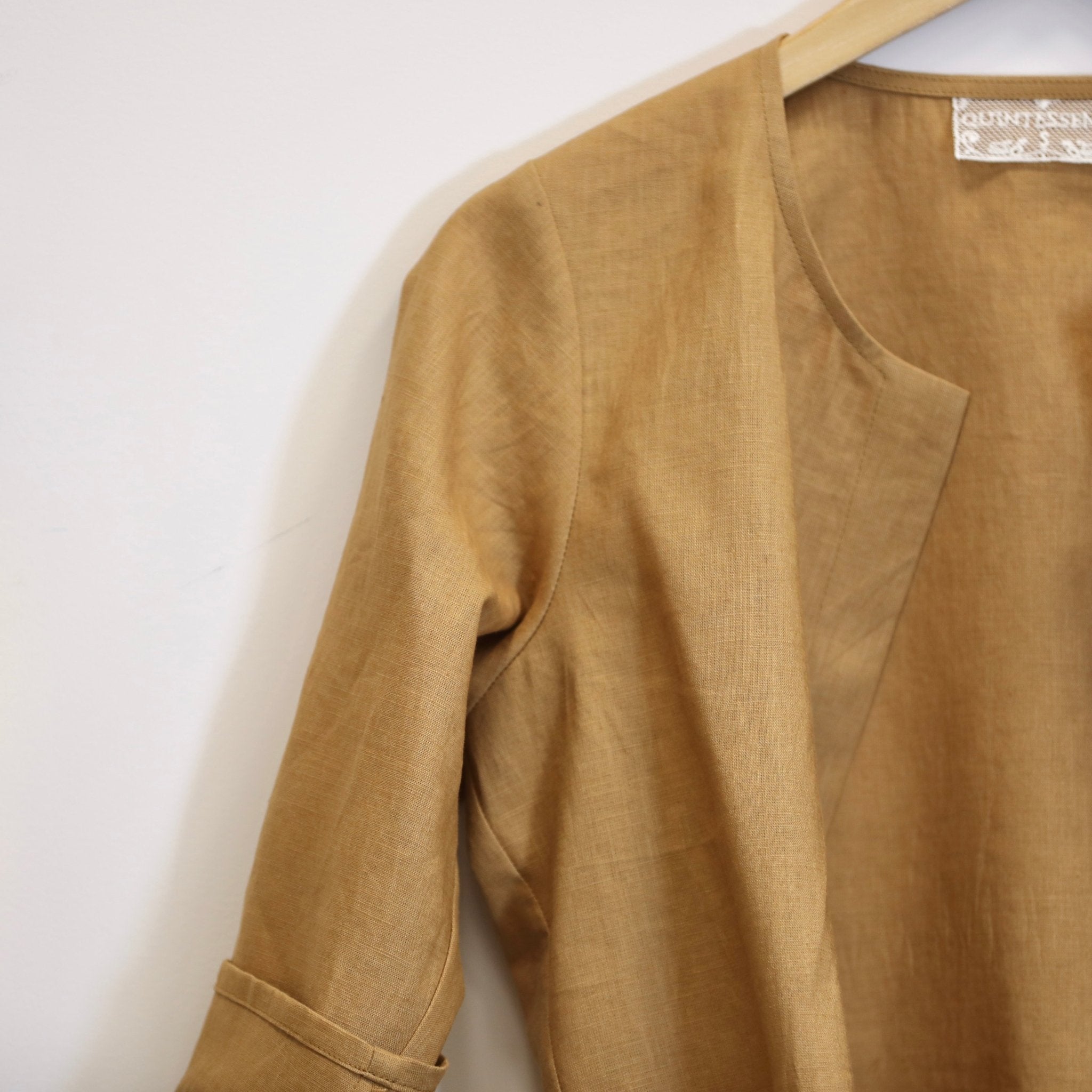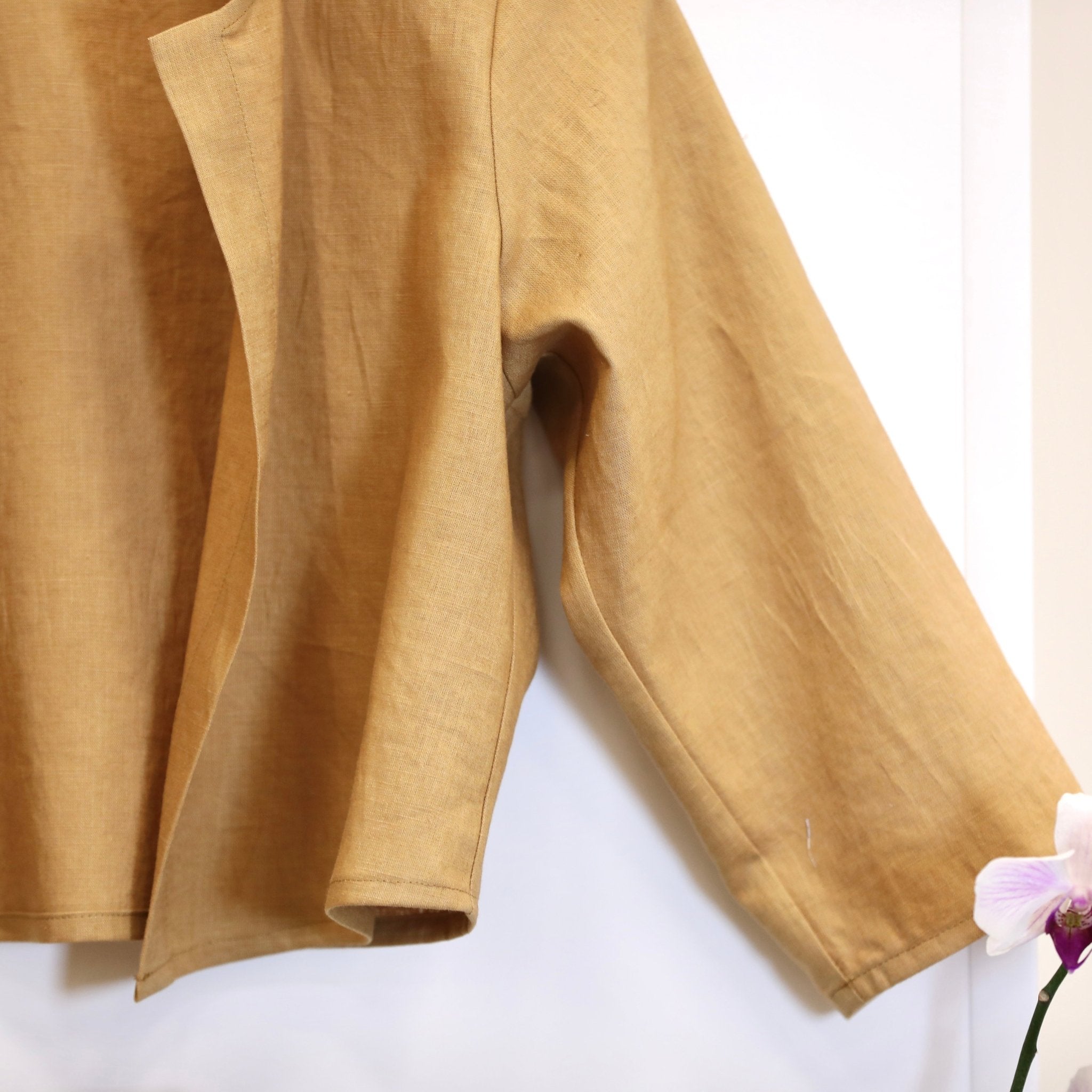 Confectionné dans un lin couleur cassonade, ce tissu possède une belle tenue tout en gardant la souplesse naturelle du lin. Sa texture légèrement vivante et son tombé structuré apportent du caractère à la pièce. La teinte cassonade, chaude et naturelle, illumine la silhouette tout en restant facile à associer.