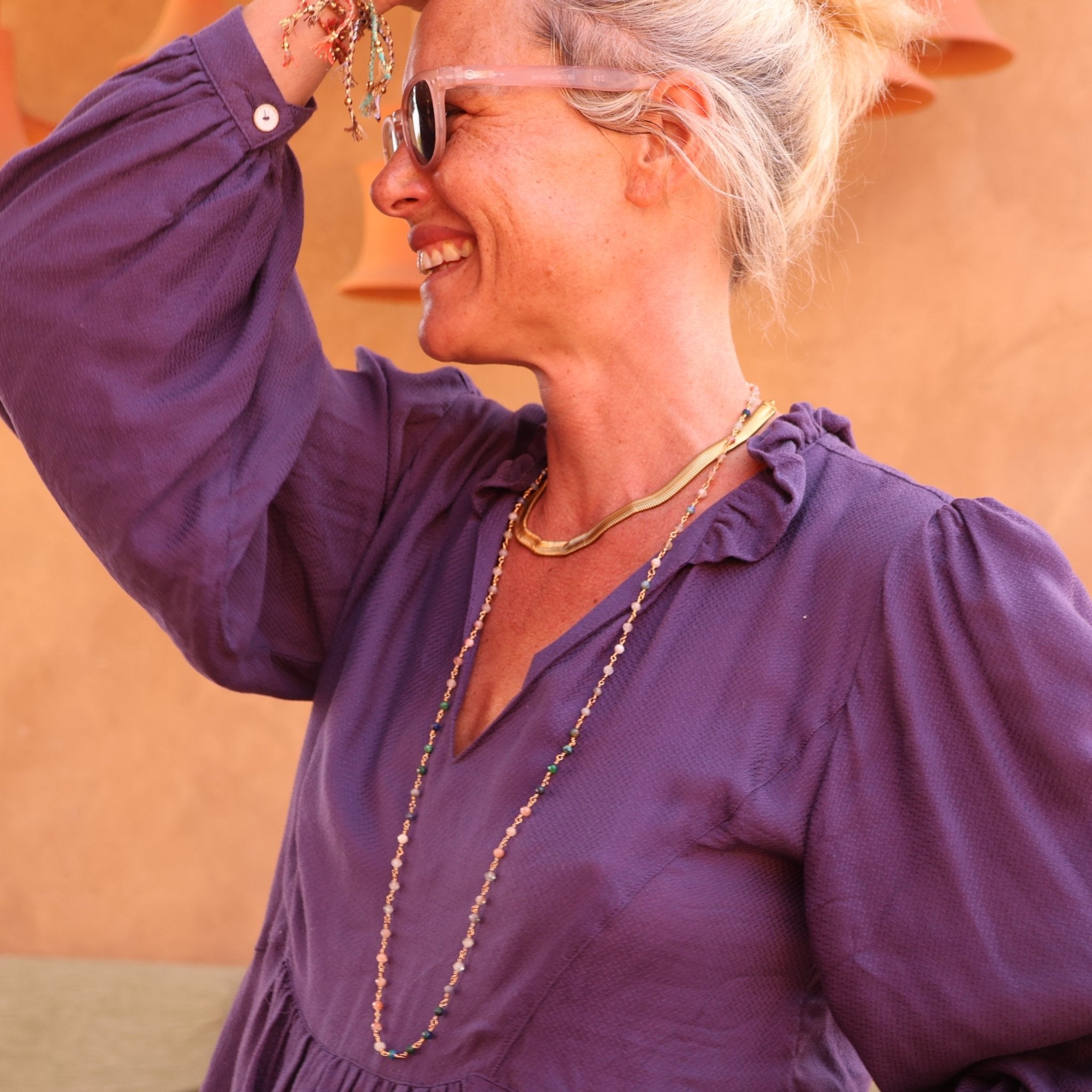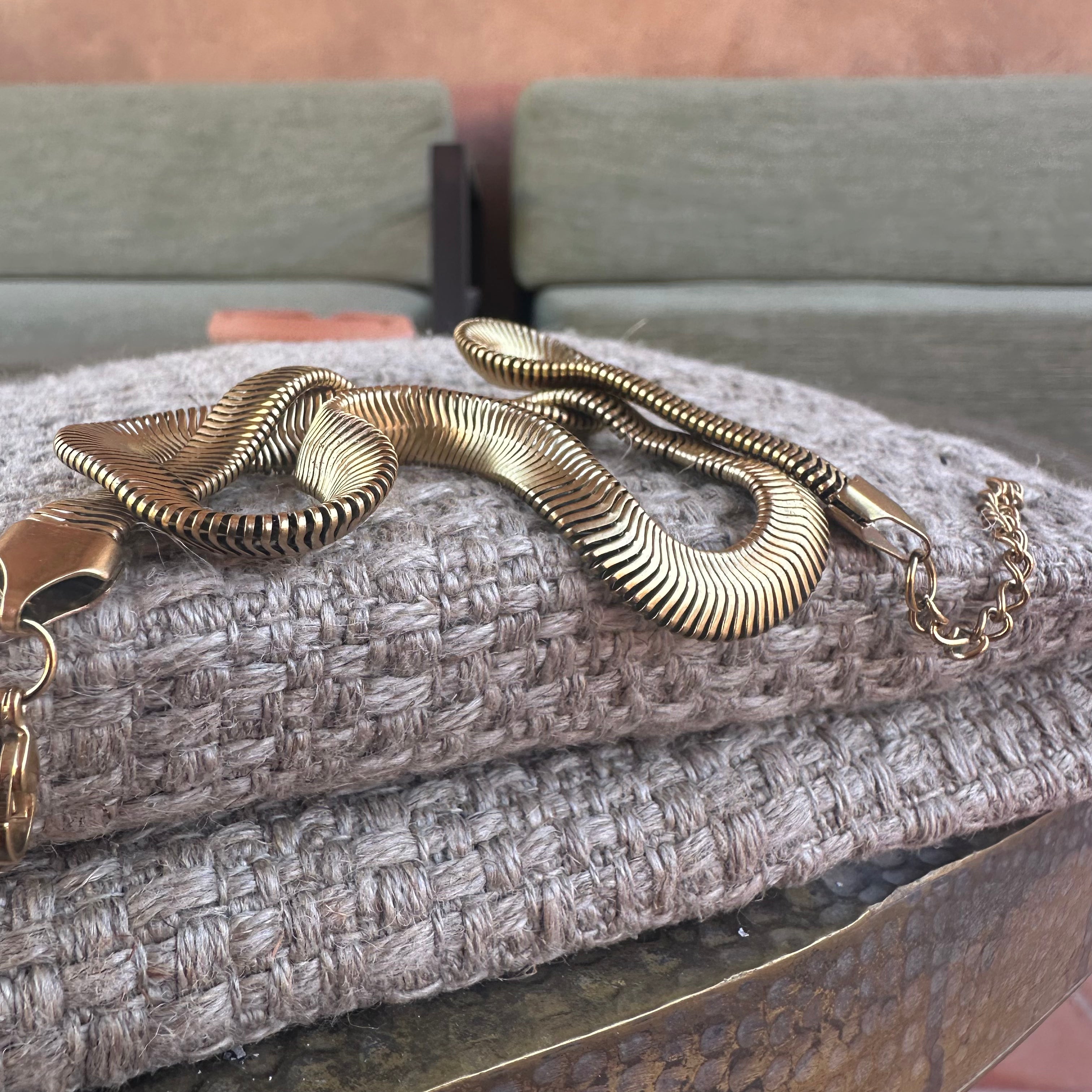 "Compassion" est un collier court en maille serpent, ajoutant féminité et lumière à vos tenues estivales.