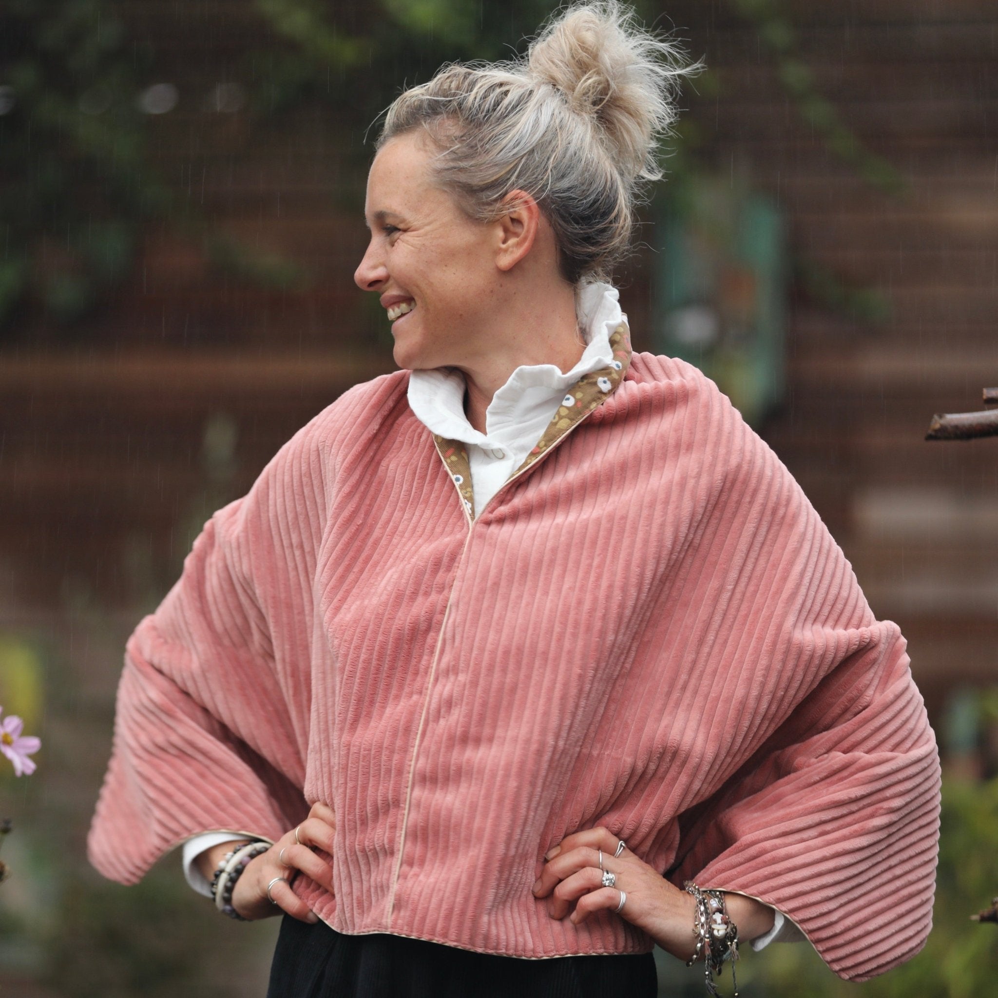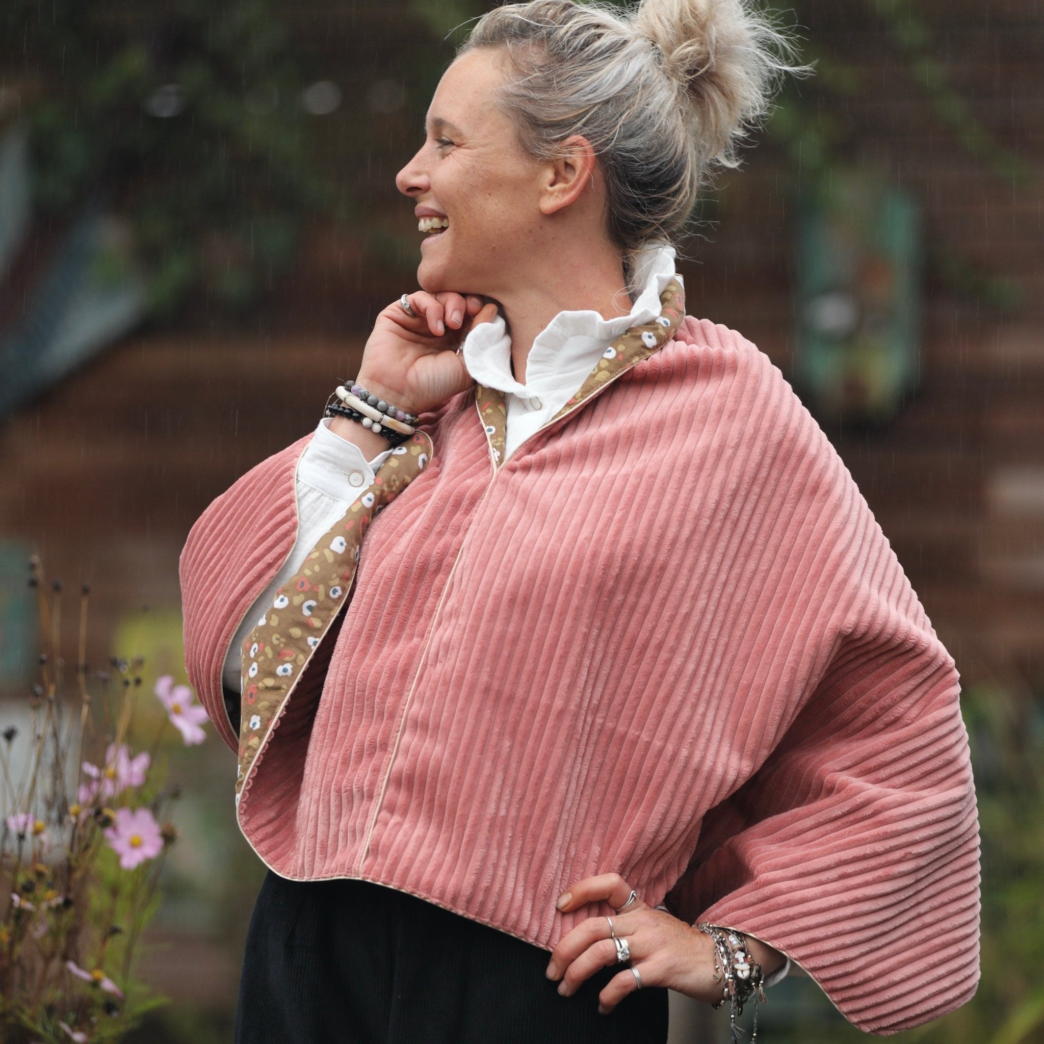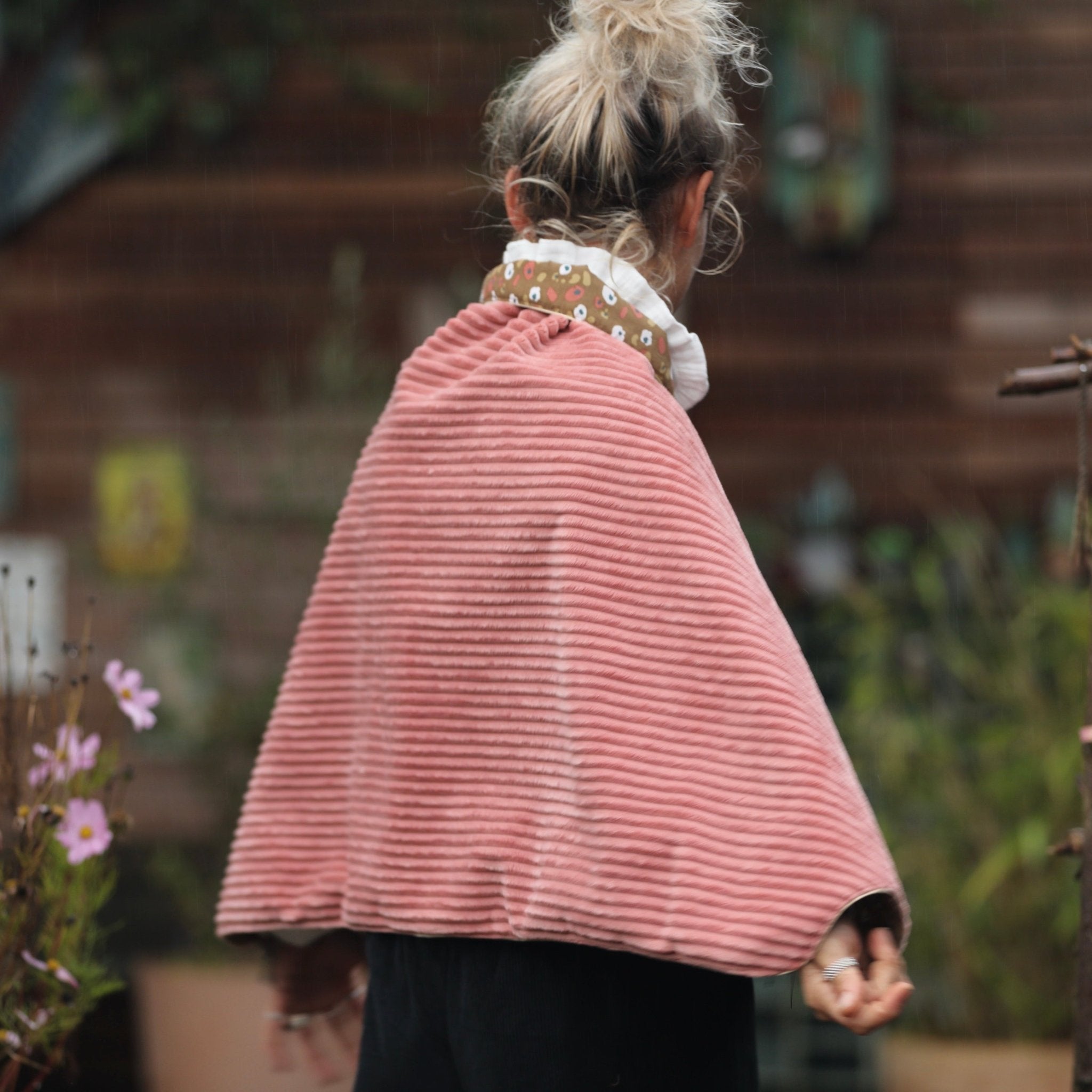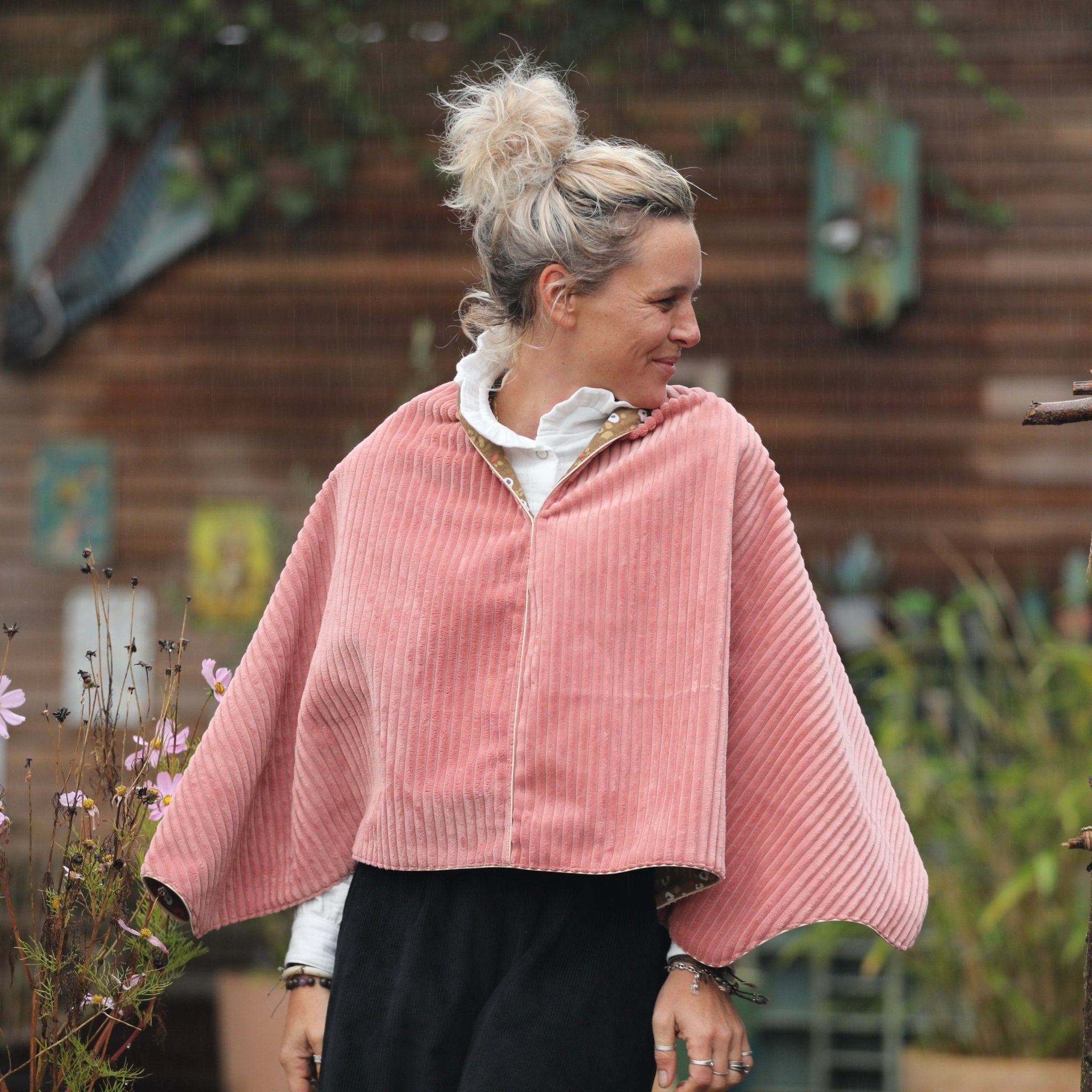 Cape courte Eugénie - velours grosse côtes rose boisé/velours léo kiwi