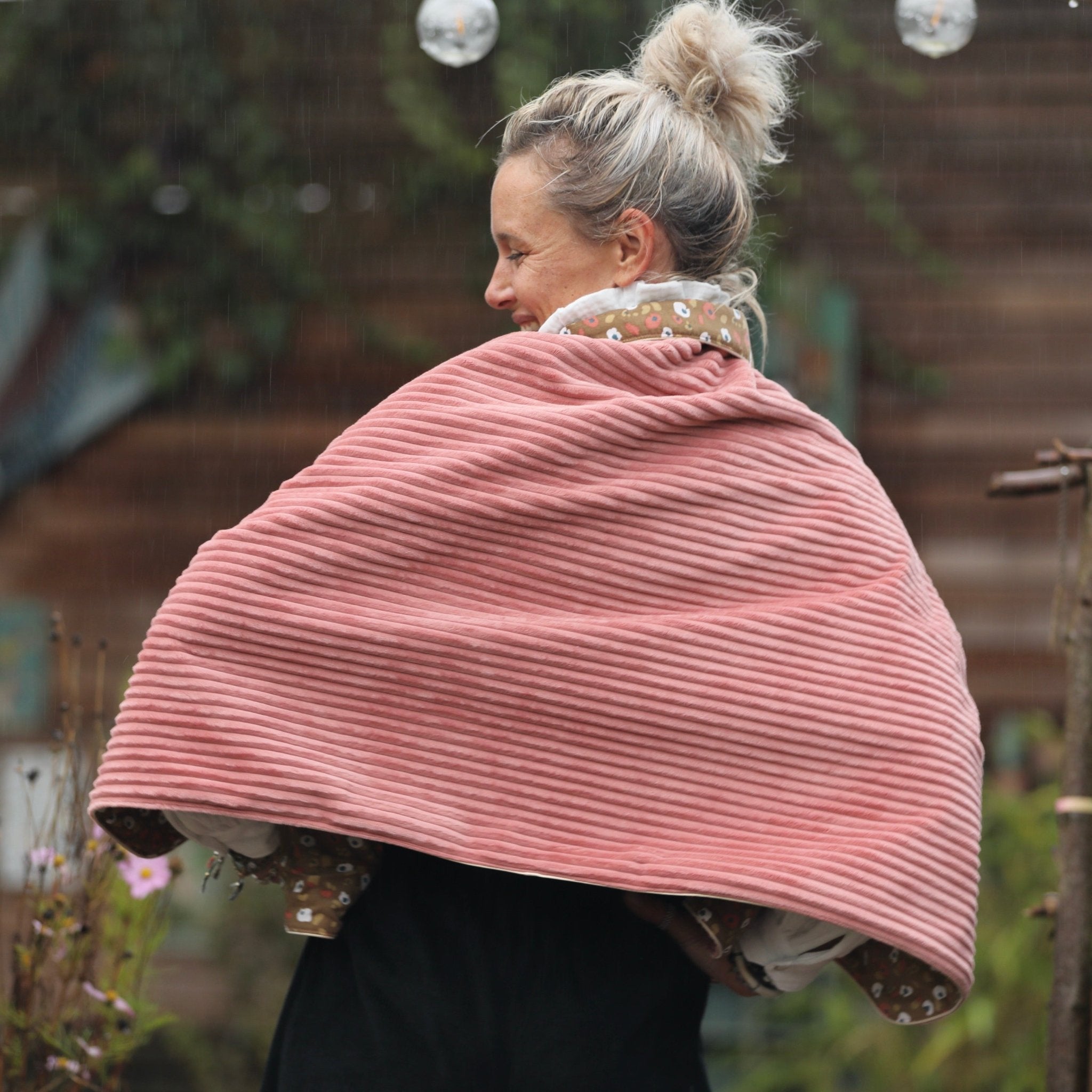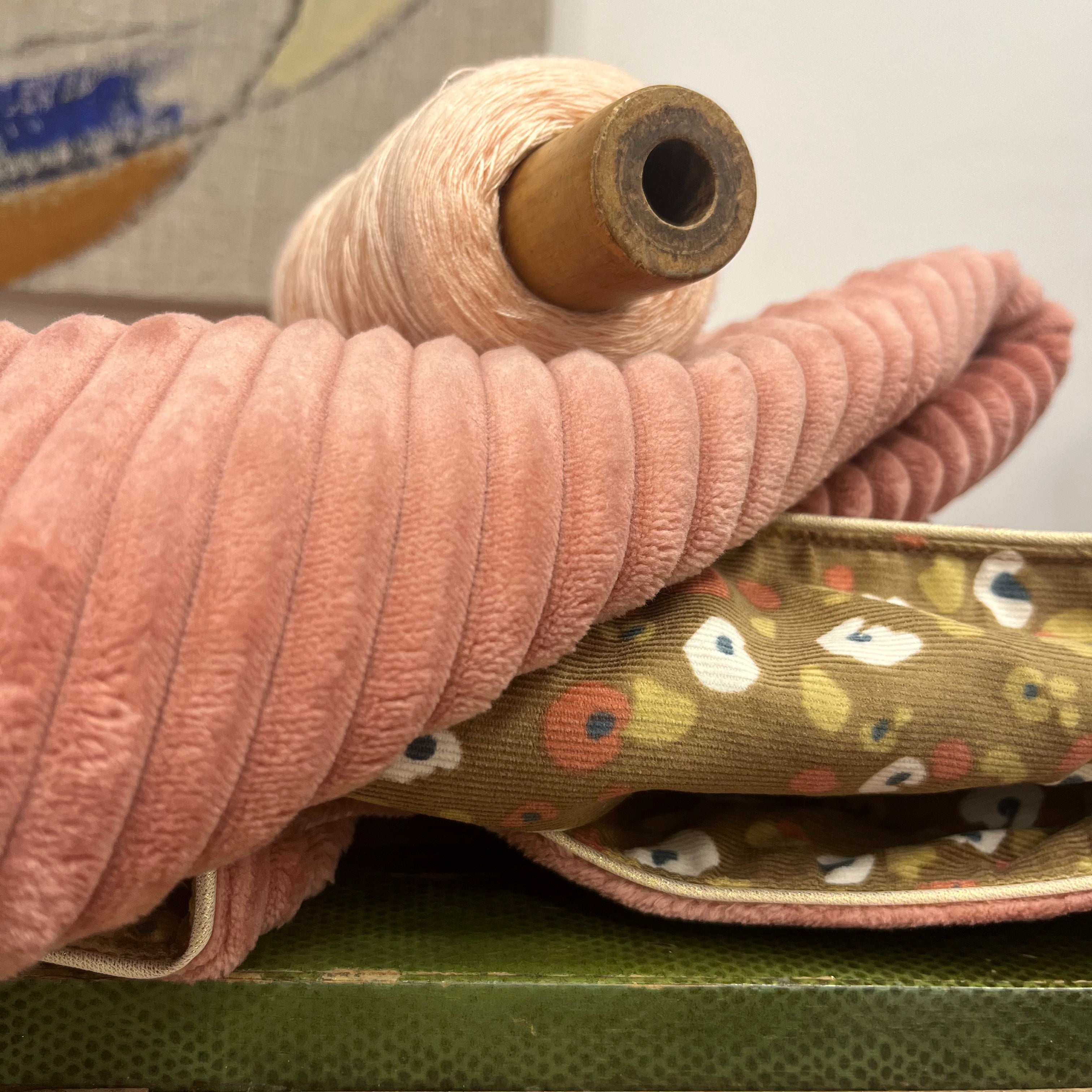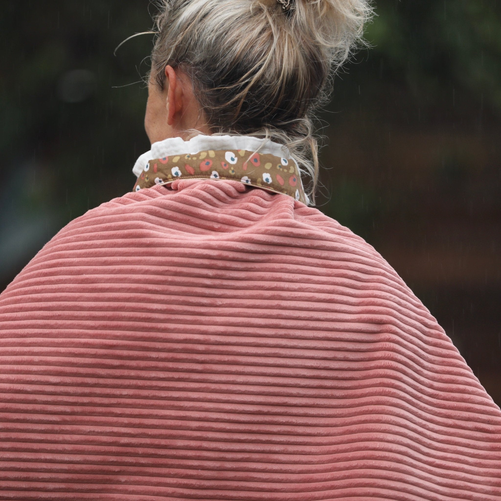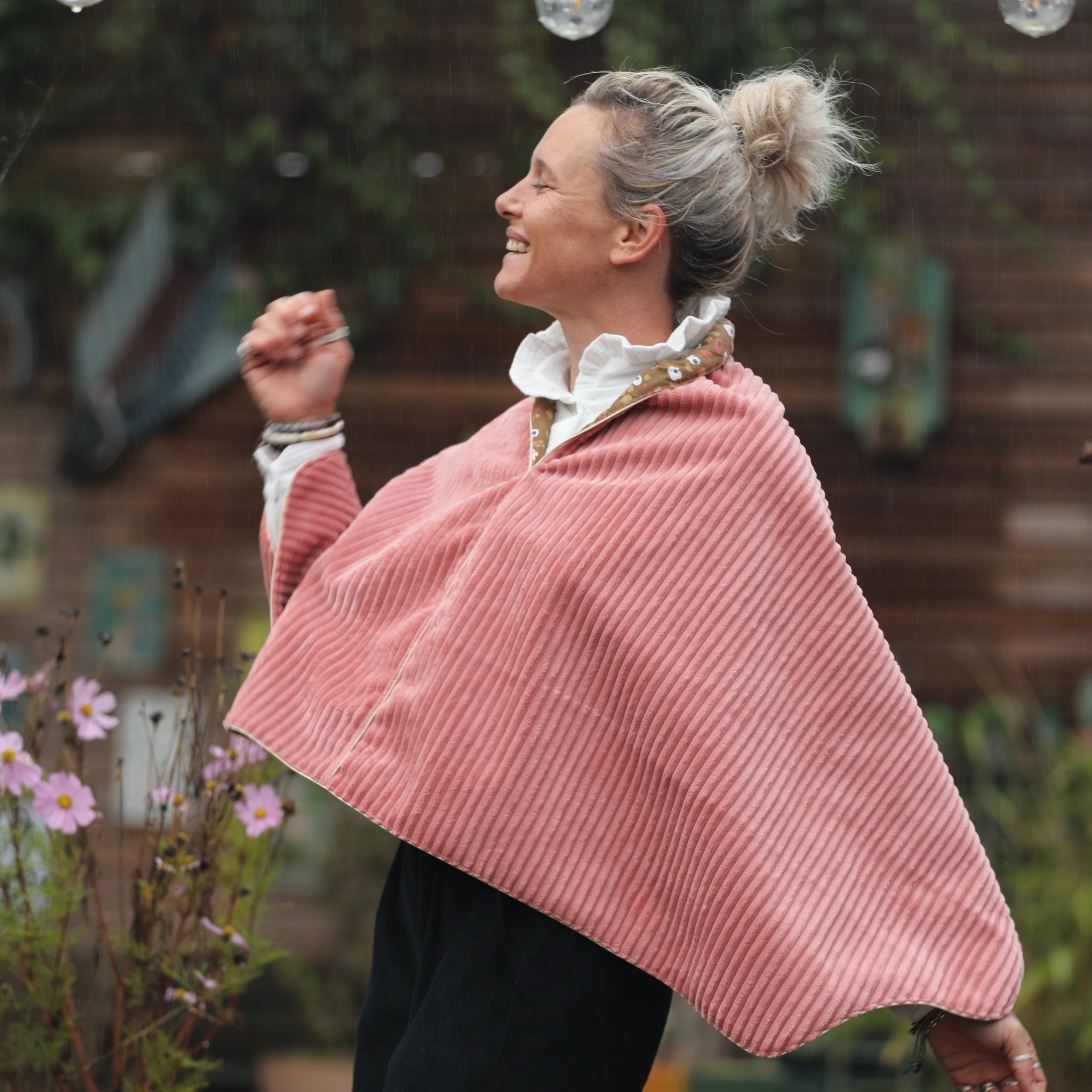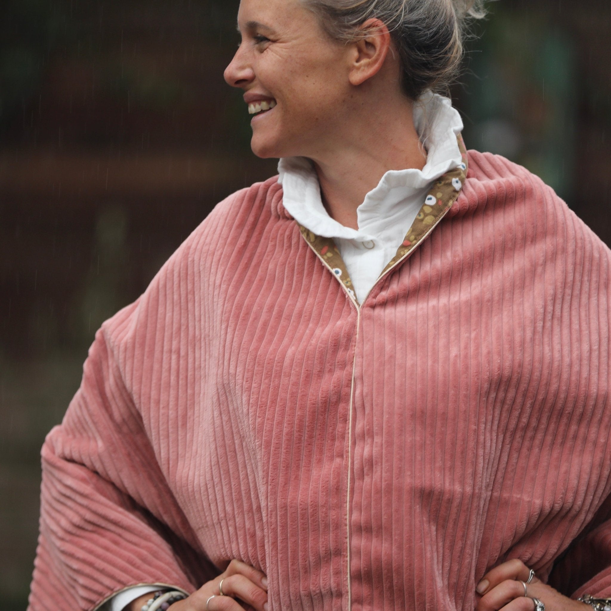 Cape courte Eugénie - velours grosse côtes rose boisé/velours léo kiwi