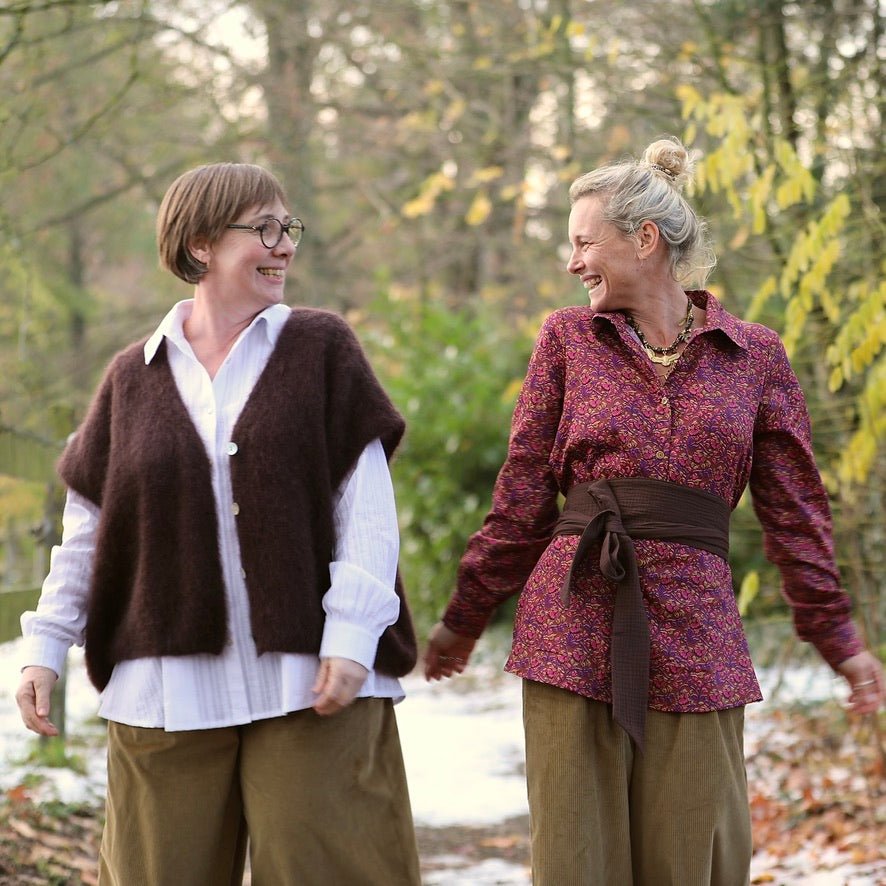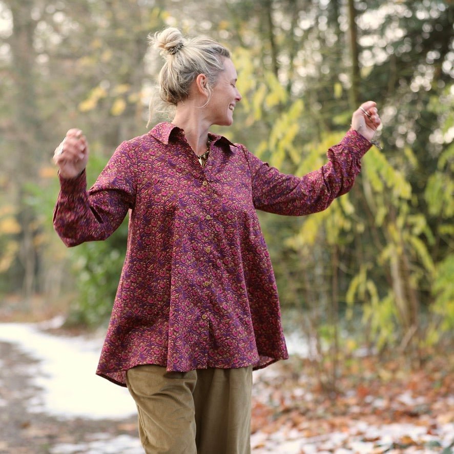 La chemise Caroline se dévoile dans un somptueux satin de coton Jardin Épicé, un imprimé chaleureux mêlant nuances prune, ocre et chocolat. Sa texture lisse et légèrement satinée offre un confort agréable et une luminosité subtile qui illumine la silhouette.