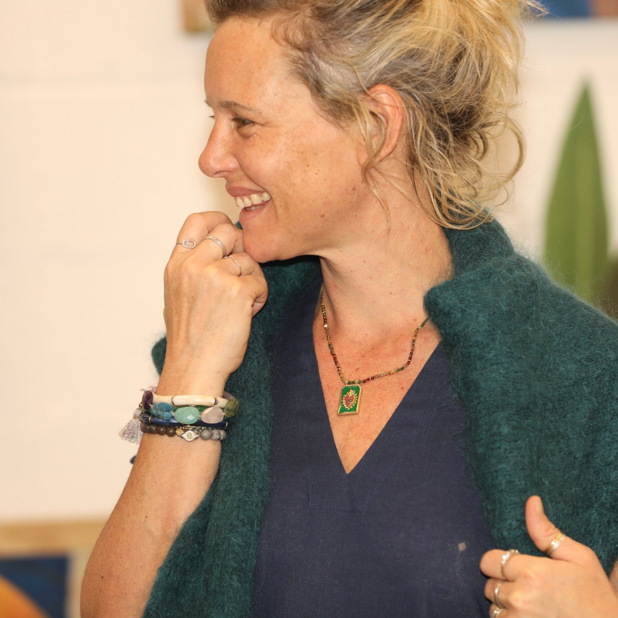 Le collier Flamme vert se compose d'une chaîne alliant pierres semi-précieuses et perles en acier inoxydable, agrémentée d'un poisson émaillé aux teintes rose et vert.
