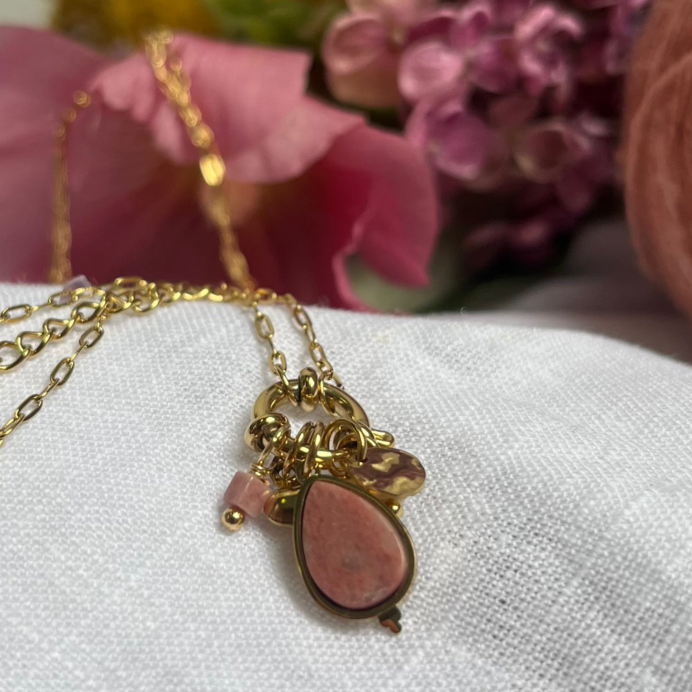 Frisson est une longue chaîne avec une grappe de gris-gris, où rodhonite terracotta est la pierre principale.