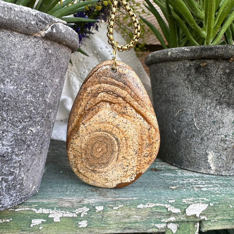 La jaspe paysage est prisée en lithothérapie pour son potentiel à aider à la concentration, à renforcer la connexion avec la nature, et à promouvoir la stabilité émotionnelle et la croissance personnelle.