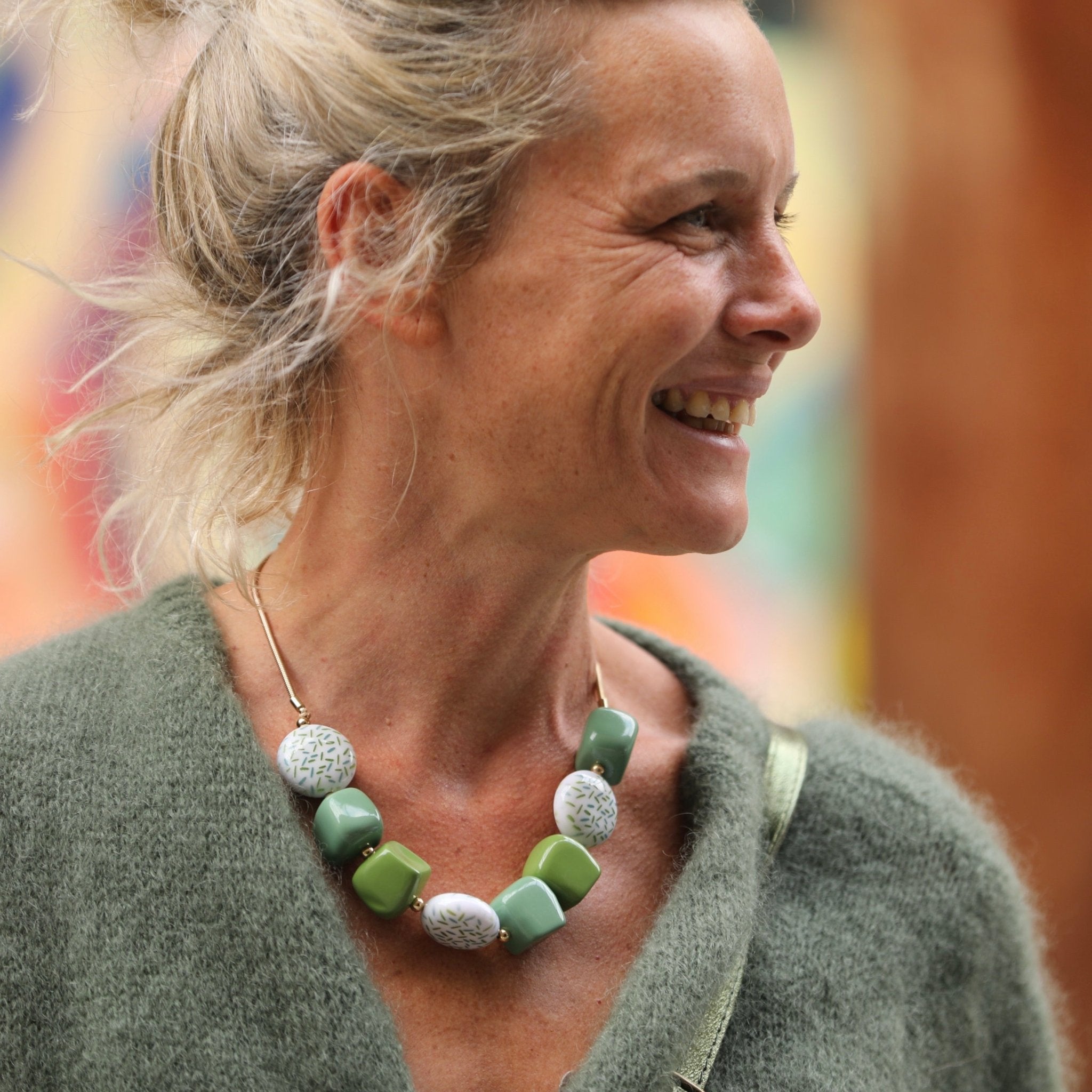 Le collier Aurore associe des perles en résine aux formes carrées et arrondies, dans de subtils tons de vert et blanc, rythmées de petites perlettes dorées.